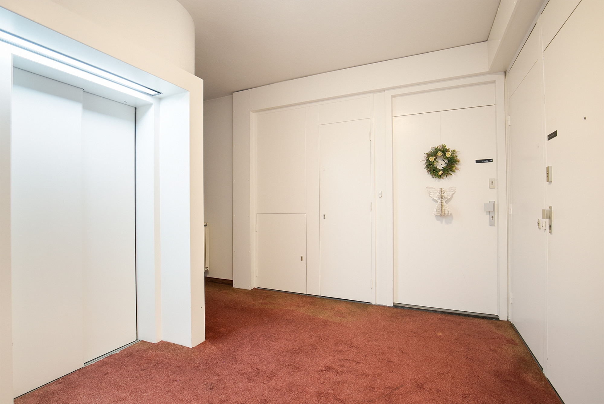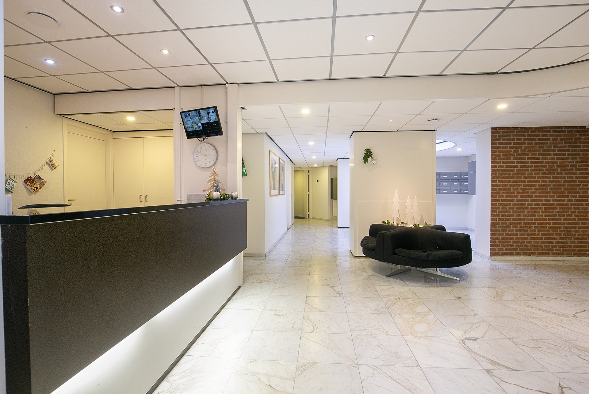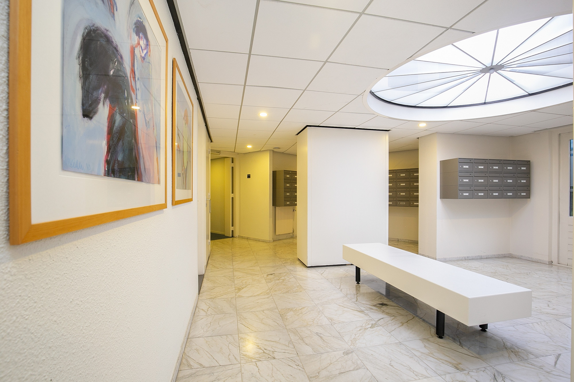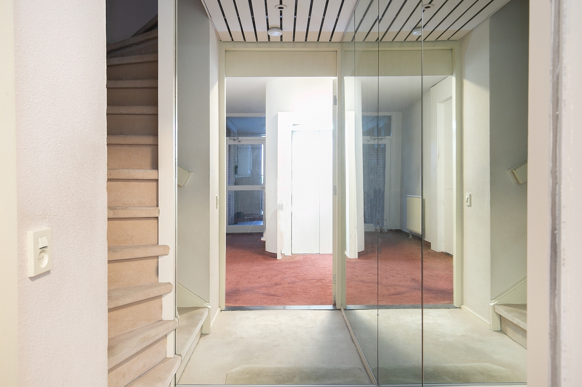 Hal met spiegelwand en trapopgang naar de zevende verdieping.