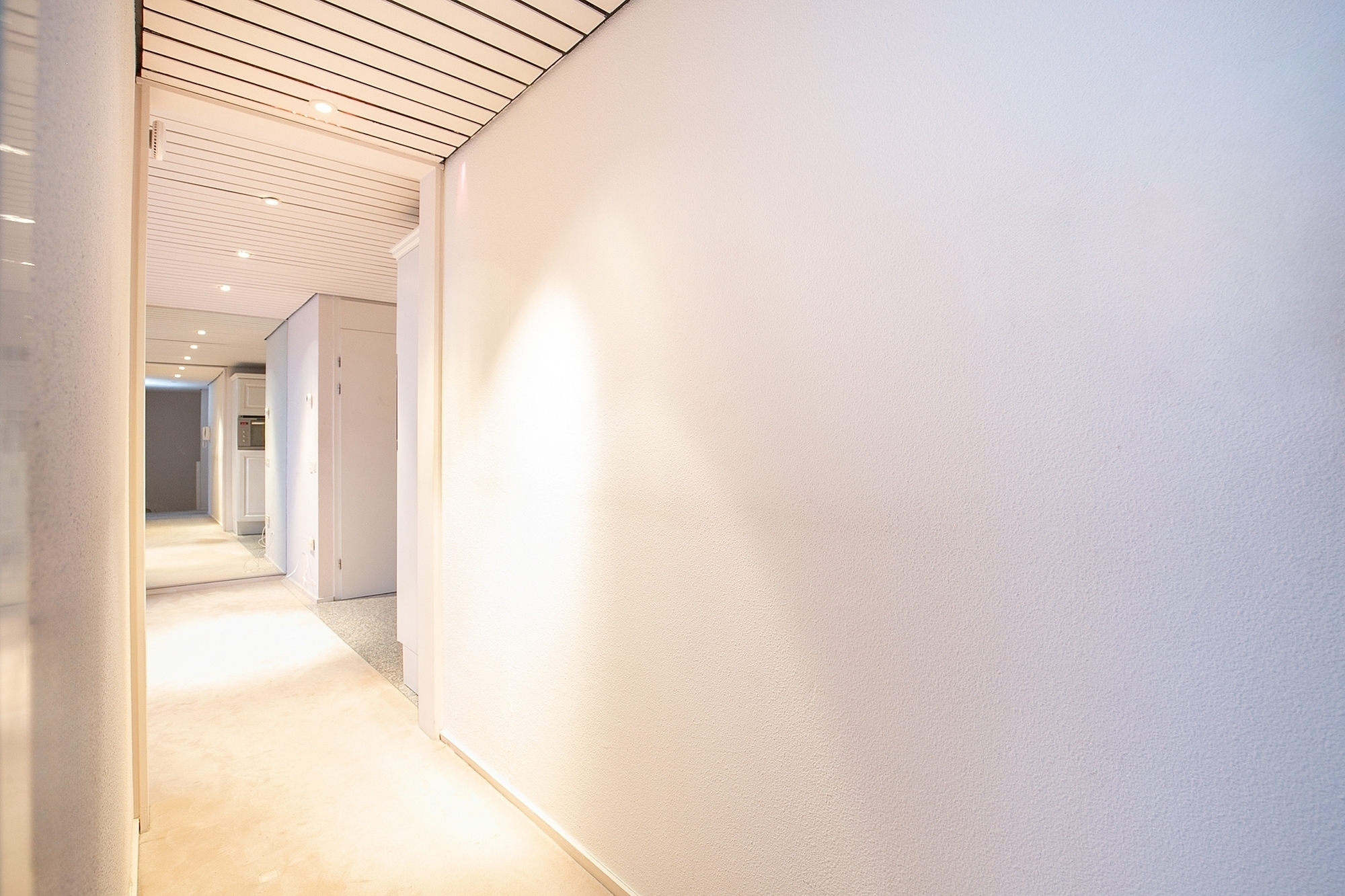 Overloop met toegang naar alle vertrekken van het appartement. De woonkamer (17m²) is de plek waar u kan genieten van het uitzicht over de bruisende stad Maastricht met de Hoge Brug, Sint Martinuskerk en de Sint Servaasbrug. De woonkamer geeft toegang tot de open keuken en het royale dakterras middels schuifpui.