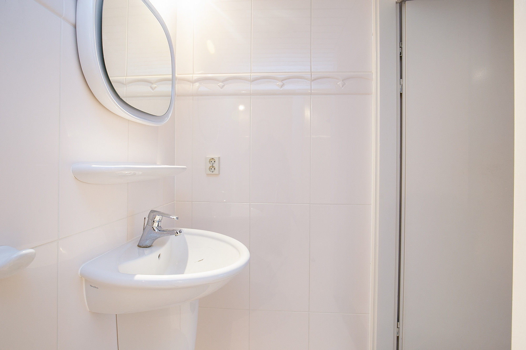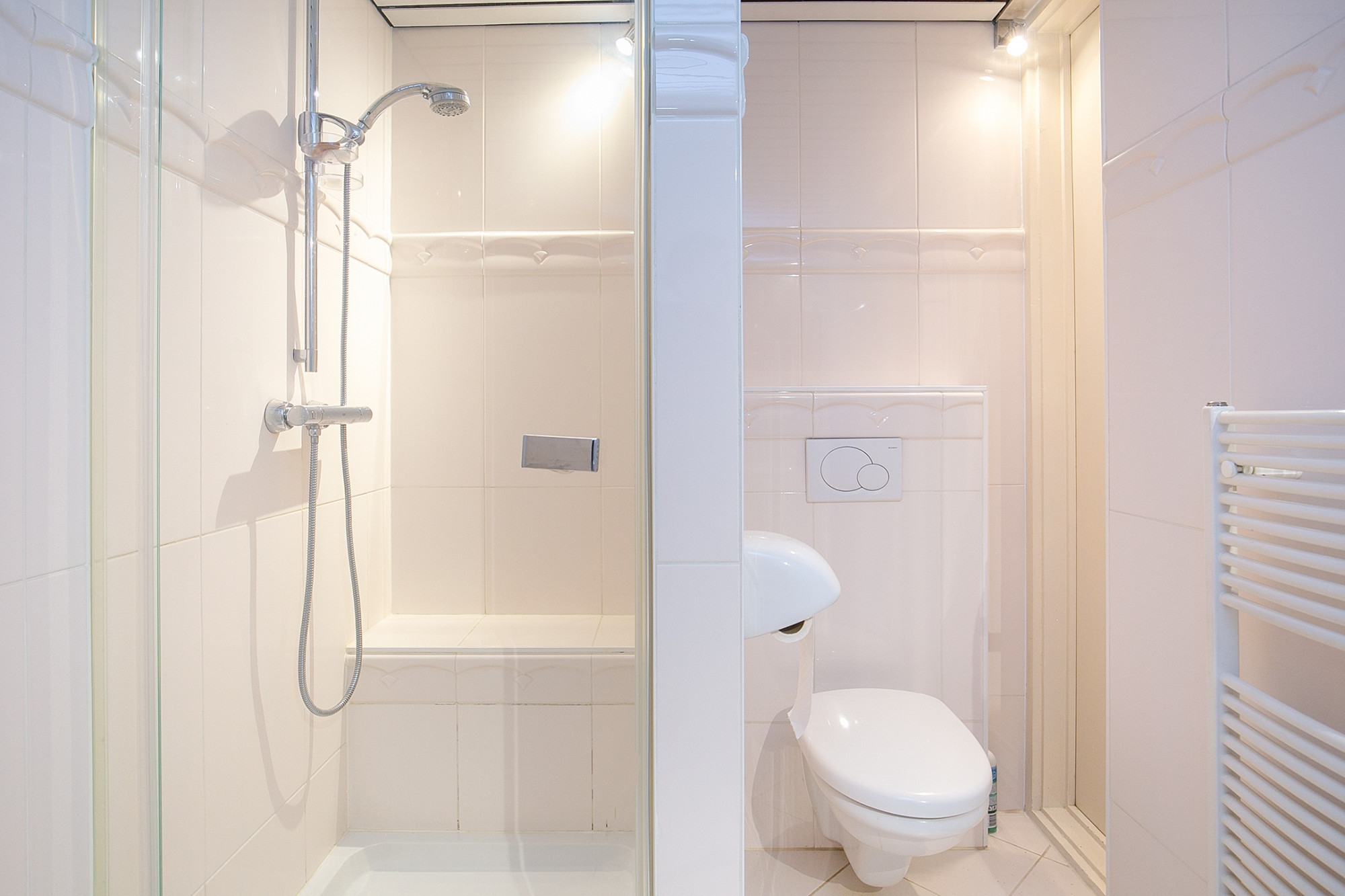 Tegenover de slaapkamer is de geheel betegelde badkamer (5m²) gelegen die uitgerust is met een douche, vaste wastafel en een wandcloset.