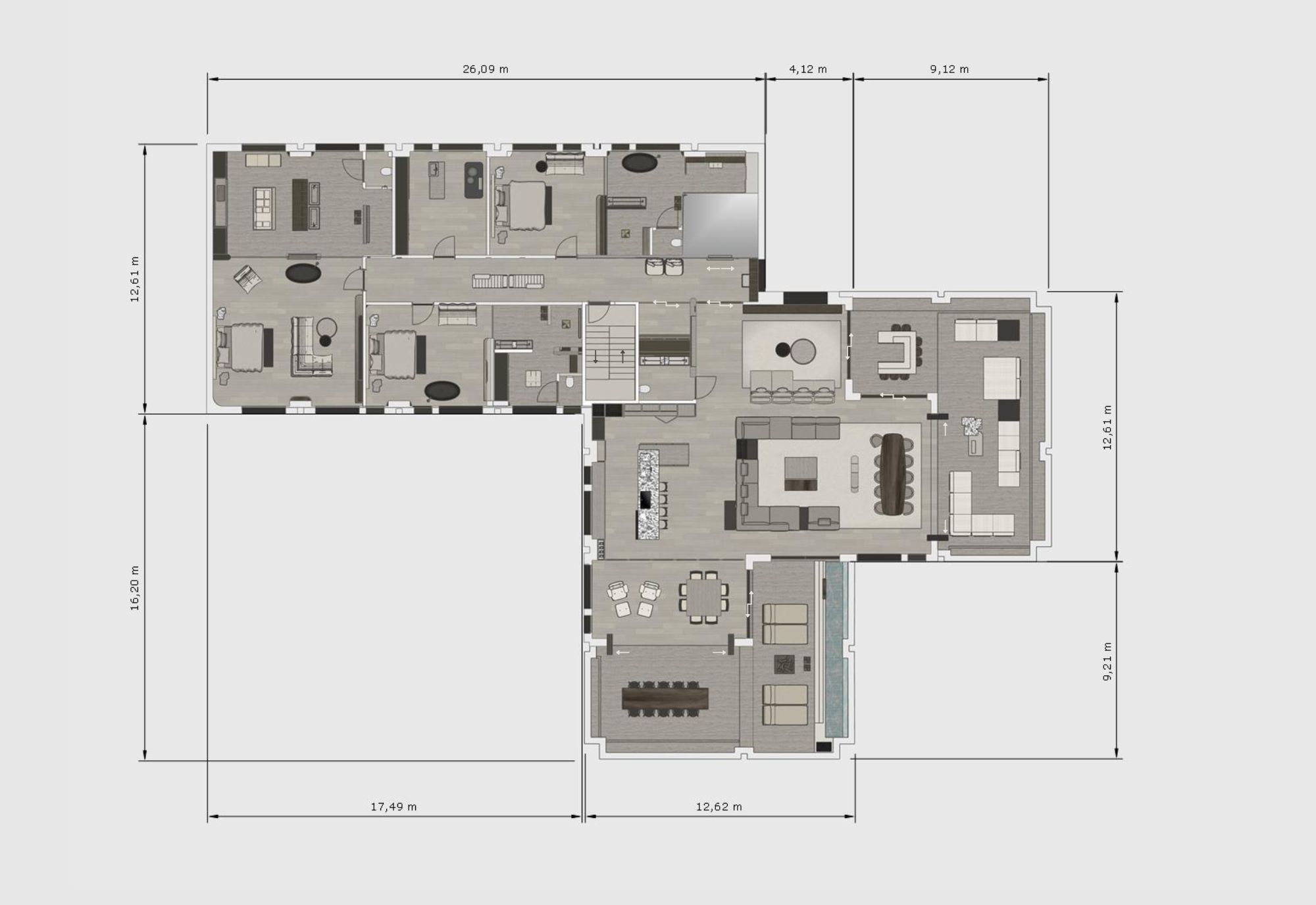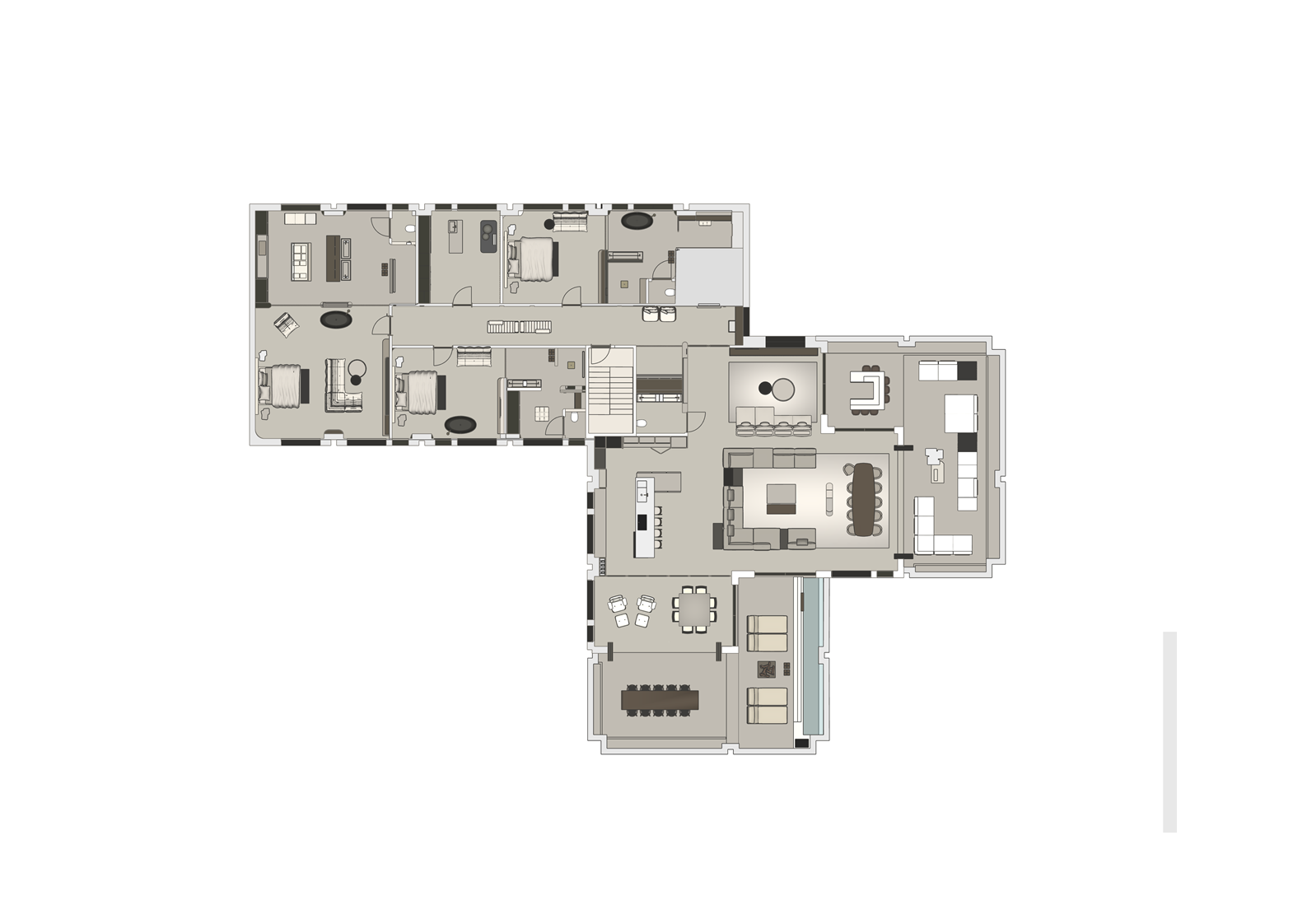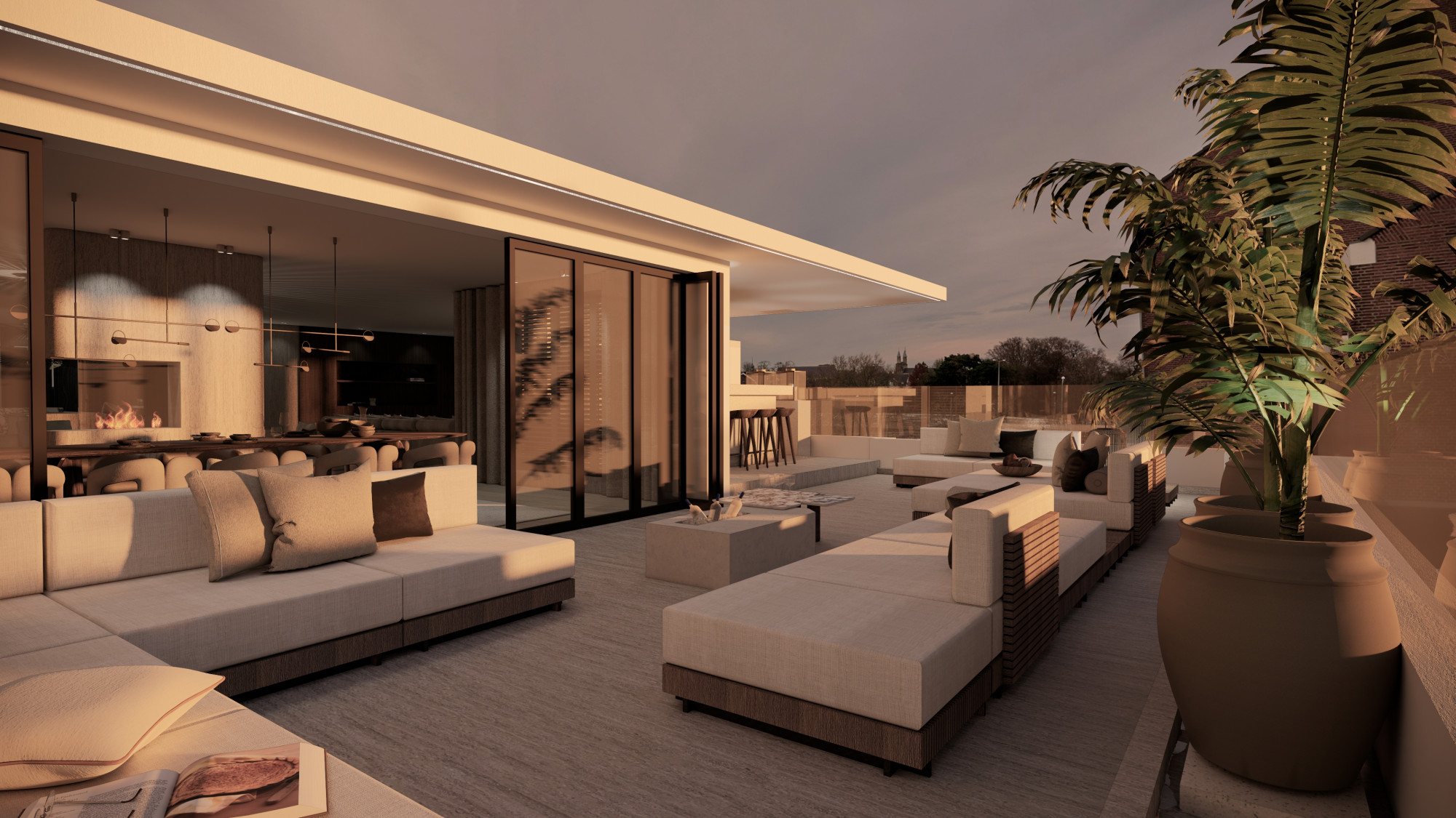 Dit penthouse wordt gerealiseerd op de 5e verdieping en wordt ruim 440 m² met een terras van ca. 75 m² op het westen en een terras van ca. 75 m² op het zuiden. Beide terrassen bieden zicht op de Maas richting Wyck.