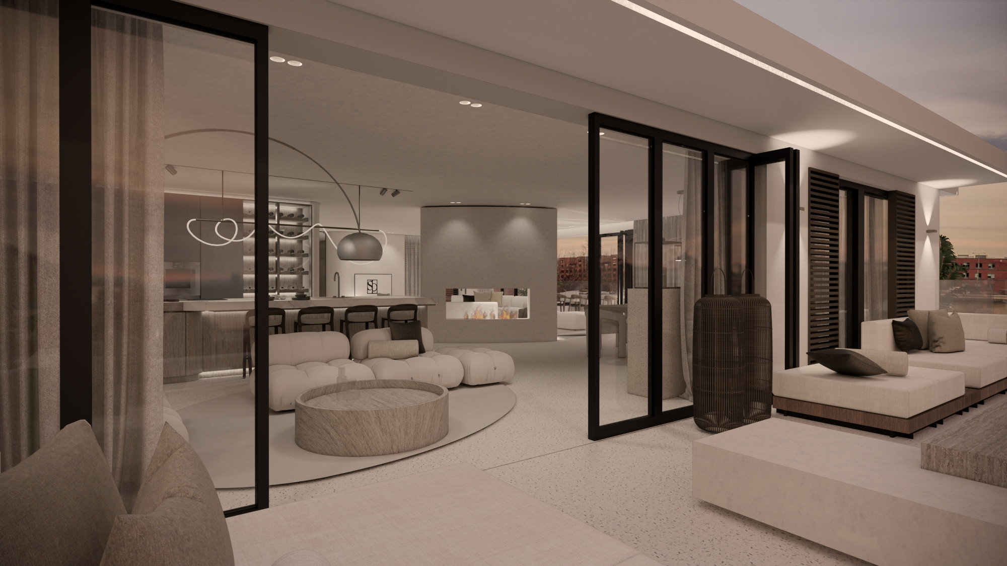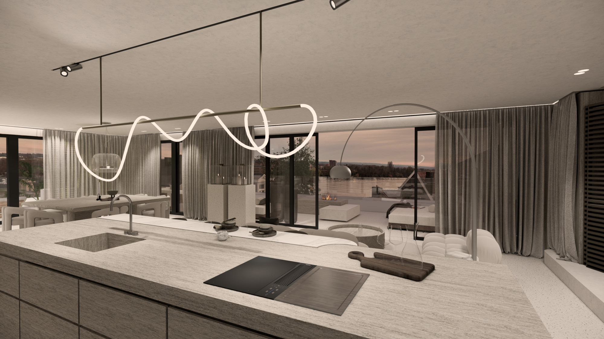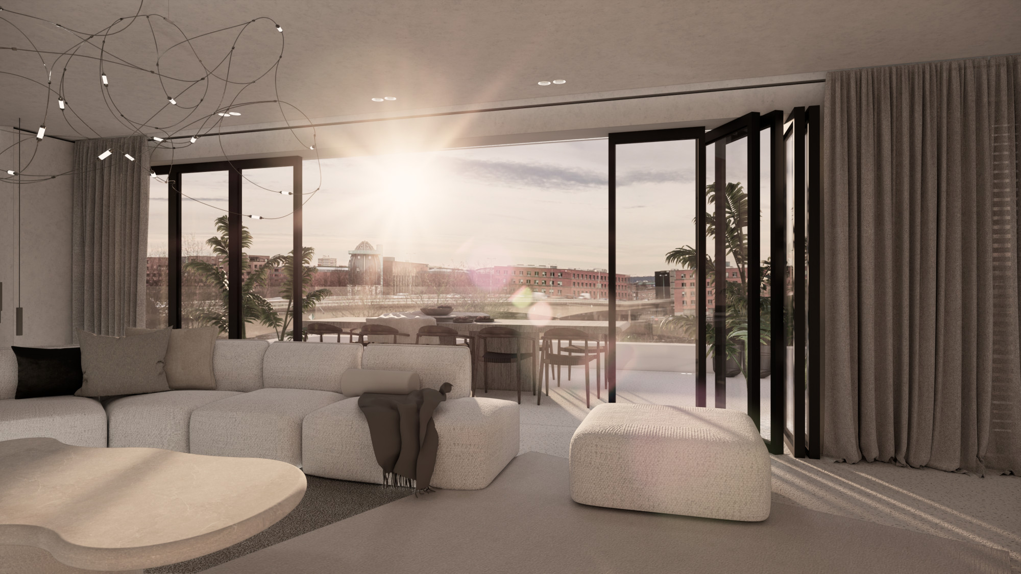 Dit penthouse wordt gerealiseerd op de 5e verdieping en wordt ruim 440 m² met een terras van ca. 75 m² op het westen en een terras van ca. 75 m² op het zuiden. Beide terrassen bieden zicht op de Maas richting Wyck.