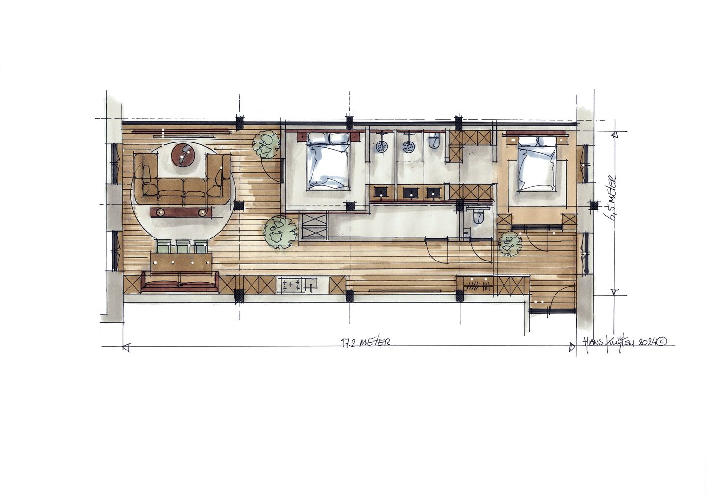 Dit appartement heeft 2 slaapkamers en 2 badkamers. De grootste slaapkamer heeft een inloopkast en een badkamer ensuite met een douche, een dubbele wastafel en een toilet. De tweede slaapkamer heeft eveneens een badkamer ensuite met een douche en een wastafel. Op de gang bevindt zich het gastentoilet.