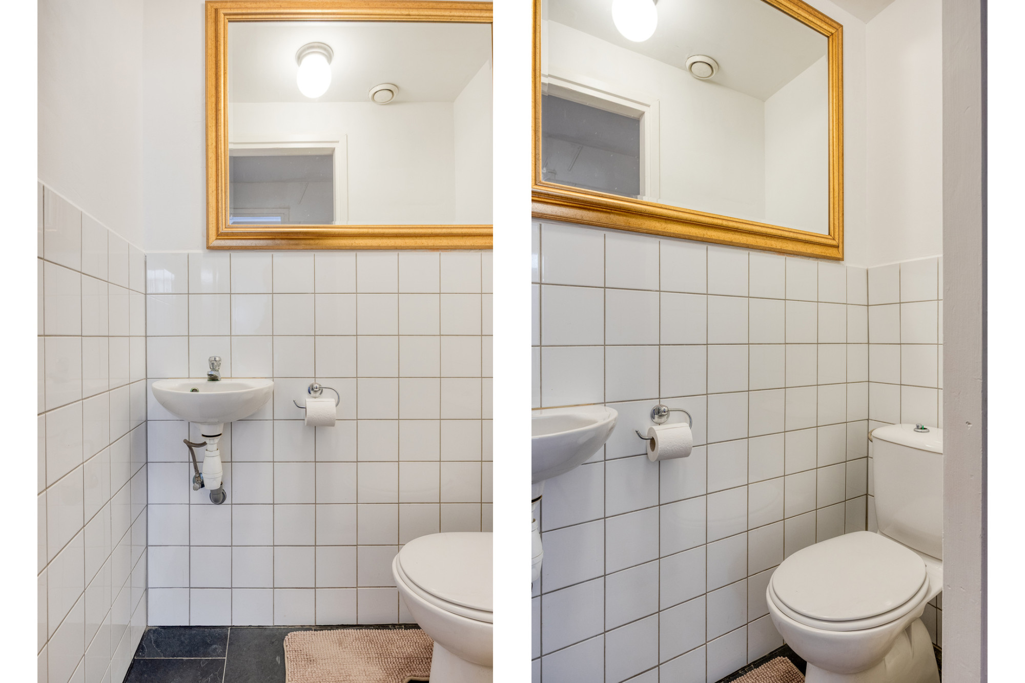 - Betegelde toiletruimte met staand closet en fonteintje.