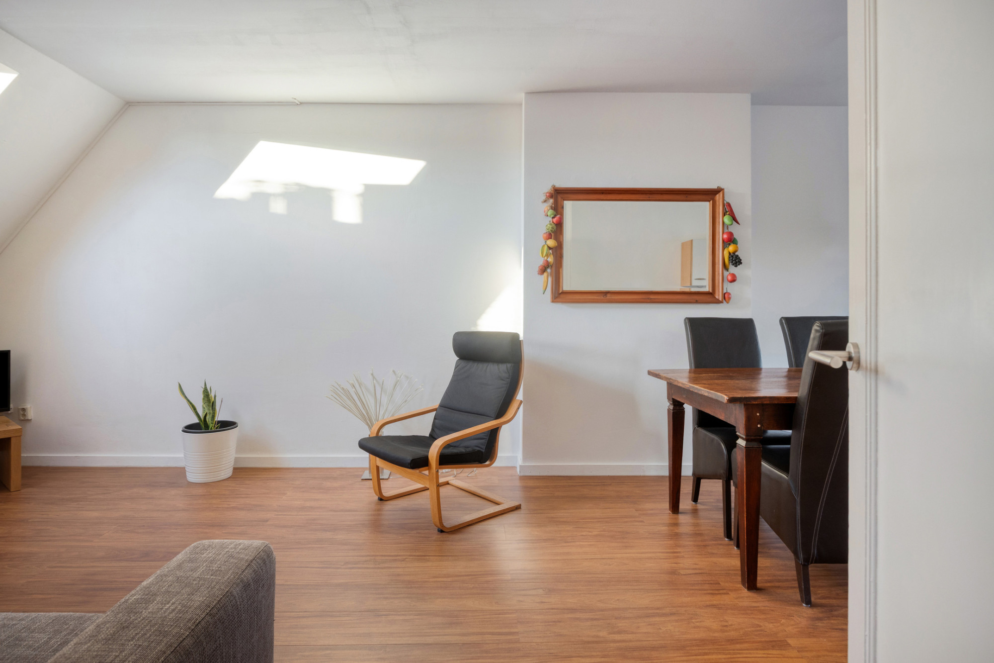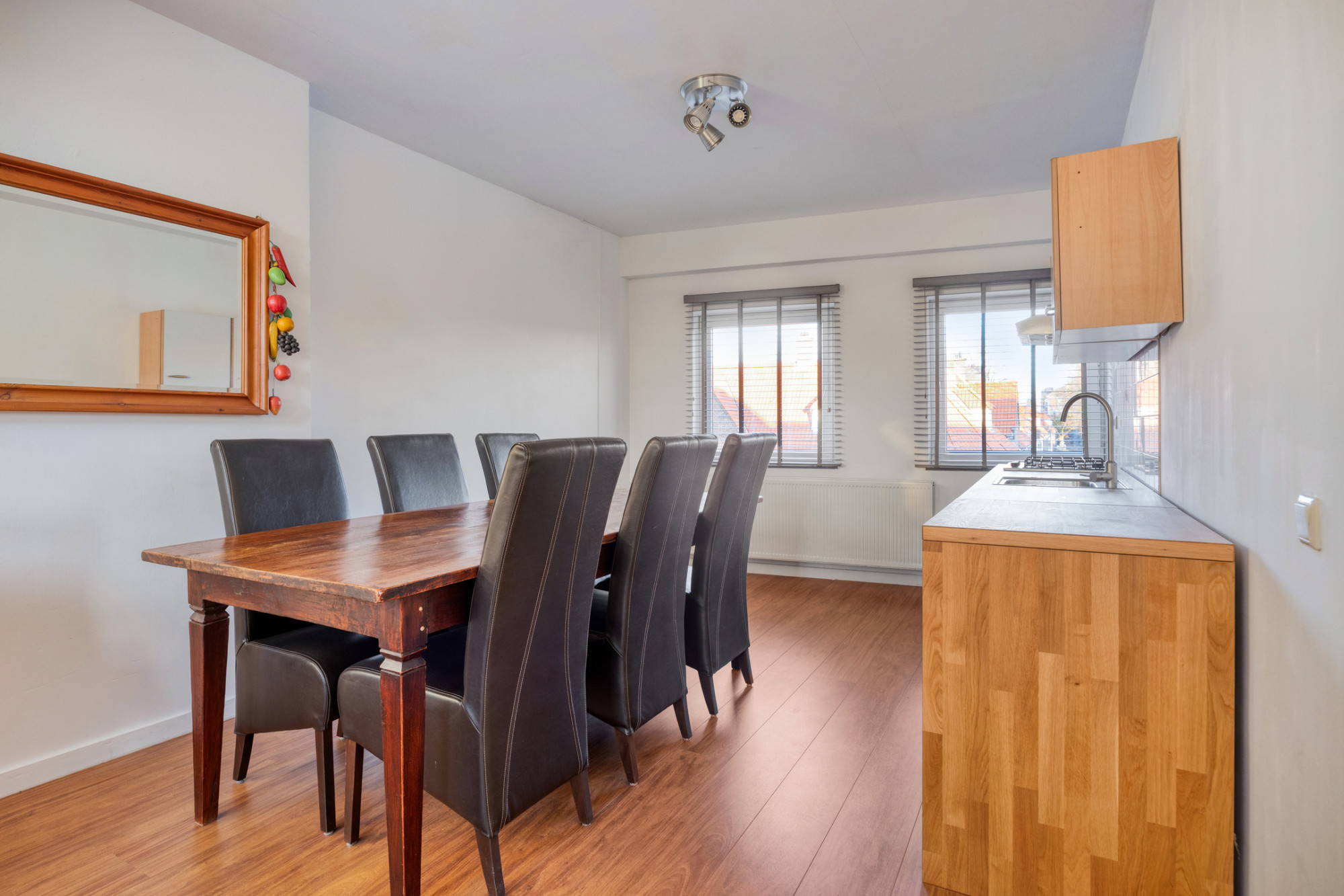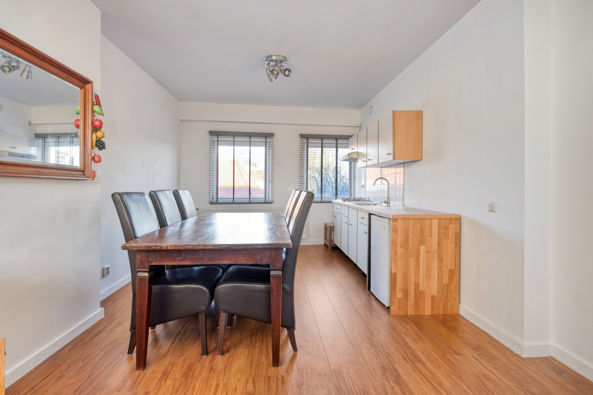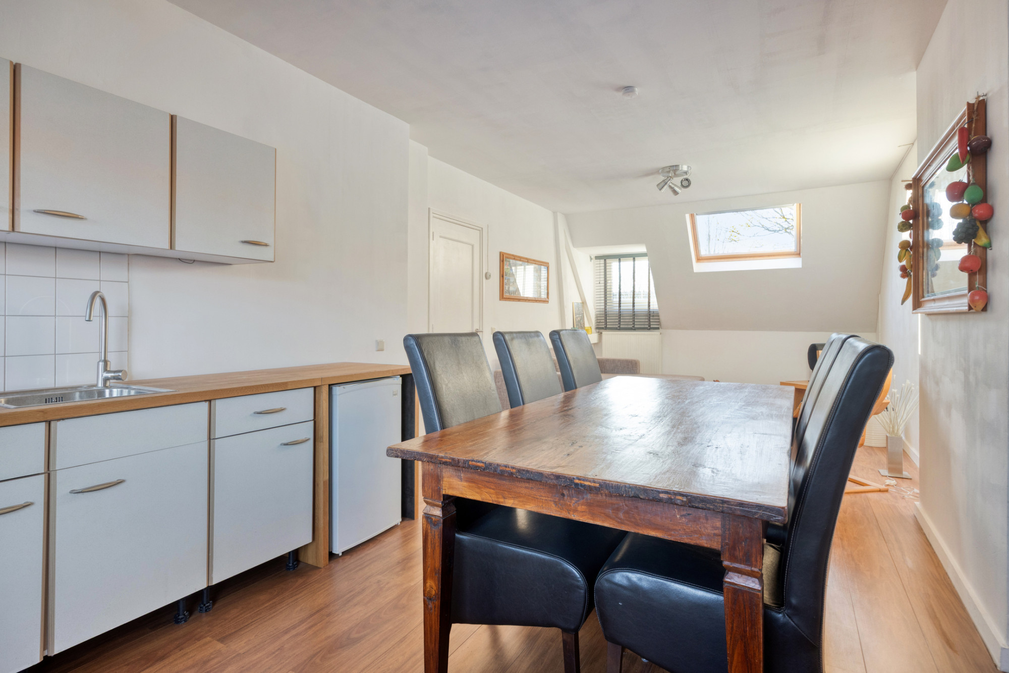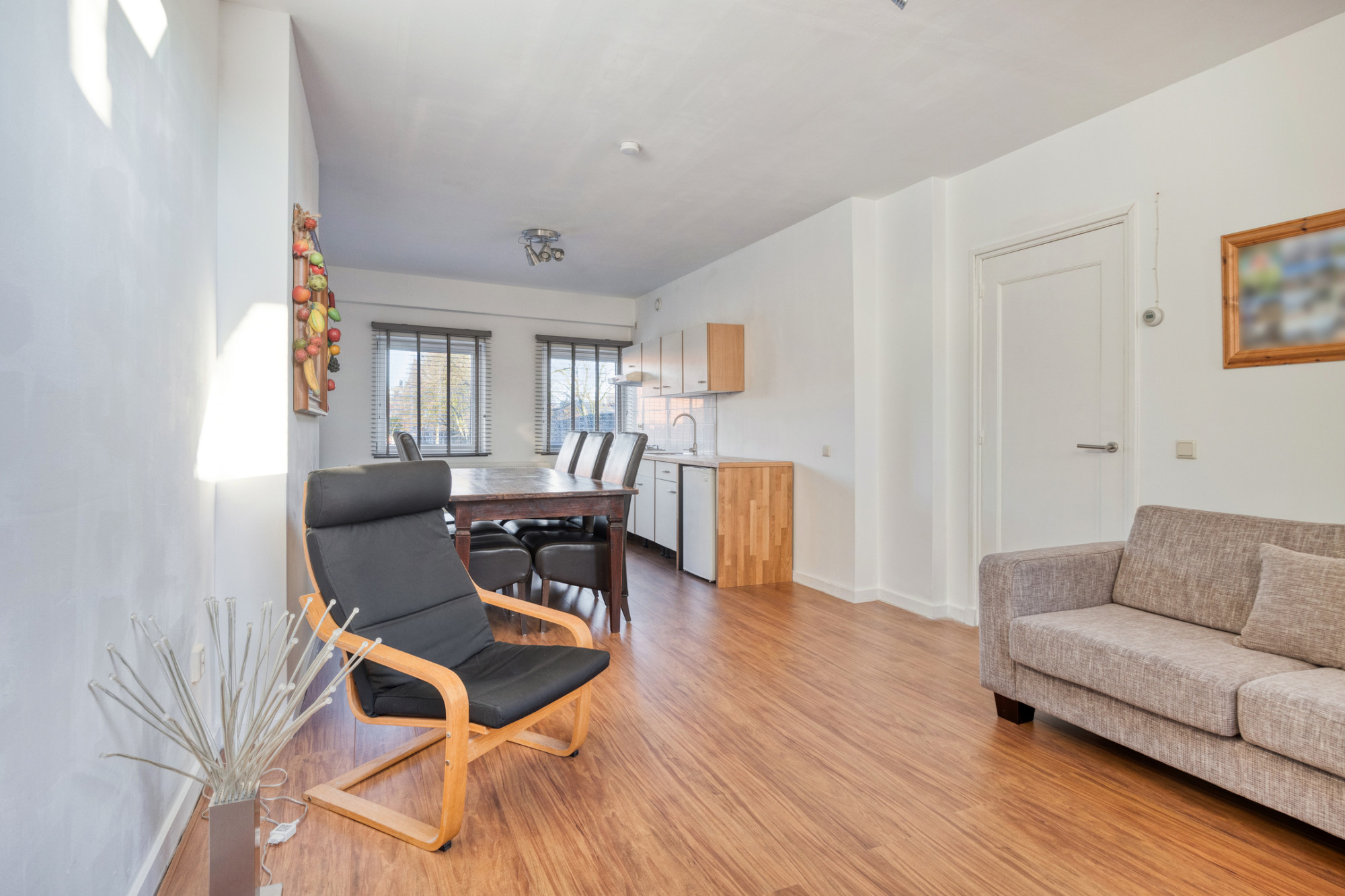 - Doorzon woonkamer met open keuken, totaal ca. 31 m² met veel lichtinval door de grote raampartijen aan weerszijde en voorzien van een nette laminaatvloer.