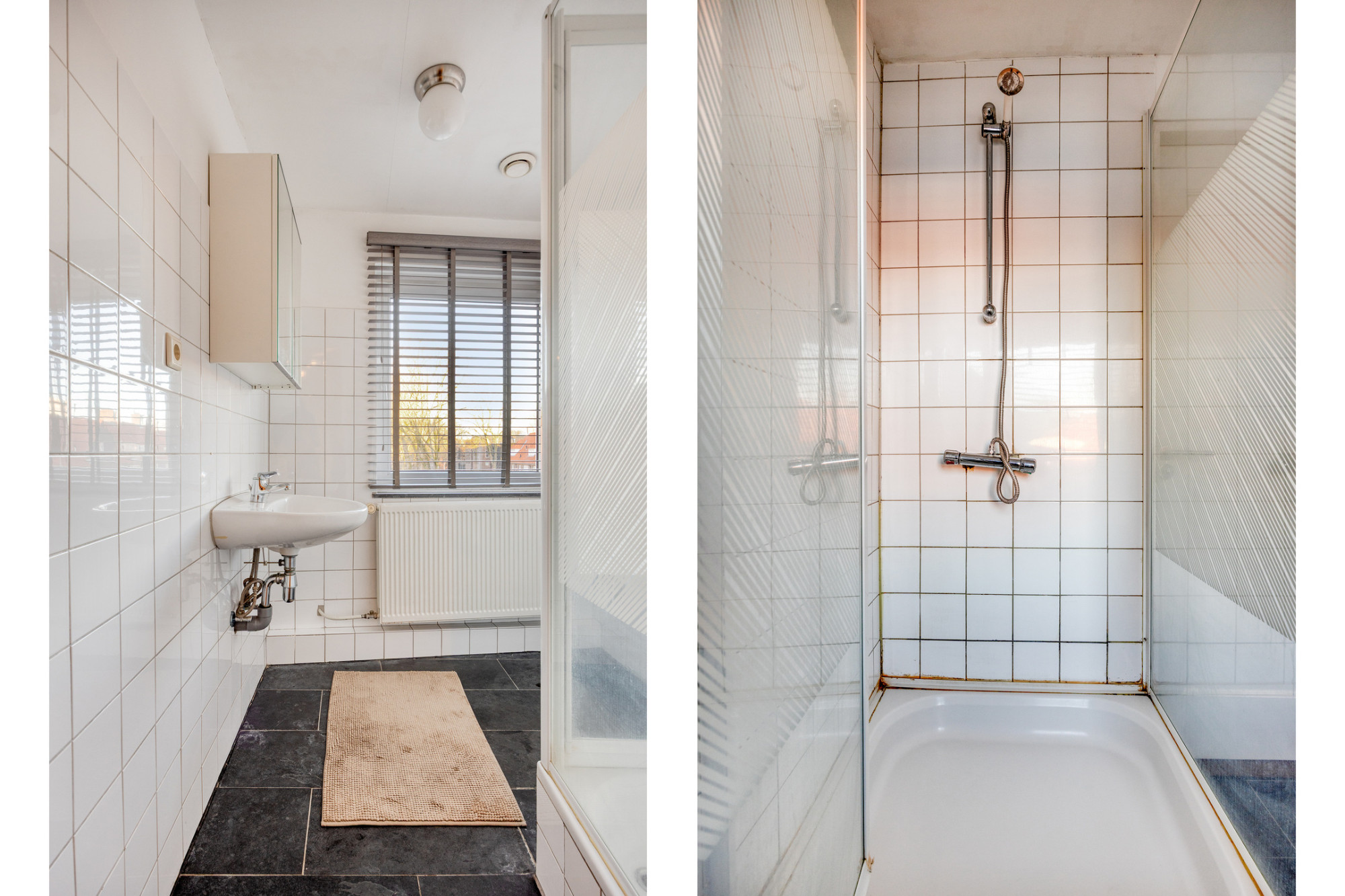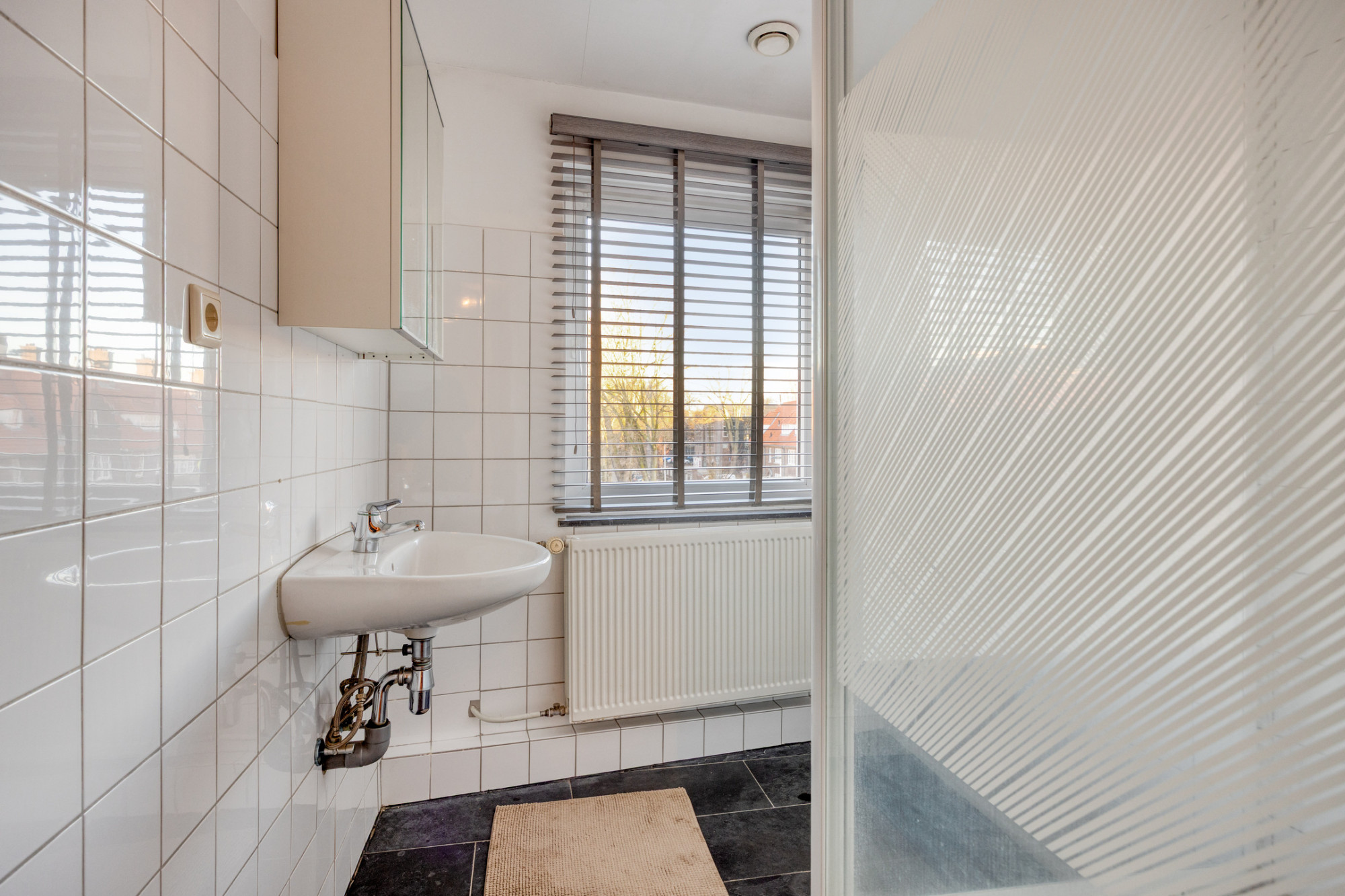 - Keurige badkamer met douche en wastafel.