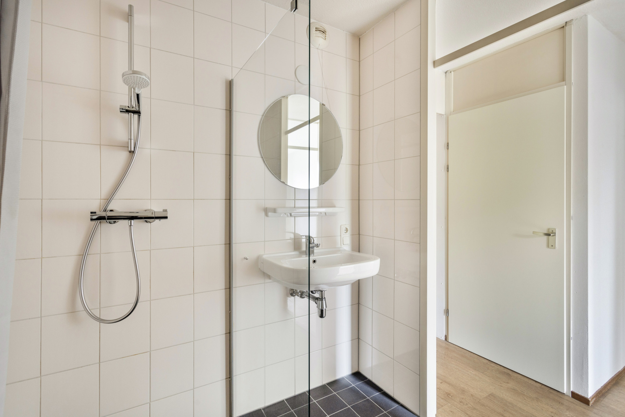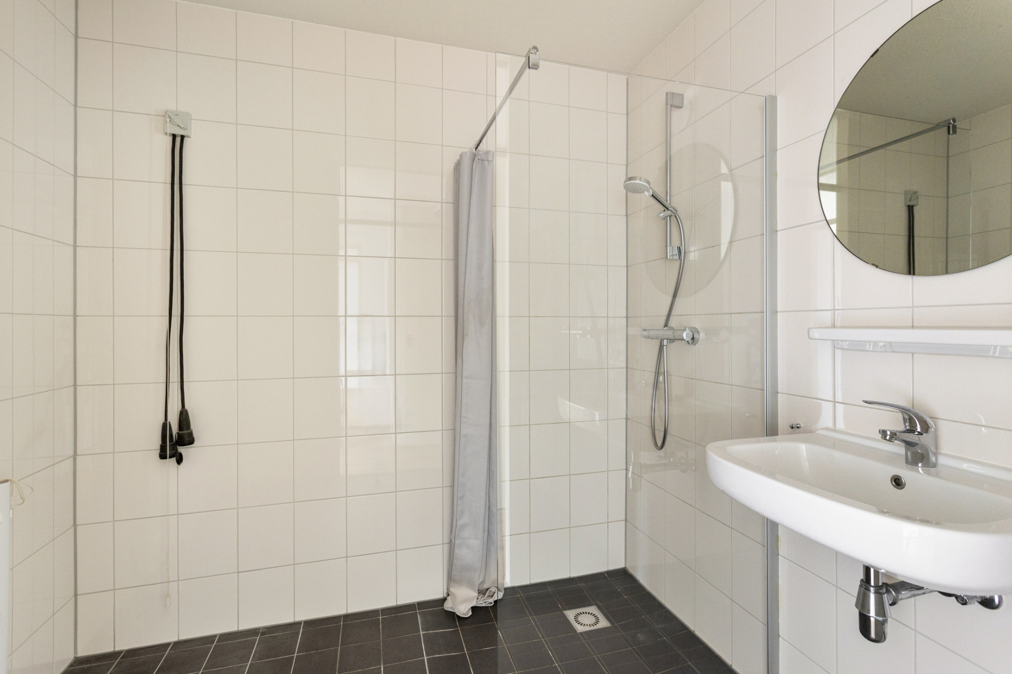 De badkamer (4 m2) is geheel betegeld en voorzien van een vaste wastafel, douche en ruim voldoende plek voor de wasmachine en droger.