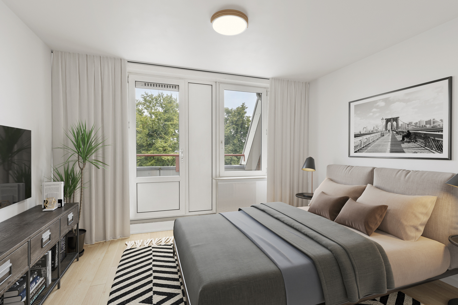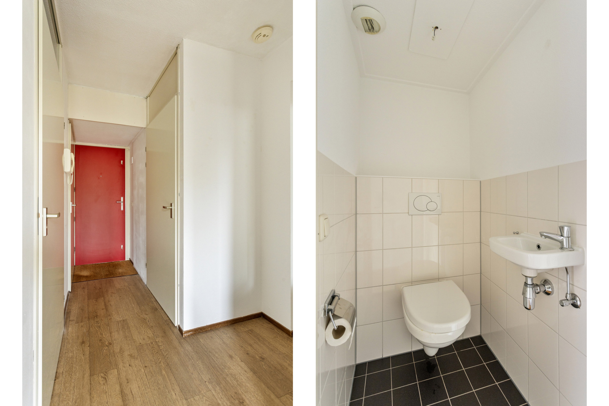 U betreedt de woning in de hal waar bij binnenkomst met aan de rechterzijde de badkamer, de aparte toiletruimte en rechtdoor de ruime slaapkamer ruime slaapkamers (12 m²), grenzend aan het balkon. Verder is er in de hal nog een berging waar ook de cv-ketel is opgesteld.