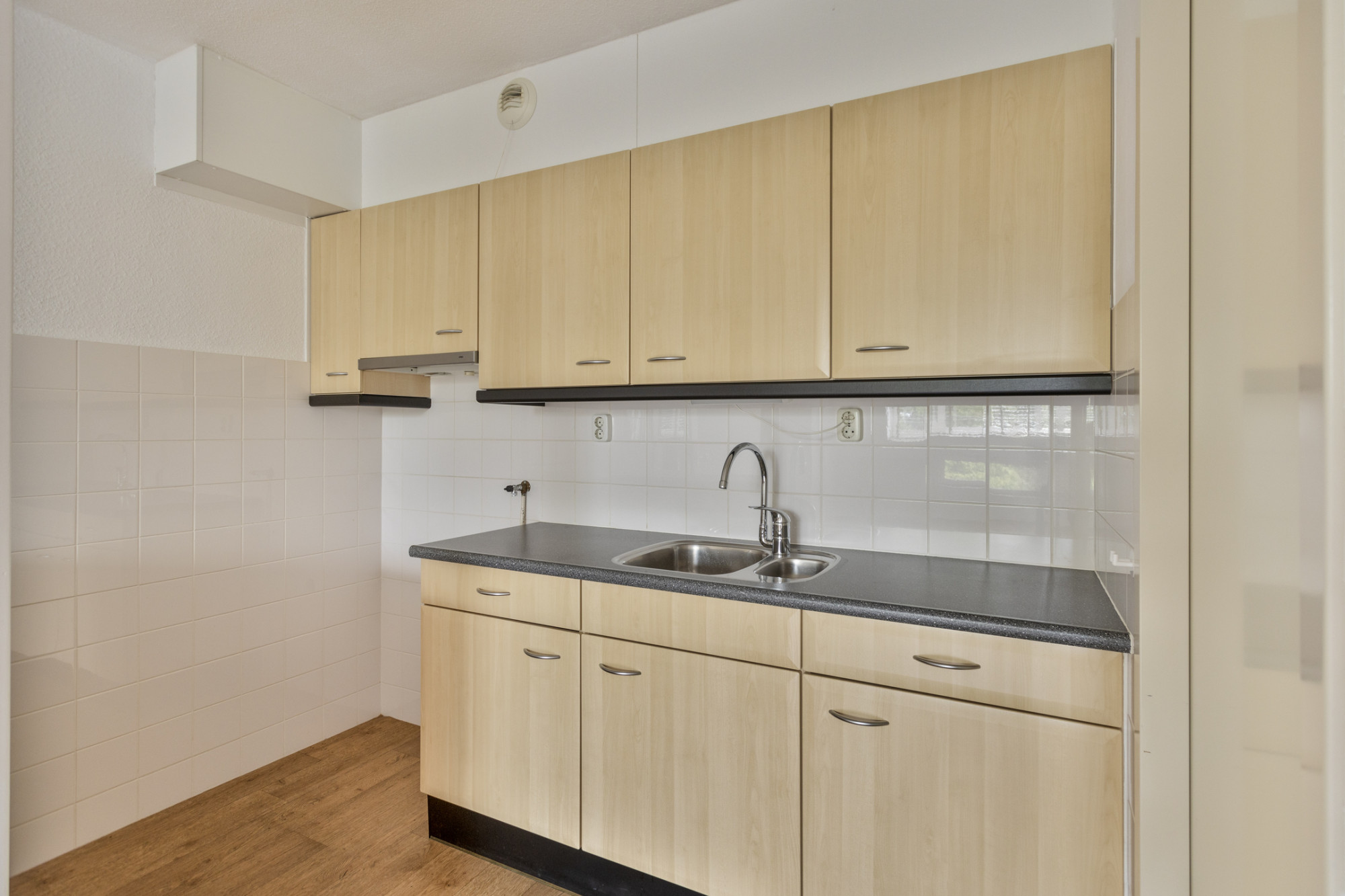 De woonkamer heeft een oppervlakte van maar liefst 27 m². De verscholen keuken is voorzien van een eenvoudige maar nette keukeninrichting. Direct aan deze keuken grenst nog een ruime berging/bijkeuken. Het balkon is bereikbaar van de woning. Hier heb je een mooi vrij uitzicht over de groene omgeving!