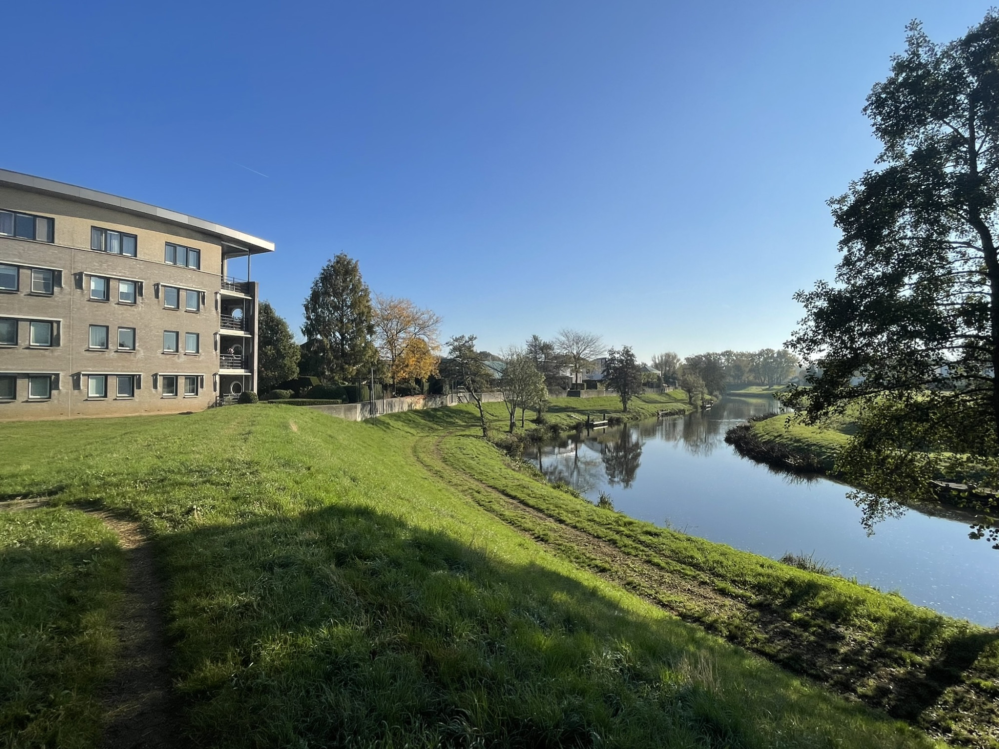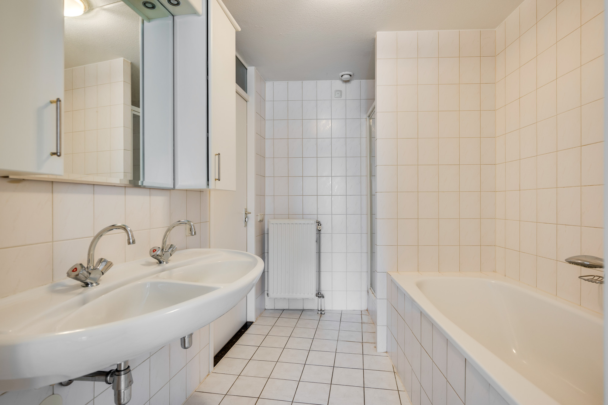 De badkamer is geheel betegeld en is voorzien van een ligbad, douche en dubbele wastafel. Een plek om heerlijk te ontspannen. Via de badkamer betreedt u direct de eerste slaapkamer met fijn uitzicht over het groen nabij de Roer aan de rustige achterzijde van het complex, ideaal voor comfort en gemak.