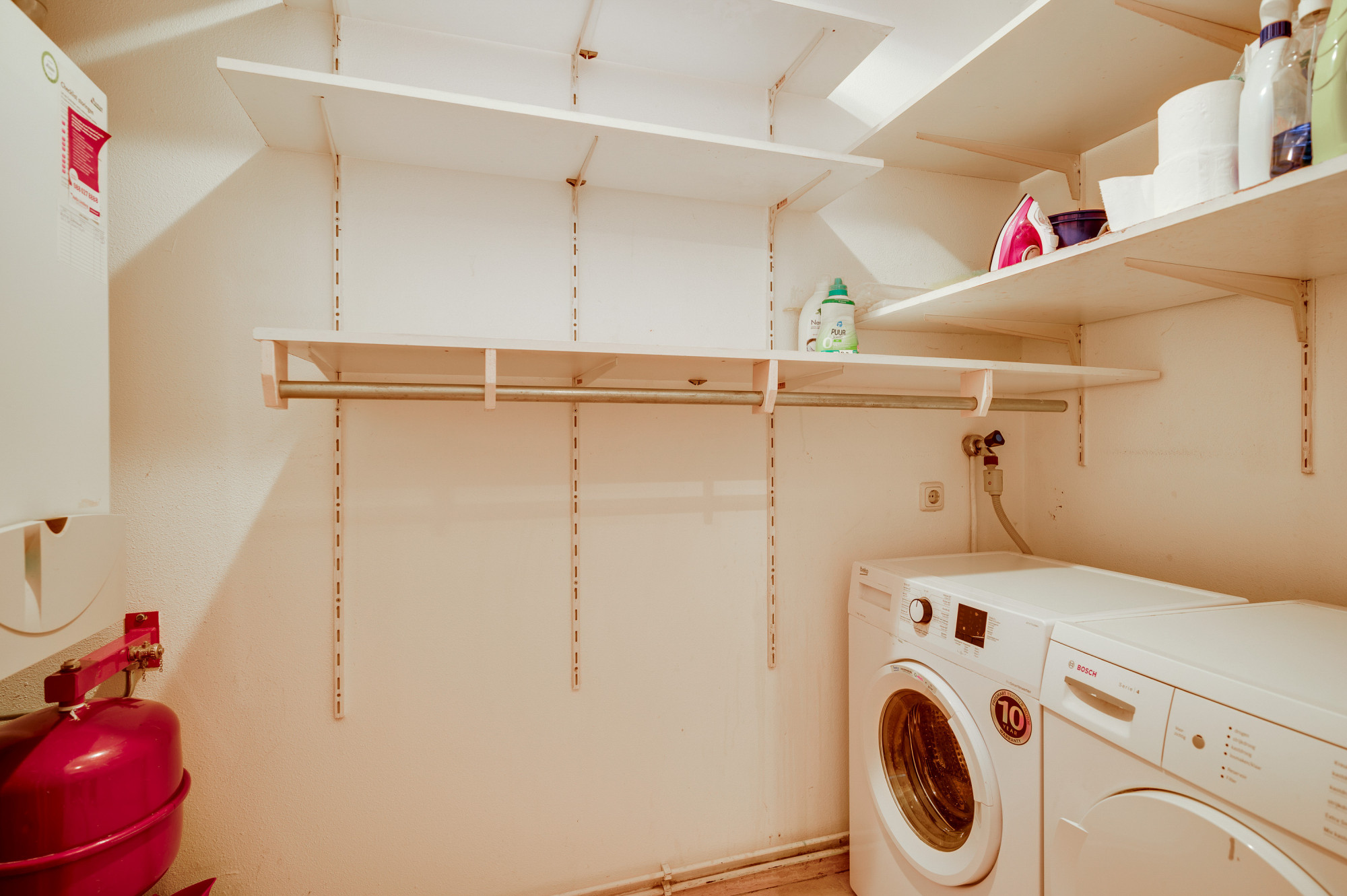 Zodra u binnenstapt, voelt u de fijne sfeer en de praktische indeling van dit appartement. De hal geeft toegang tot alle vertrekken, inclusief een separaat toilet met fonteintje. Een handige berging met wasmachine- en droger aansluitingen maakt het huishouden eenvoudiger, en de aanwezige CV-ketel (Bosch HR, eigendom, ca. 2008) maken het tot een praktisch geheel.