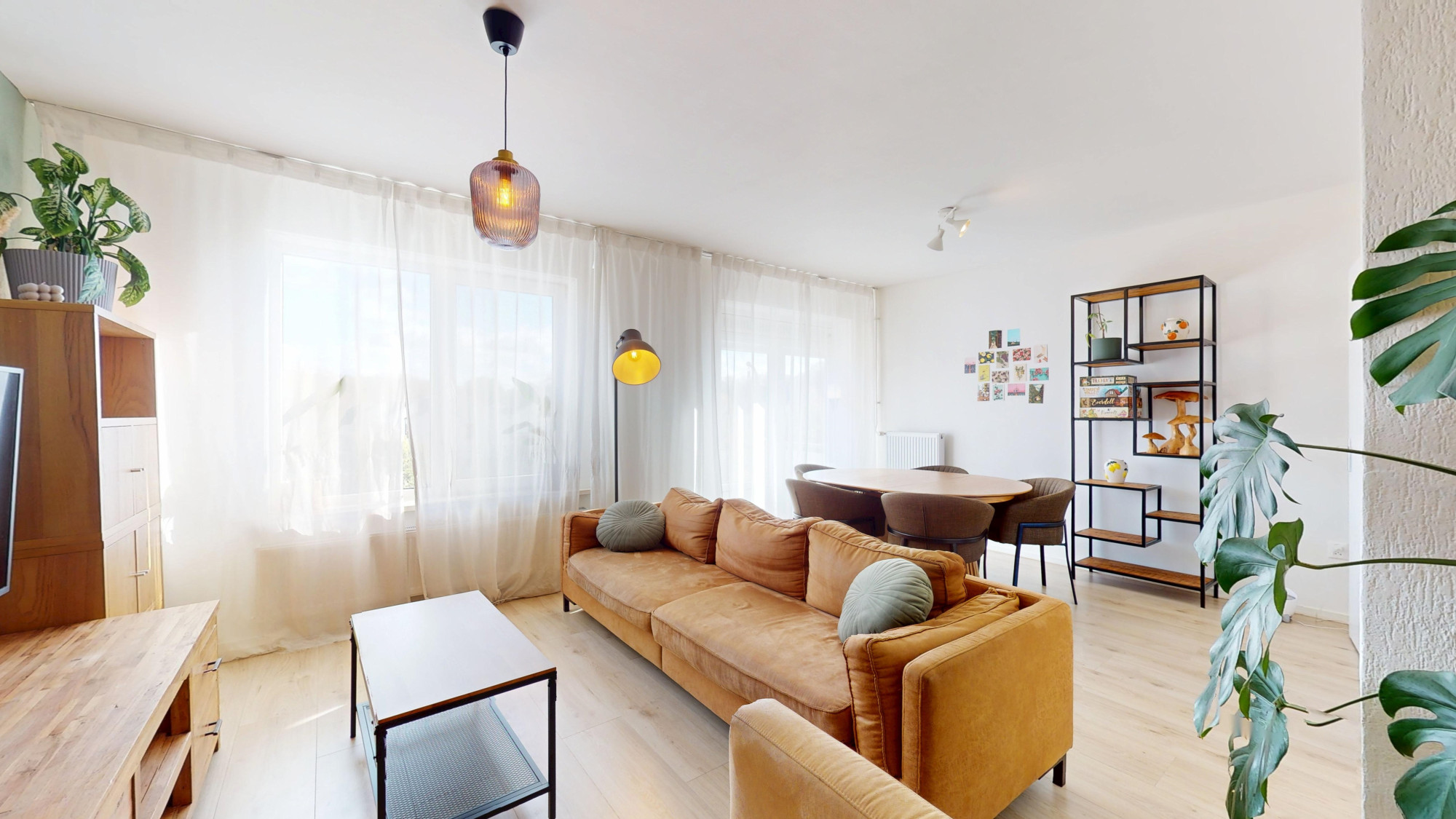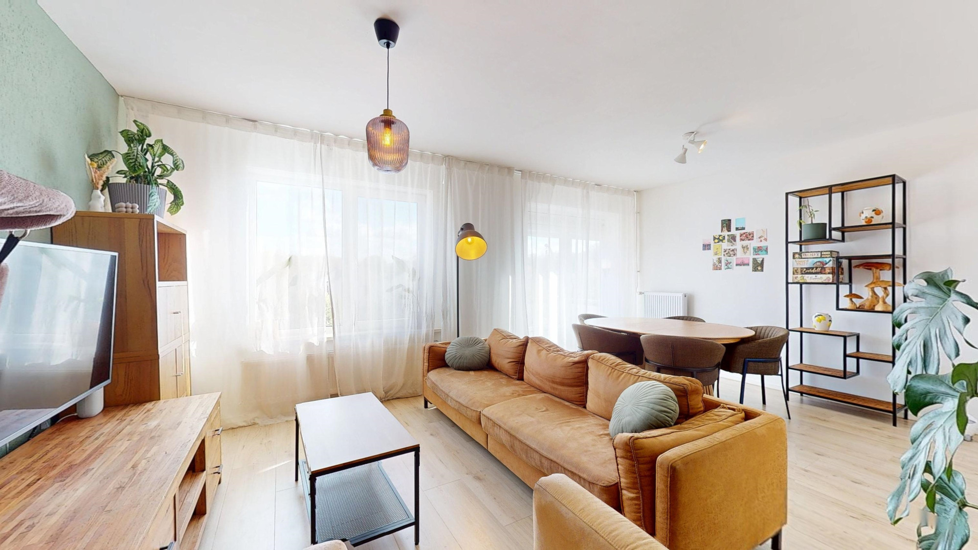 L-vormige woonkamer (5,8 x 4,95/3,55 m) v.v. laminaat en toegang tot balkon achterzijde gebouw (1,95 x 1,2 m).