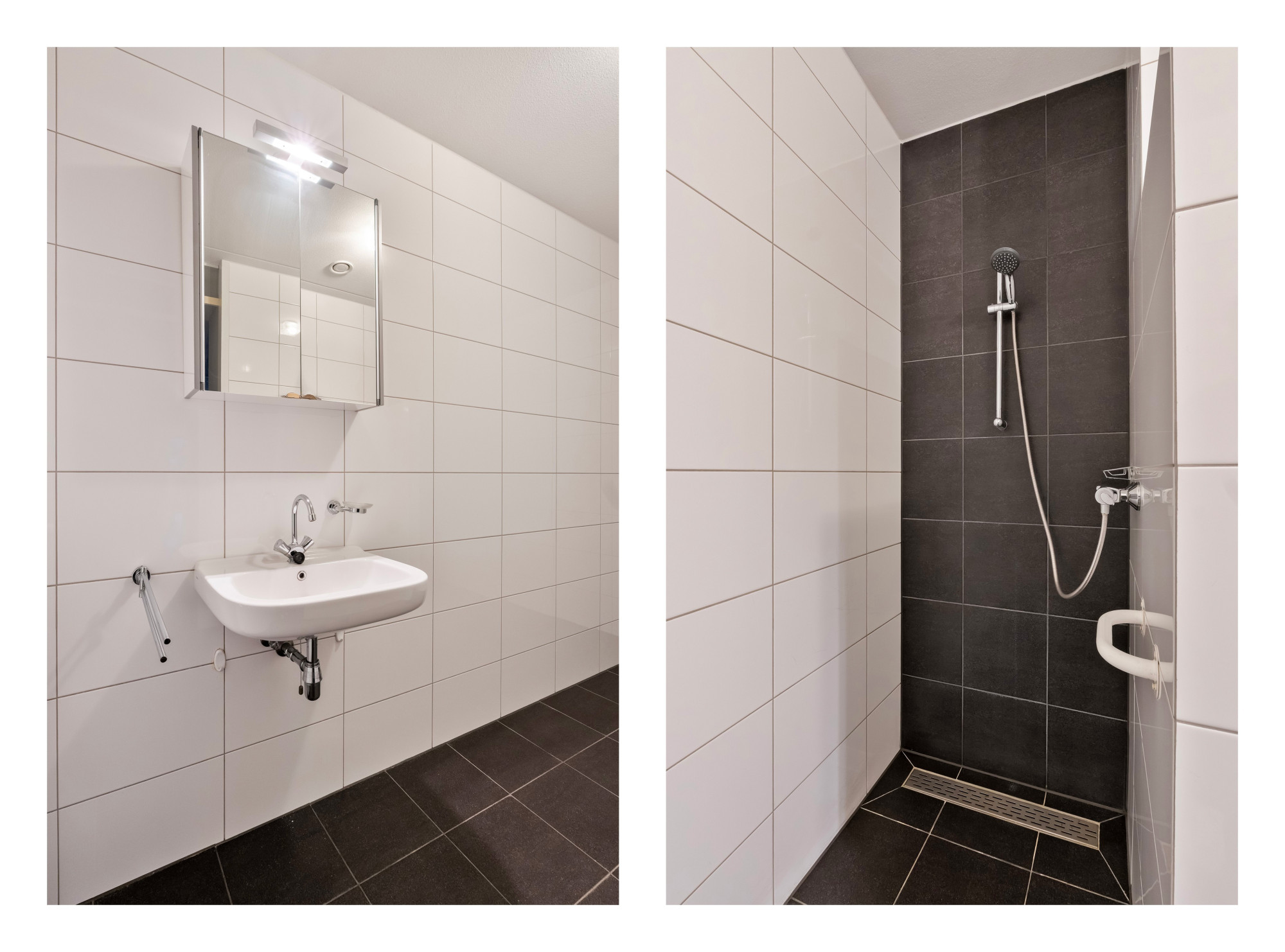 De ruime badkamer van circa 7 m2 is uitgerust met een douche voorzien van thermostatische kraan, een wastafel met mengkraan en een praktische spiegelkast. Verder beschikt de badkamer over mechanische ventilatie, een radiator en de afzuiging van het WTW-systeem, wat zorgt voor een aangenaam klimaat.