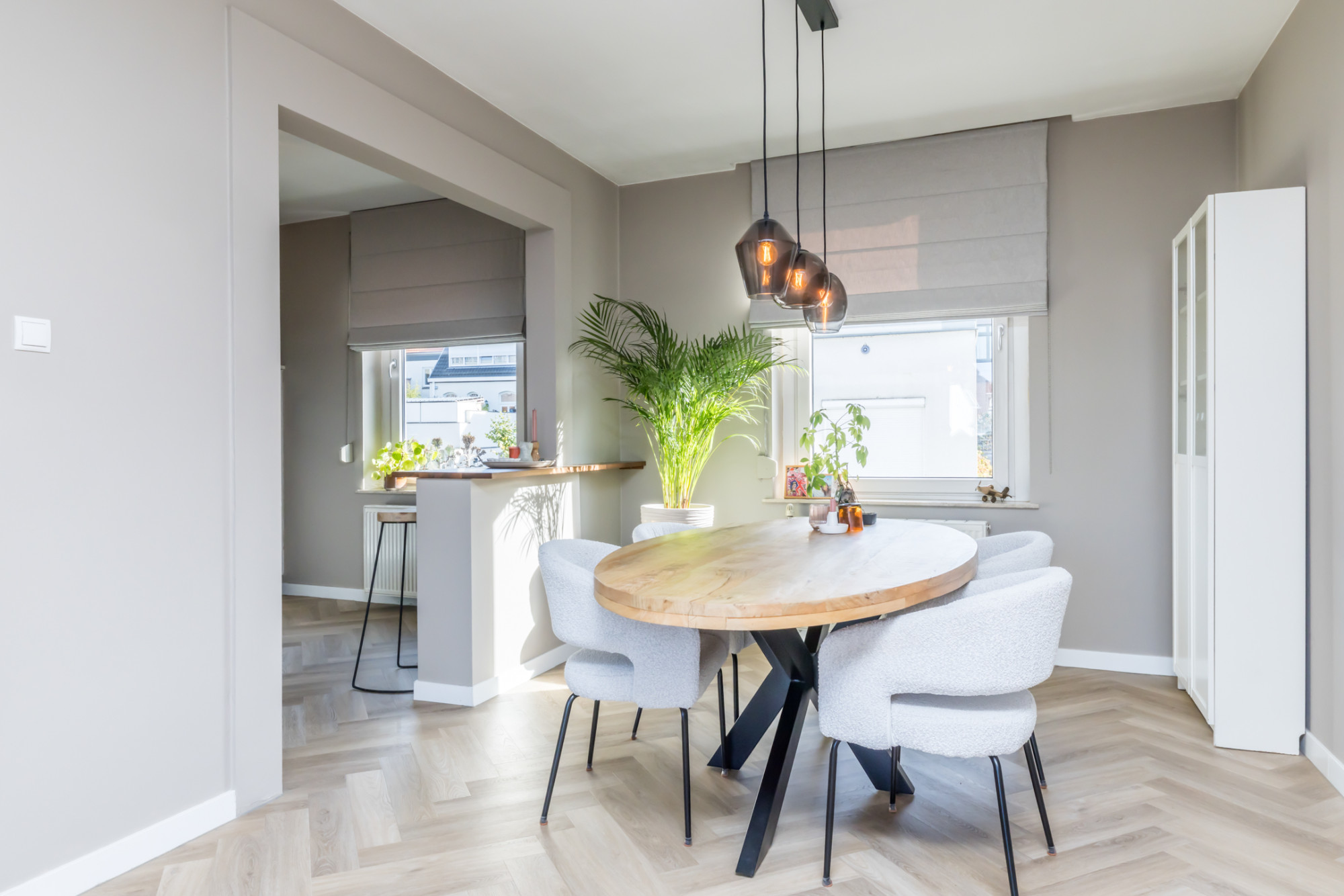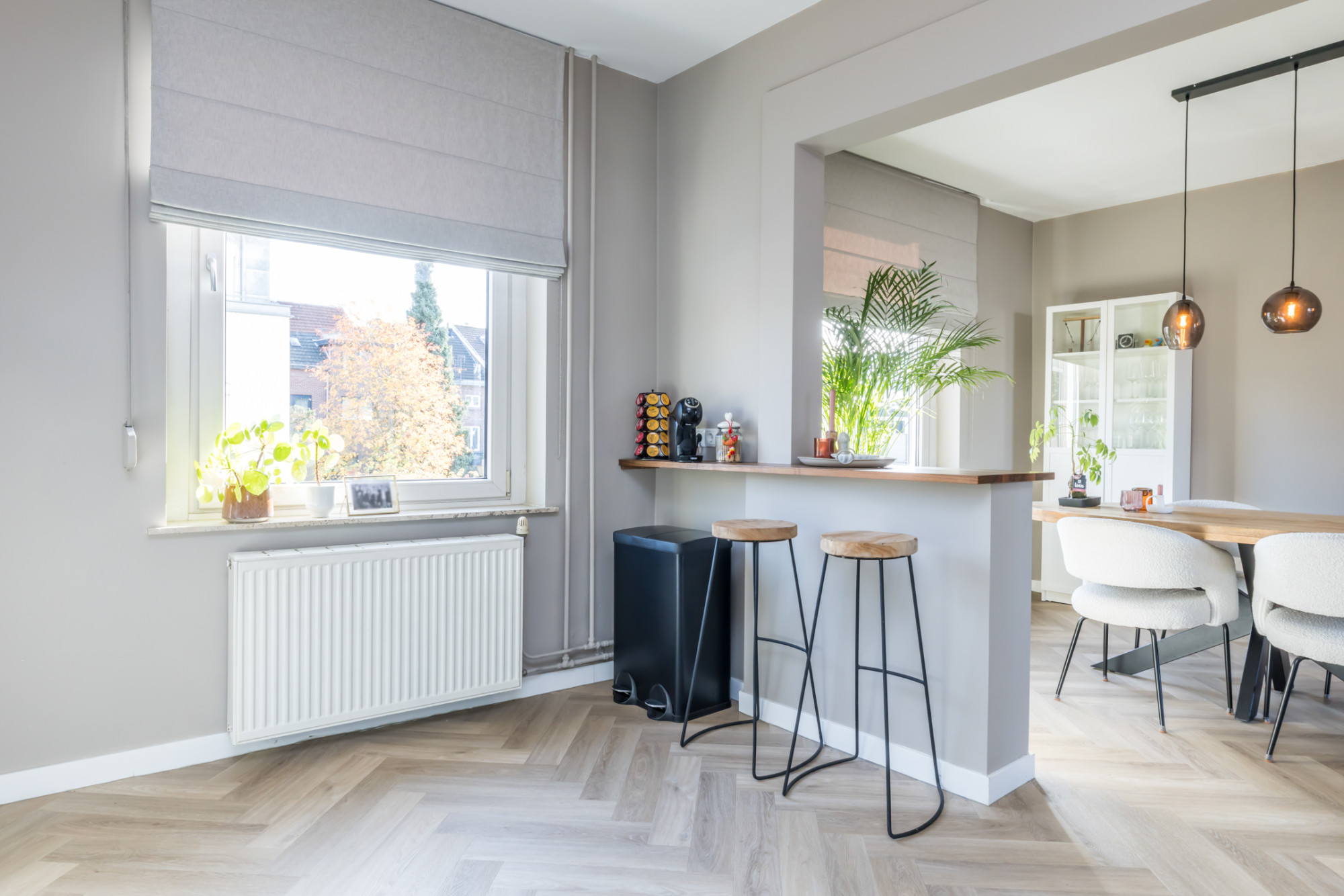 De woonkamer en keuken zijn voorzien van een visgraad PVC-vloer.