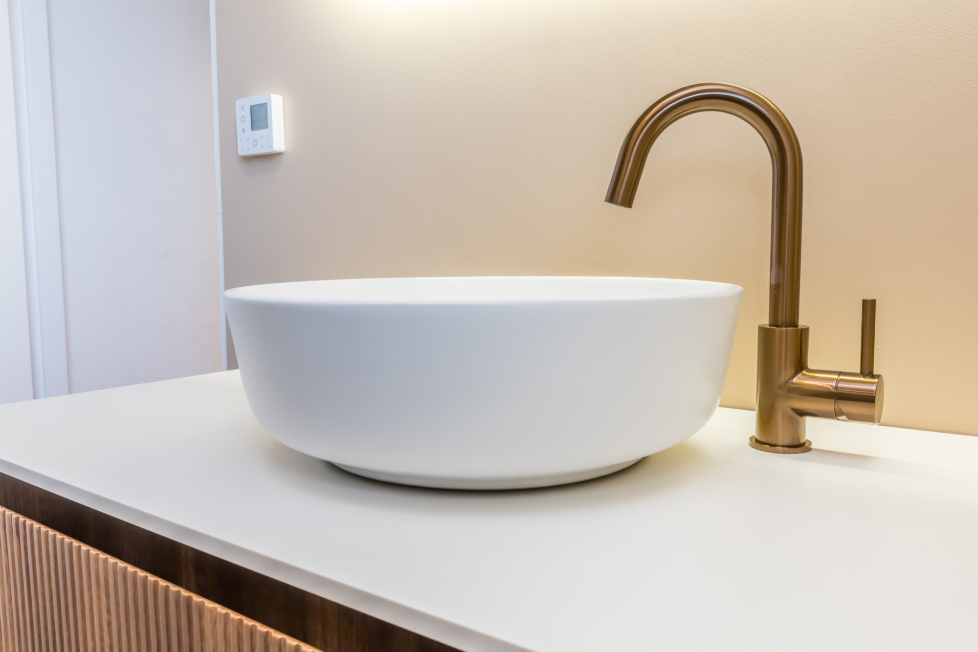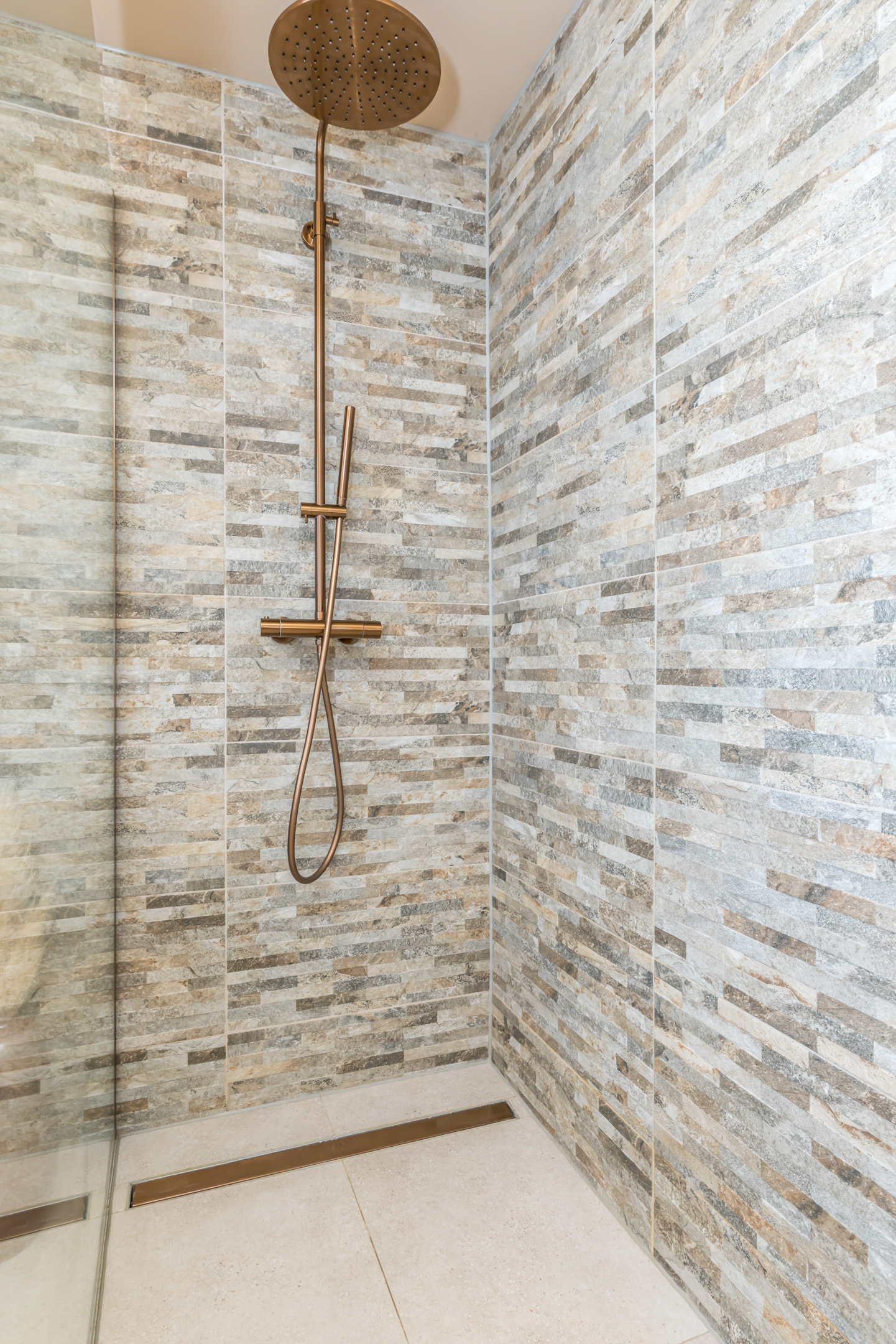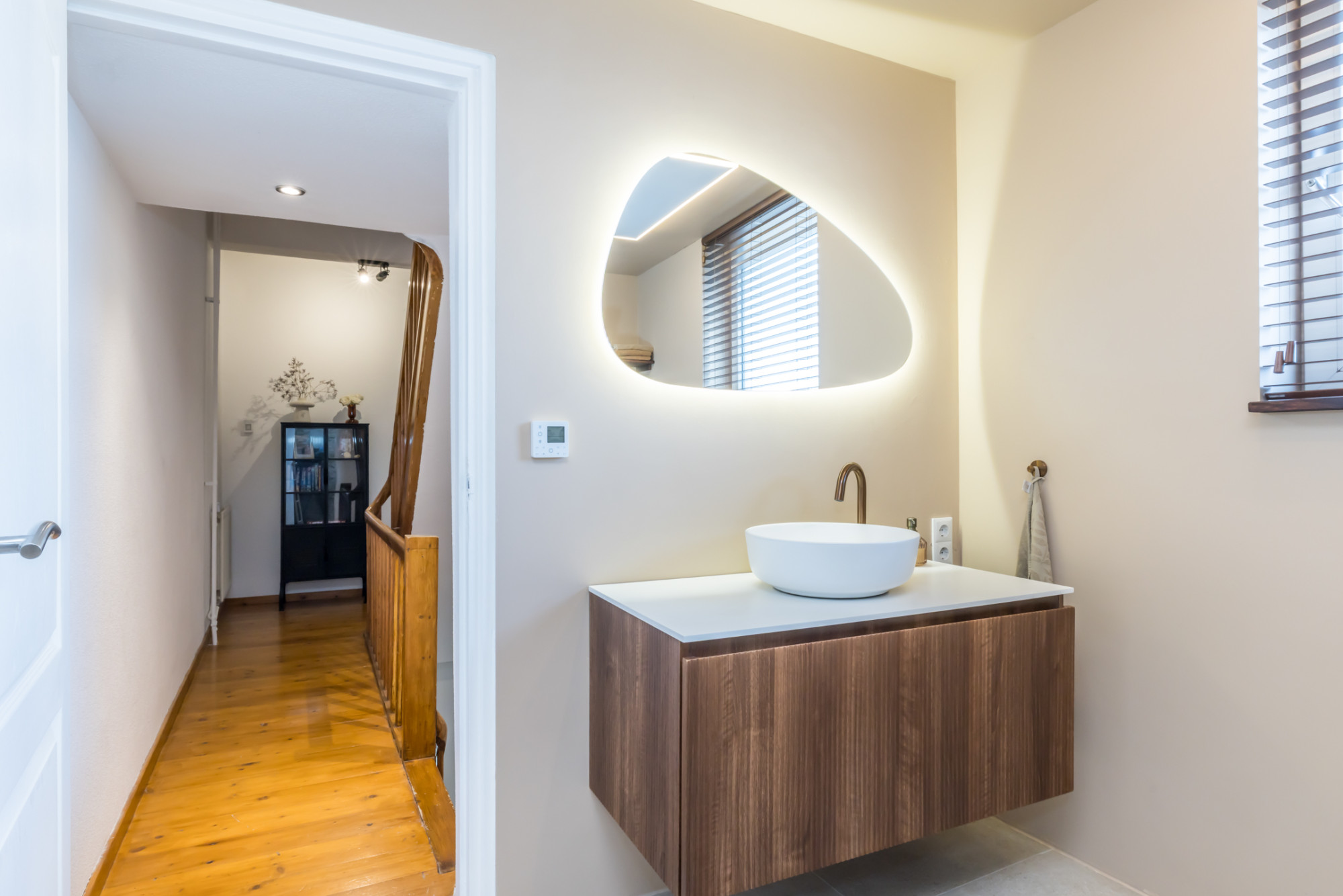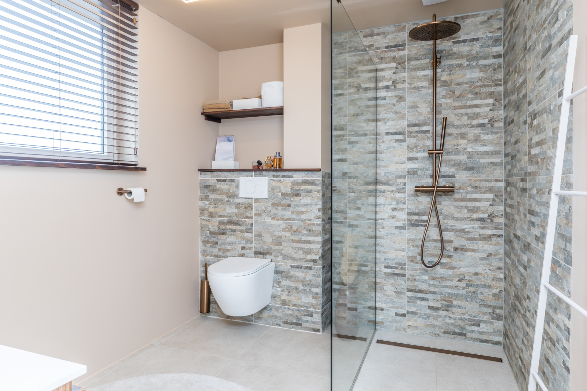 - moderne badkamer (2025) met inloopdouche, badmeubel met waskom en zwevend toilet