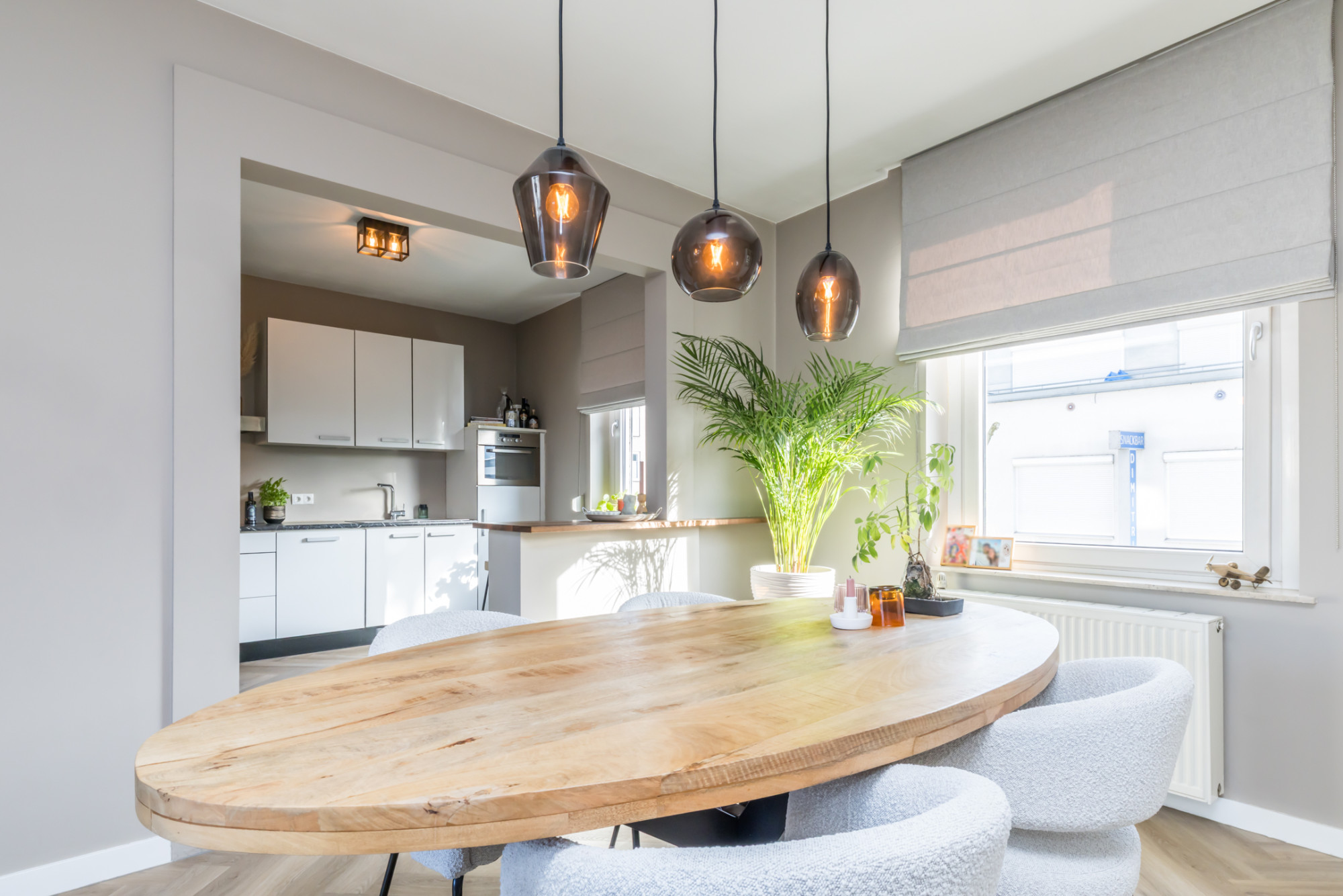 - open keuken met keukenopstelling voorzien van keramische kookplaat (Siemens), afzuigkap, oven, vaatwasser en