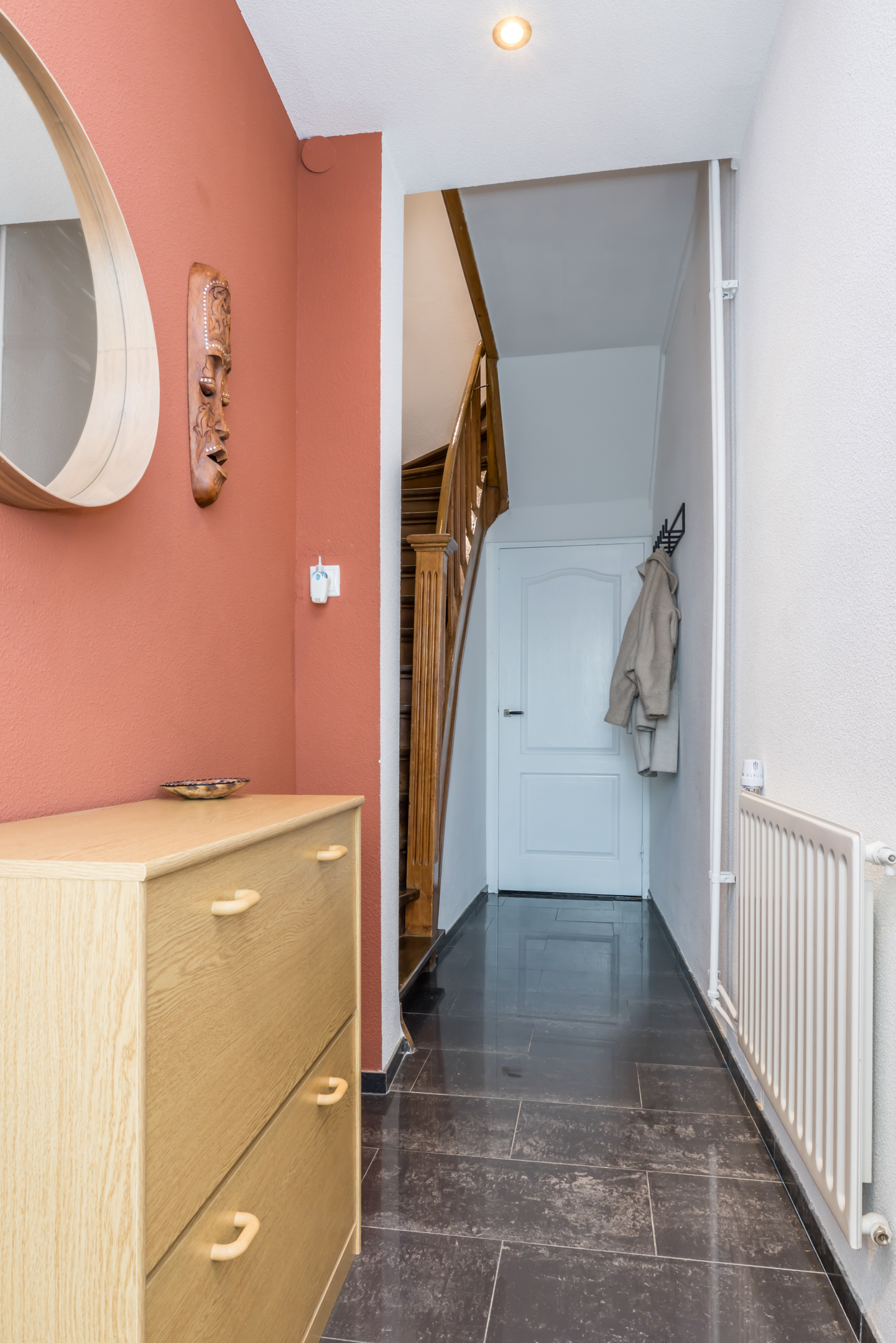 - entree/hal, meterkast, originele houten trap naar de eerste verdieping.