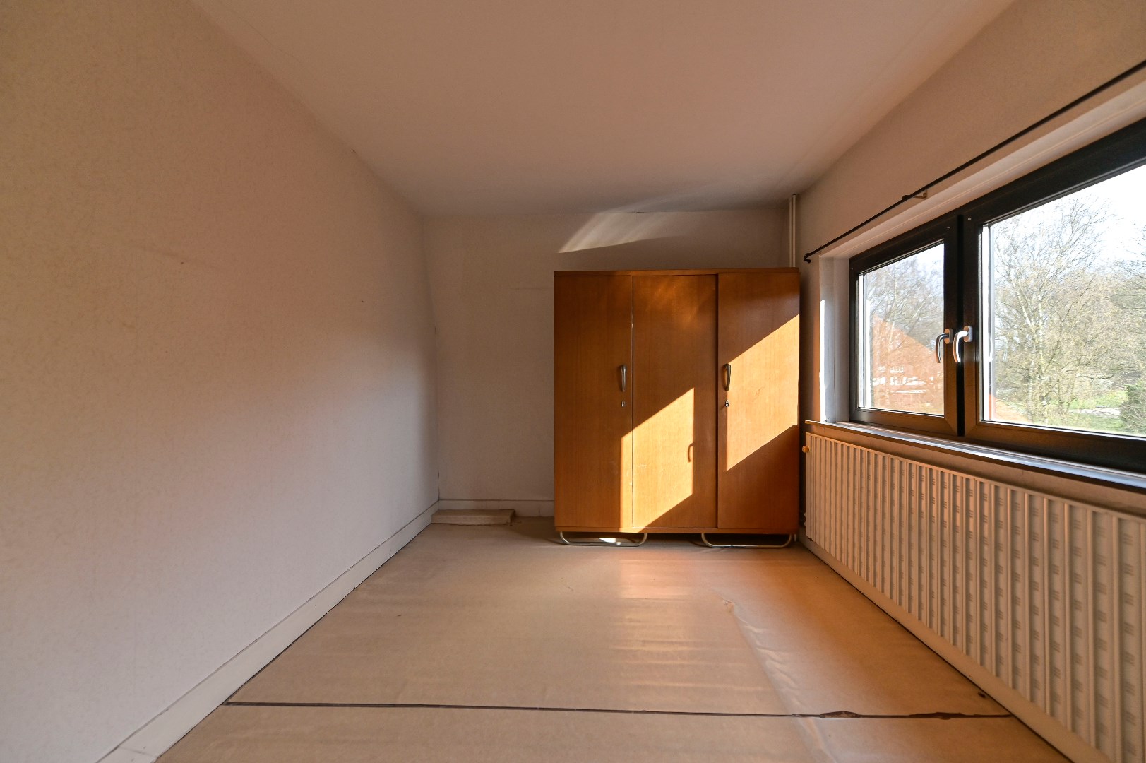 1ste verdieping: ruime overloop met tapijt. Toilet met fonteintje. Woonkamer met tapijt. Aparte keuken met keukenblok en afzuigkap.