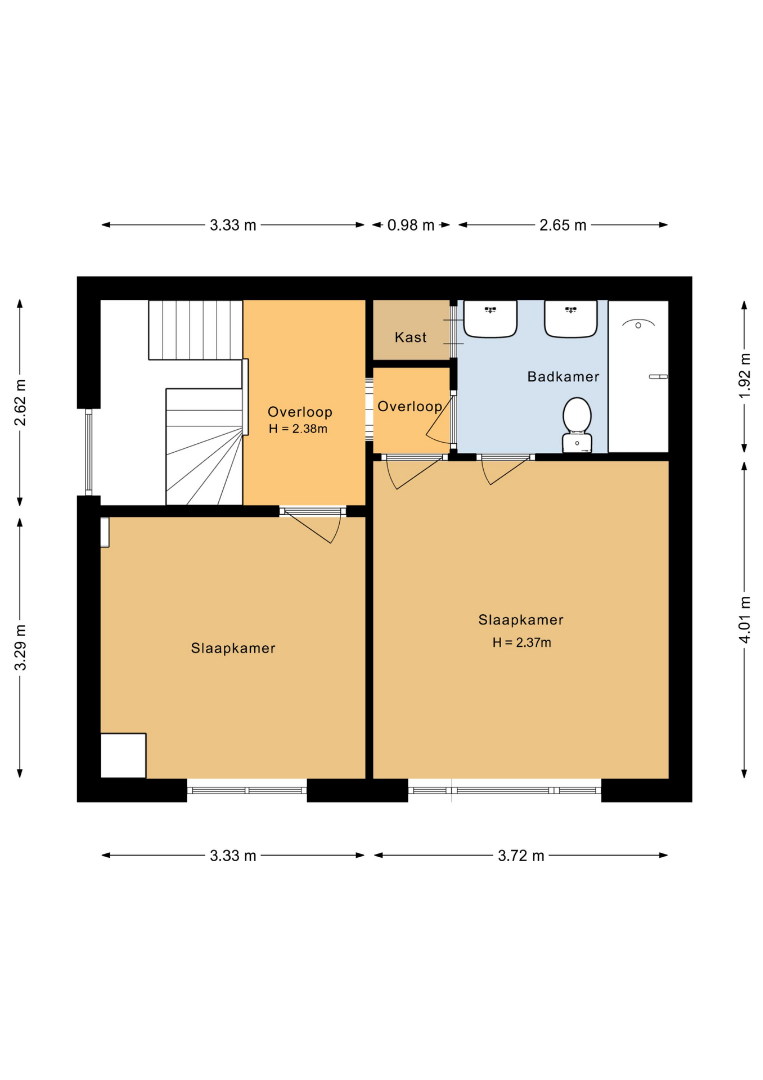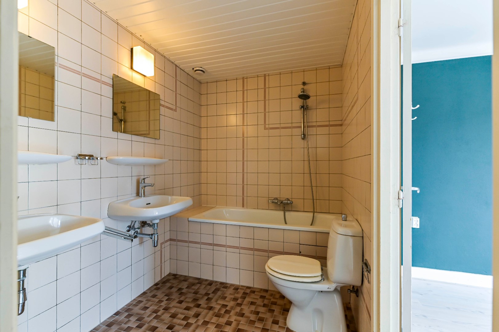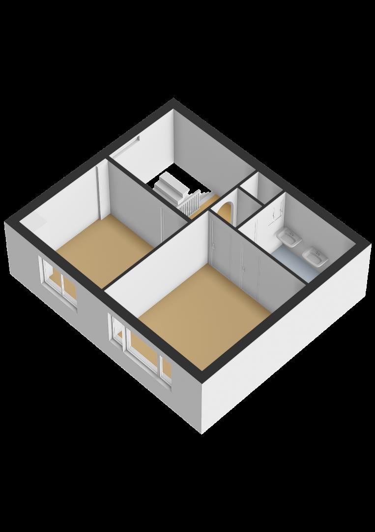 2de verdieping: Overloop met laminaatvloer en muurkast. 2 slaapkamers met laminaatvloer. Badkamer met ligbad/douchecombinatie, 2 wastafels, toilet en muurkast.