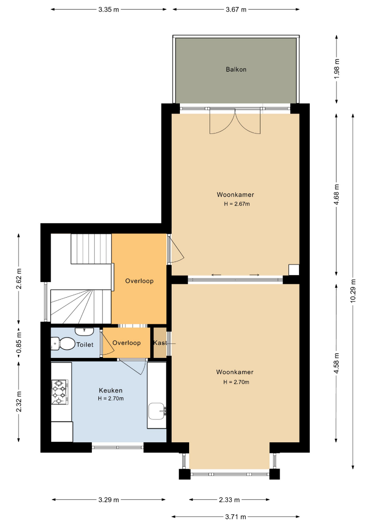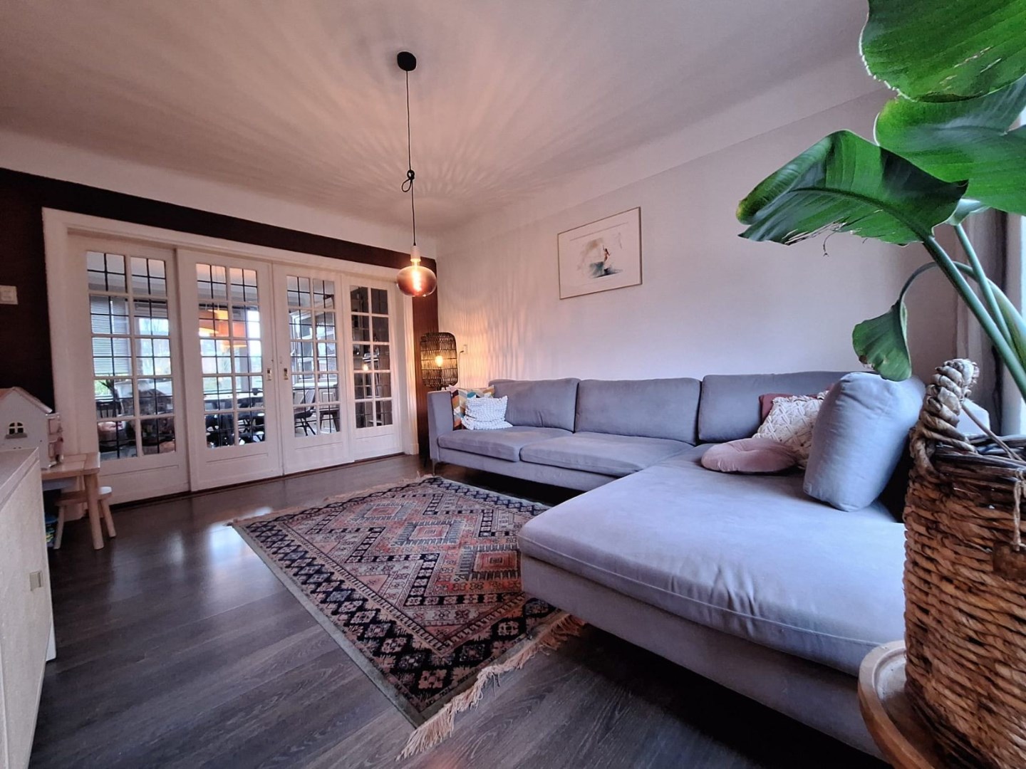 1ste verdieping: overloop met laminaatvloer. Toilet met fonteintje. Woonkamer met erker, en-suitedeuren met glas in lood ramen en ( naar binnen ) openslaande tuindeuren naar aangrenzend balkon. Aparte keuken met inbouw apparatuur zoals: koelkast, 5-pits gaskookplaat, afzuigkap, oven en vaatwasser.