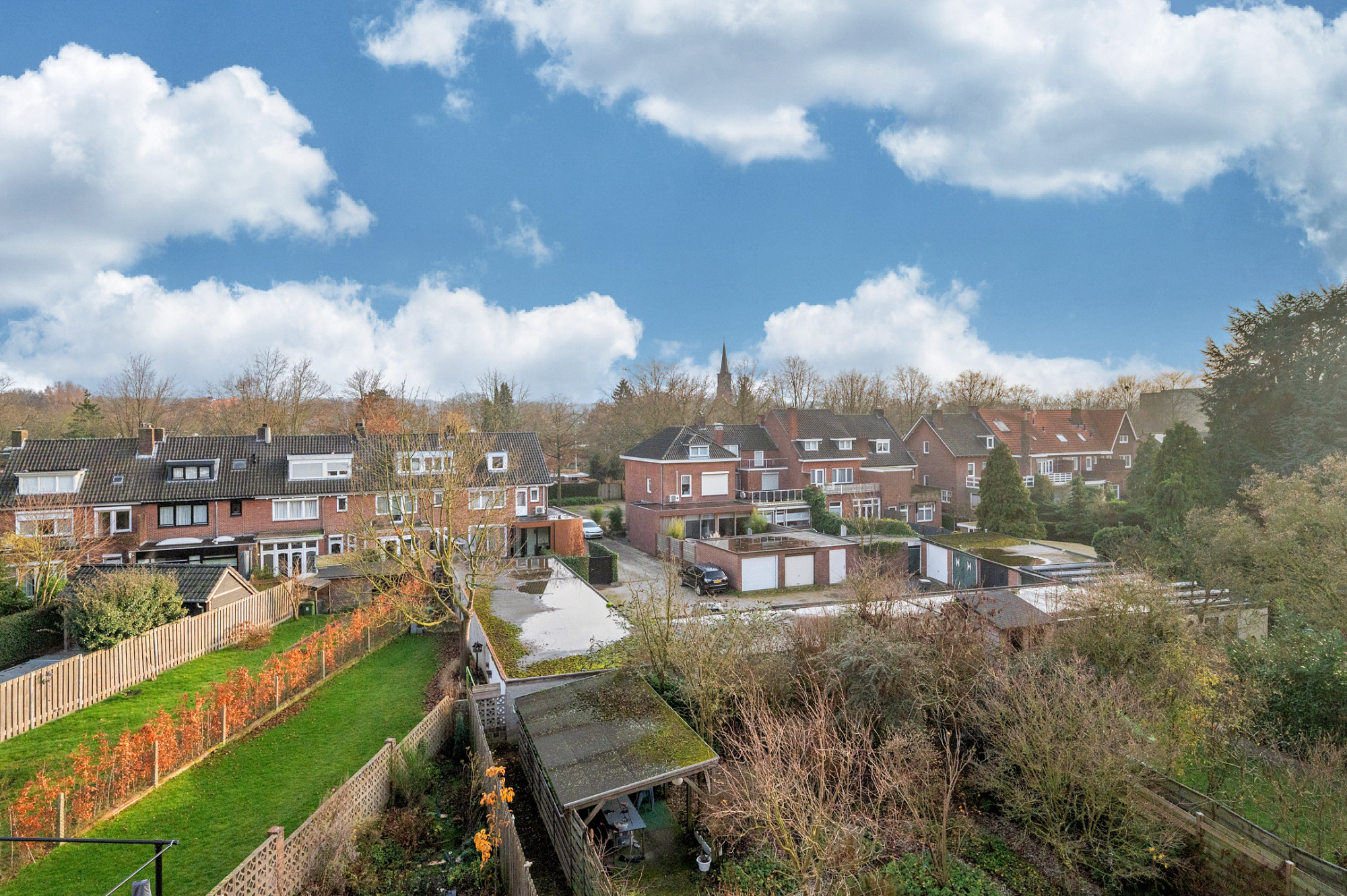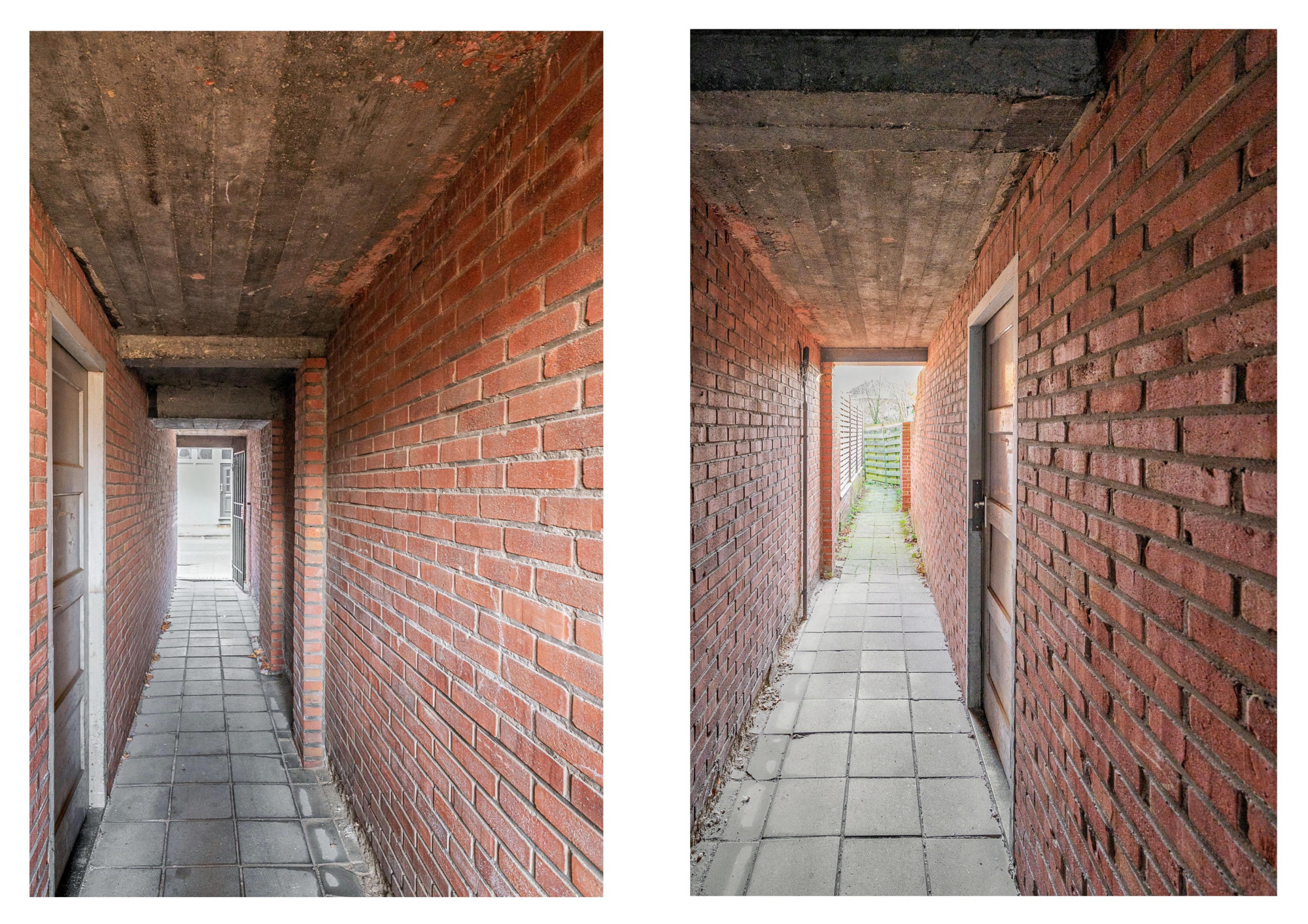 Aan de voorzijde van het complex ligt de gezamenlijke ingang. Vanuit hier is er toegang naar het appartement op de 3e etage. De poort aan de linkerzijde van het gebouw geeft toegang naar de individuele eigen berging behorende bij het appartement. Deze is ideaal voor opslagruimte of bijvoorbeeld het stallen van de fietsen.
