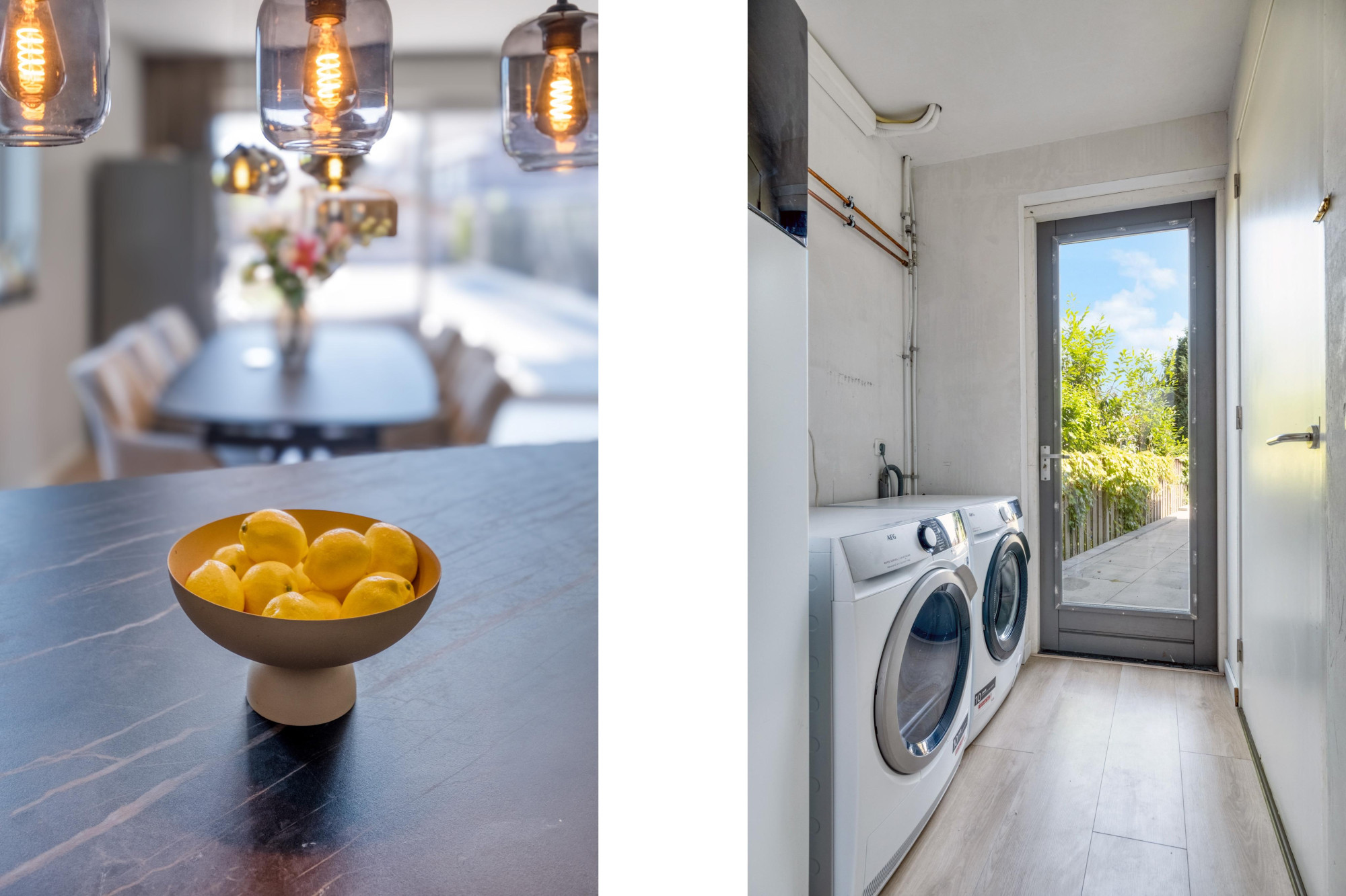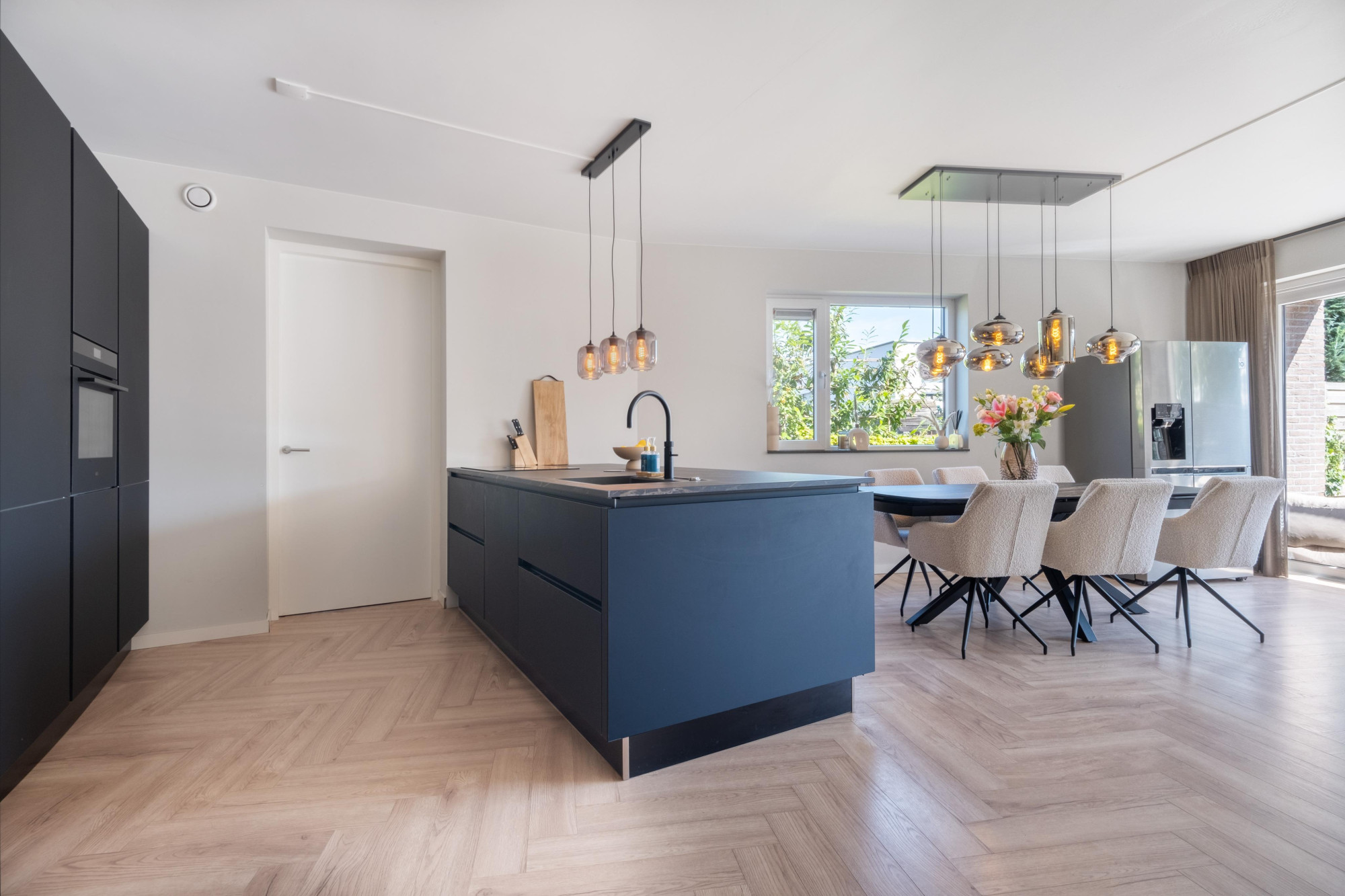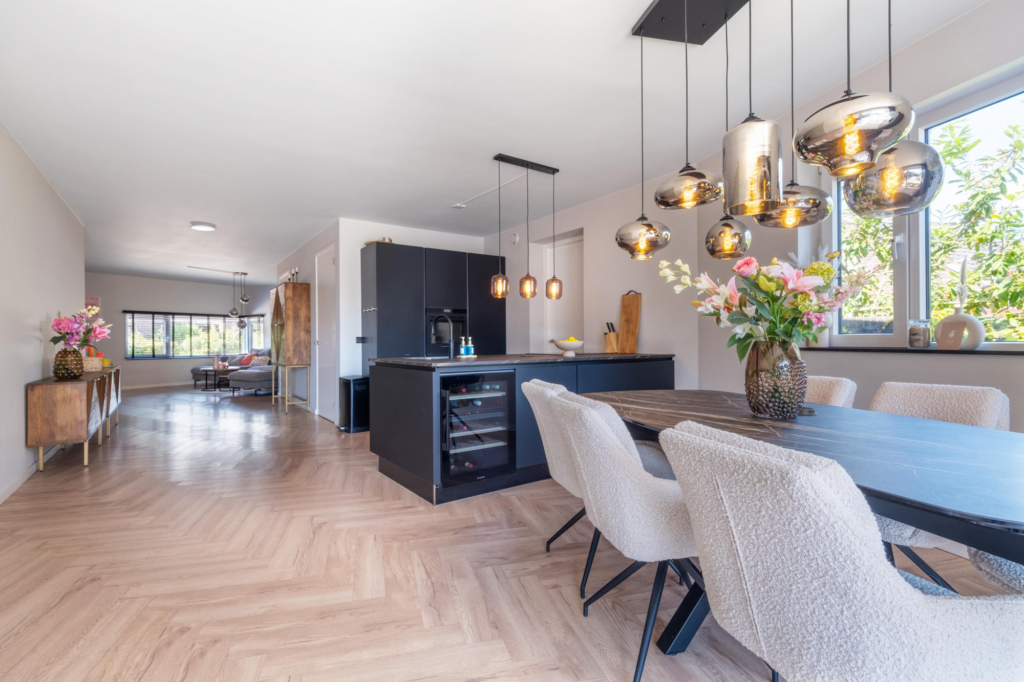 - Grote open prachtige moderne leefkeuken met aanbouwkeuken inclusief apparatuur w.o.: Kookplaat is inductie, verder AEG oven, Bora kookplaat met afzuiging, siemens klimaatkast en vaatwasser en granieten marmer blad, wijnkoelkast, quocker, (grote koelkast eventueel ter overname).
