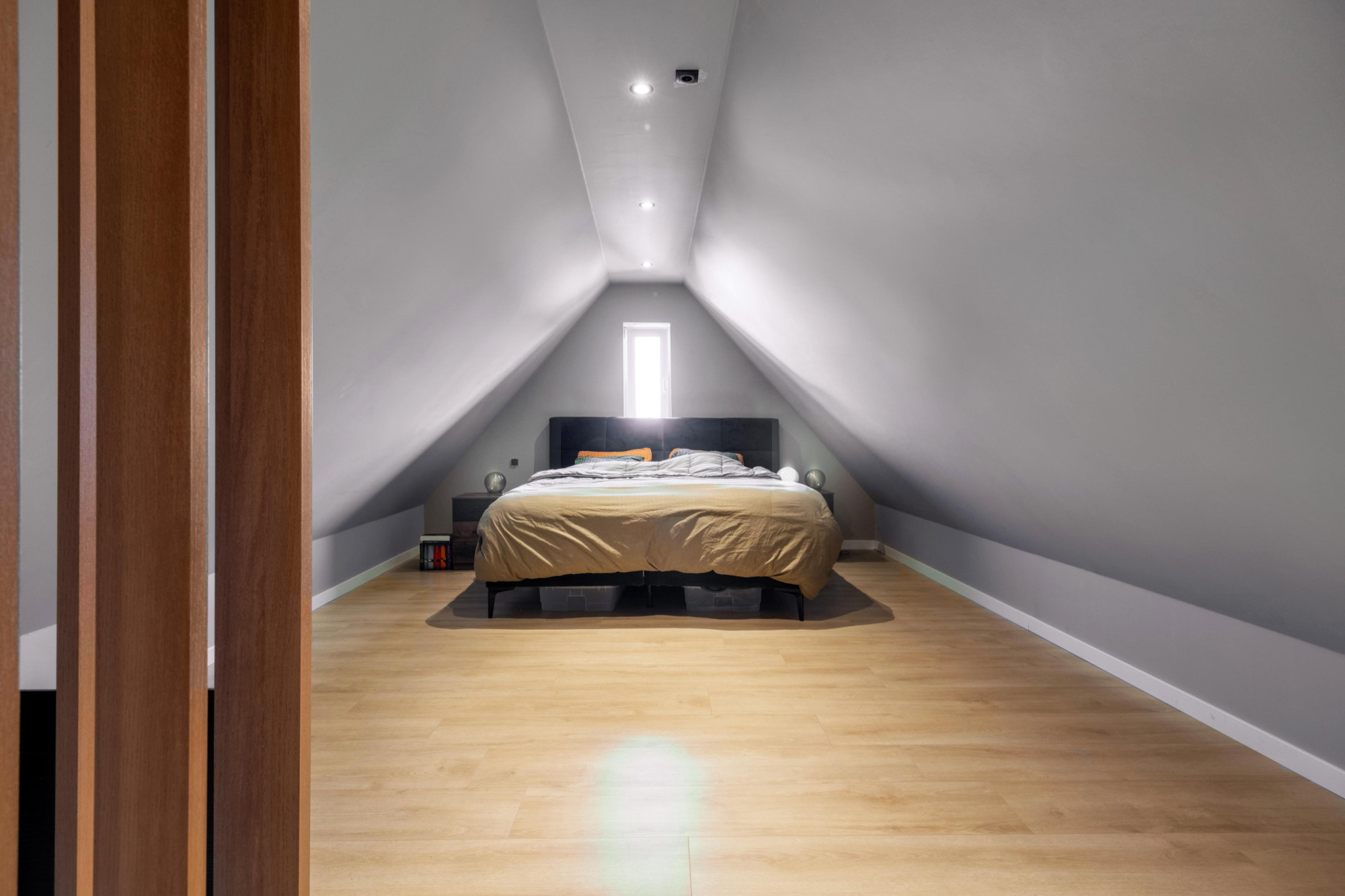 - Vaste trap naar zolderberging/ zeer grote ouderslaapkamer (10.40mx3.13m/3.00m) met laminaatvloer en extra bergruimte en vrijstaand ligbad met vaste wastafel.