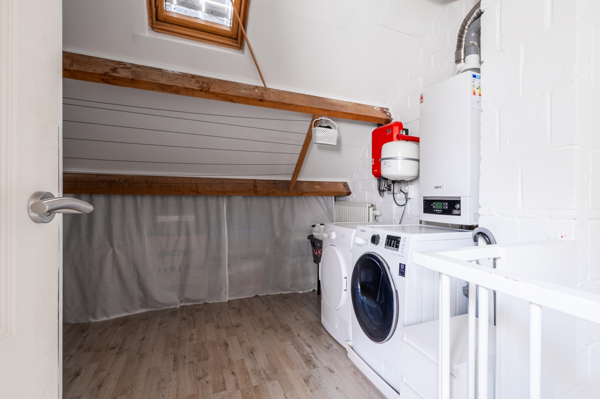 Berging c.q. aankleedruimte(5.35mx2.03m/4.60m), nefit cv - ketel (huur) en opstelplaats voor de omvormer van de zonnepanelen, aansluitpunten voor de wasmachine en droger.