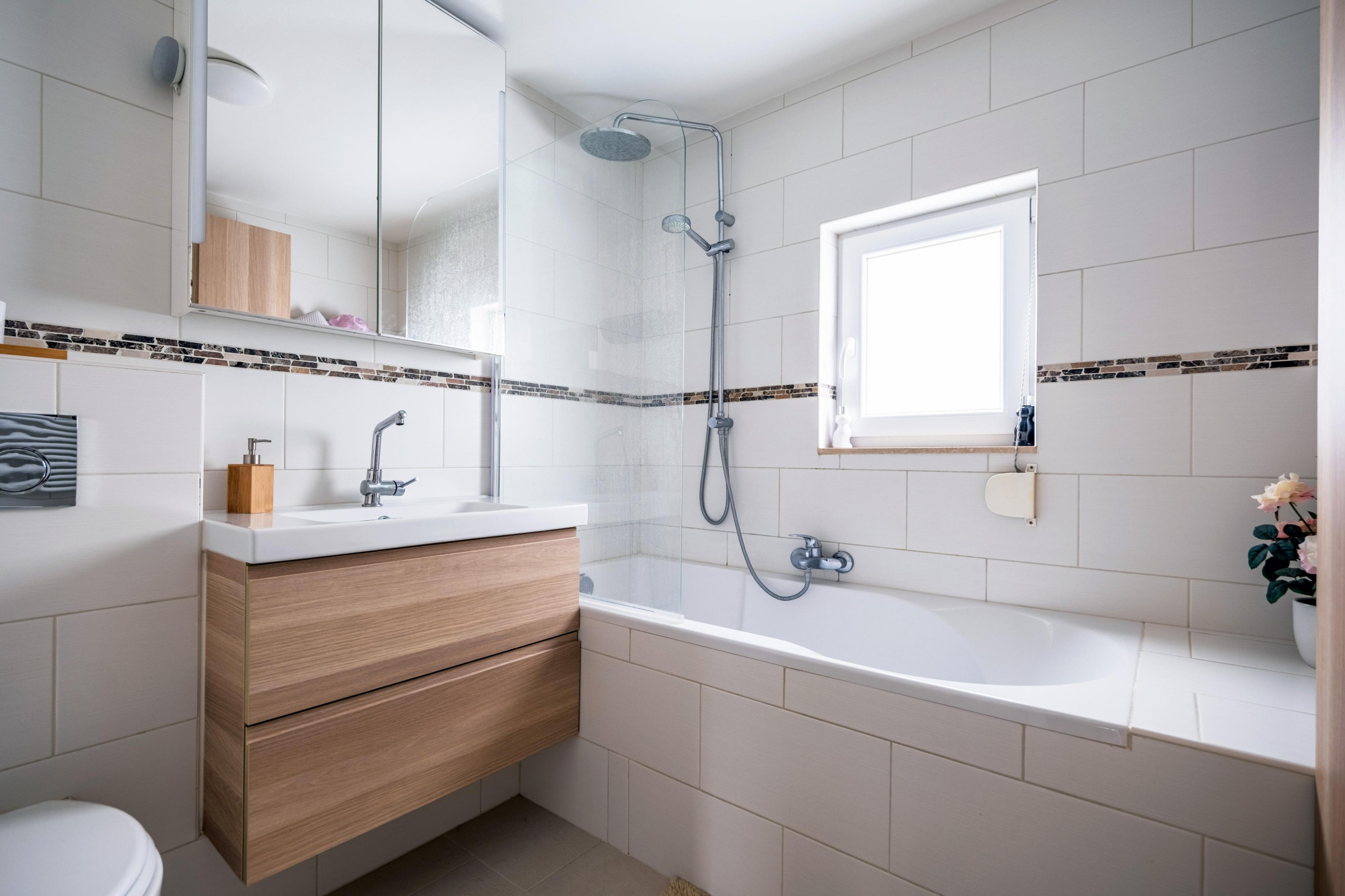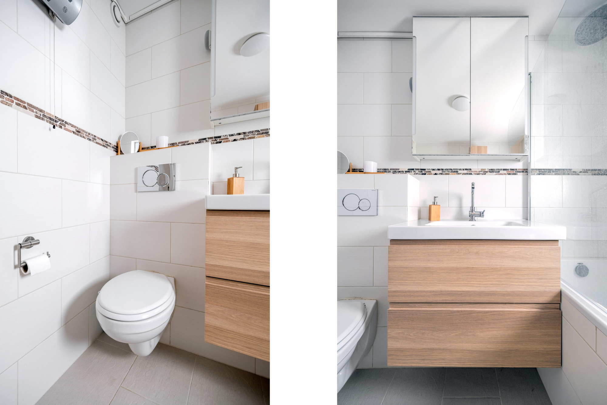 Volledig betegelde badkamer (2.26mx2.17m) voorzien van een ligbad/douche combinatie, vaste wastafel, zwevend 2e toilet en sierradiator.