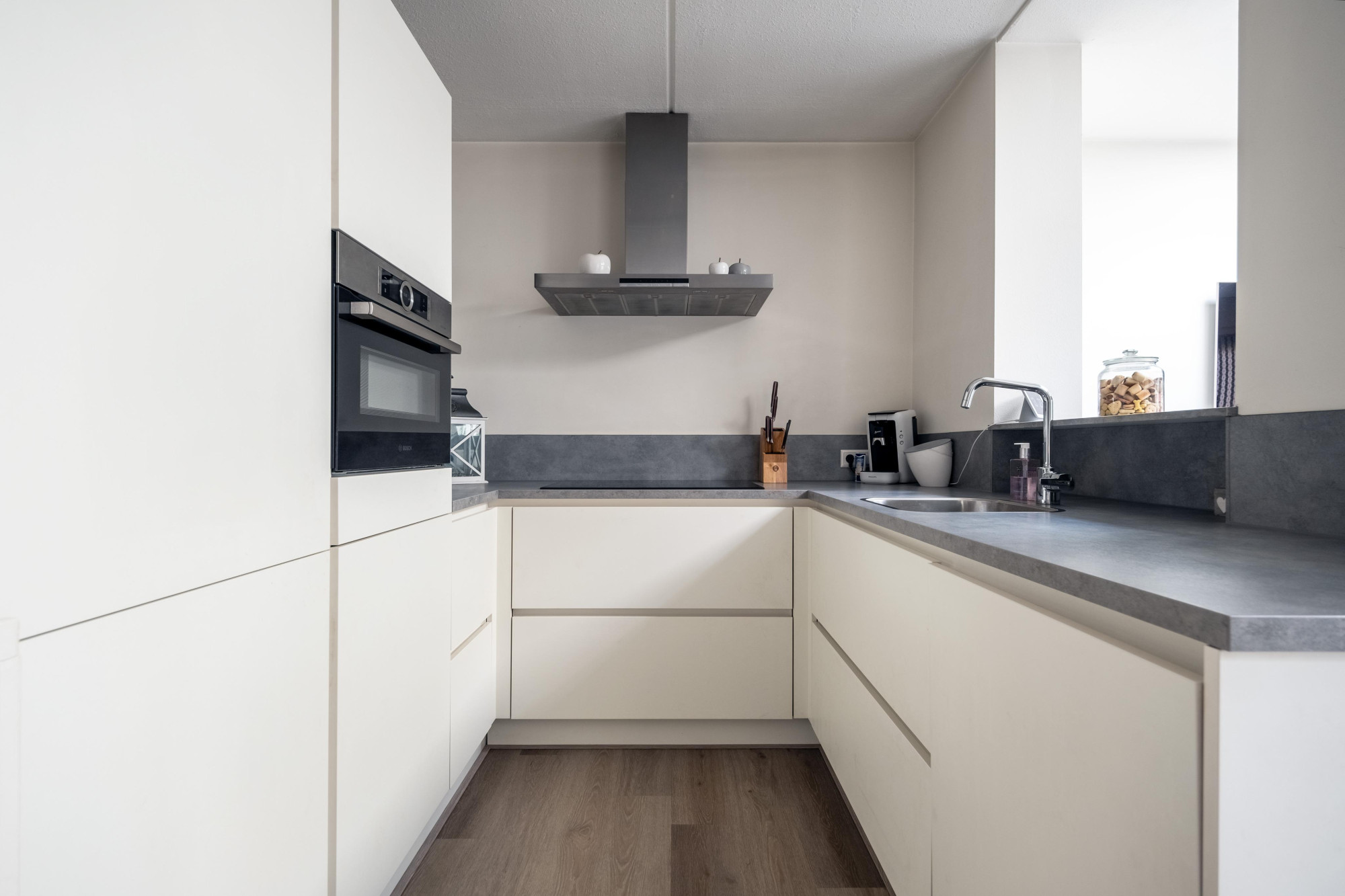 Nieuwe keuken(2.38mx2.29m) met pvc vloer, voorzien van een aanbouwkeuken, voorzien van inductiekookplaat, afzuigkap en een koelkast/diepvries, combioven en vaatwasser.