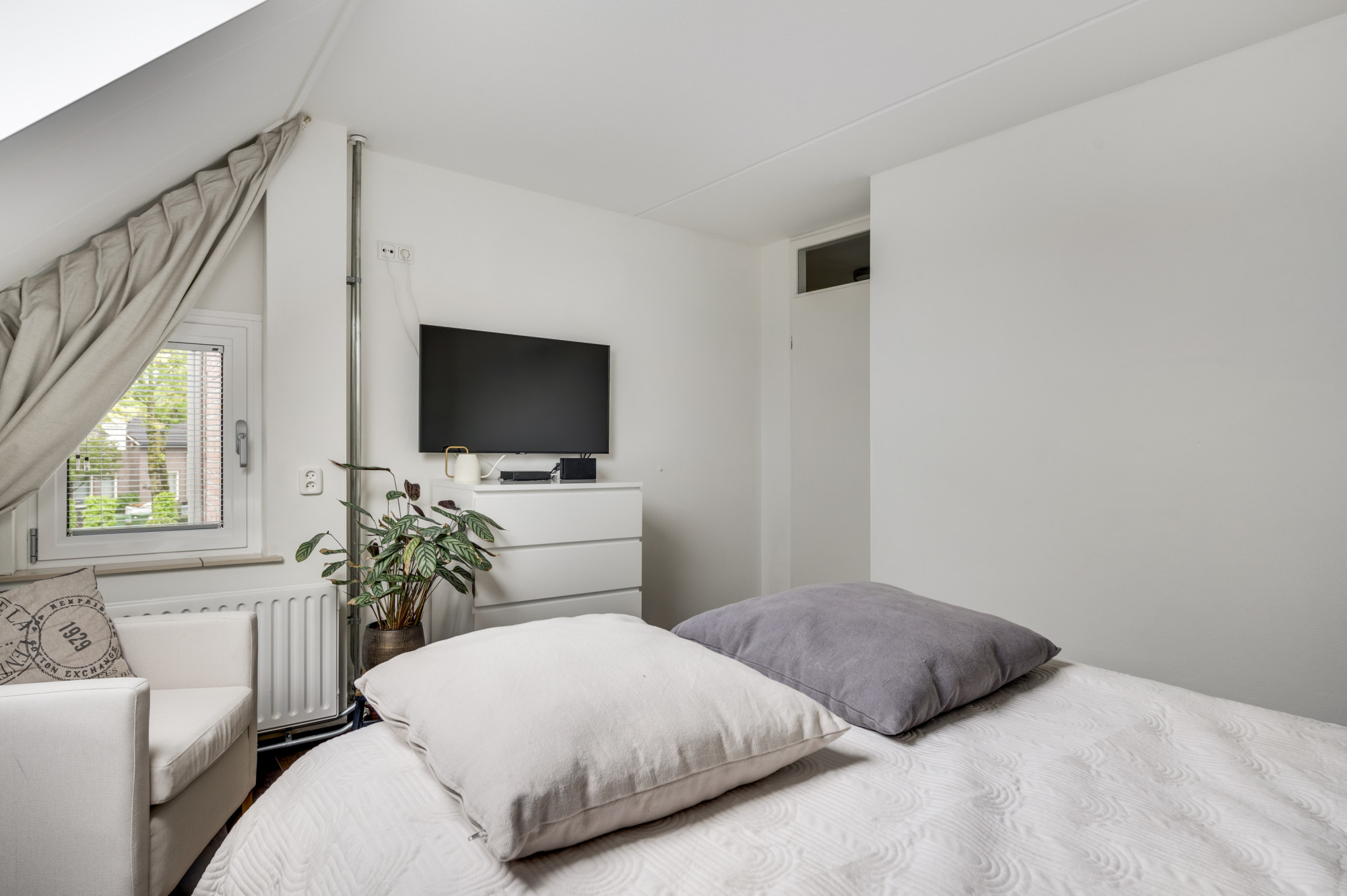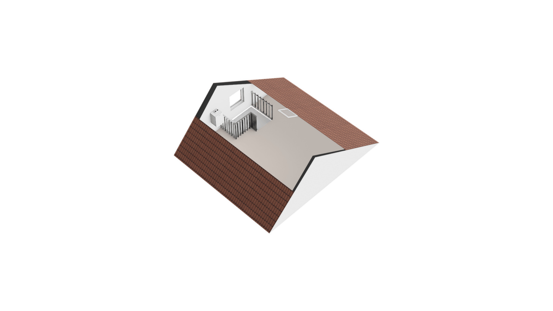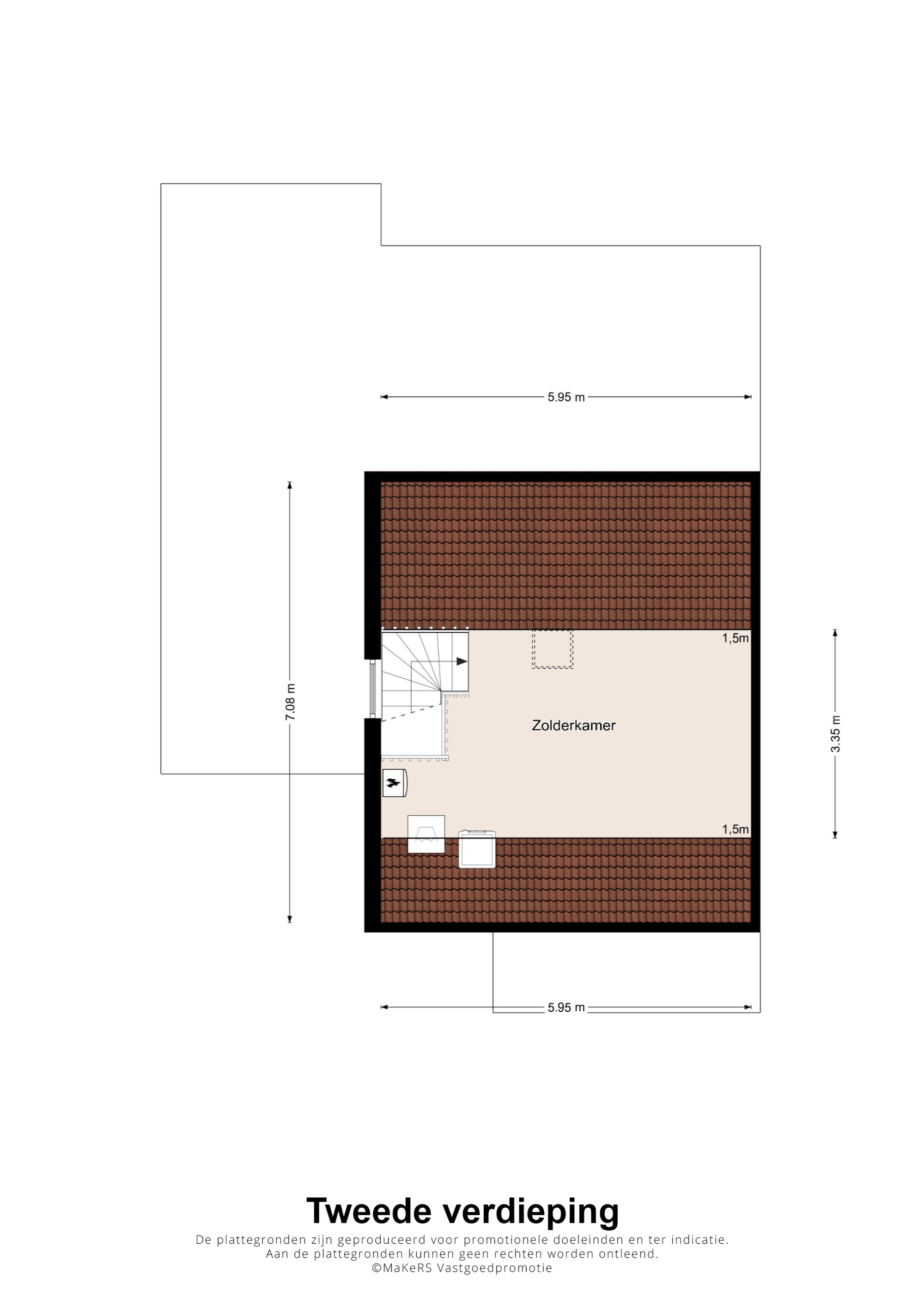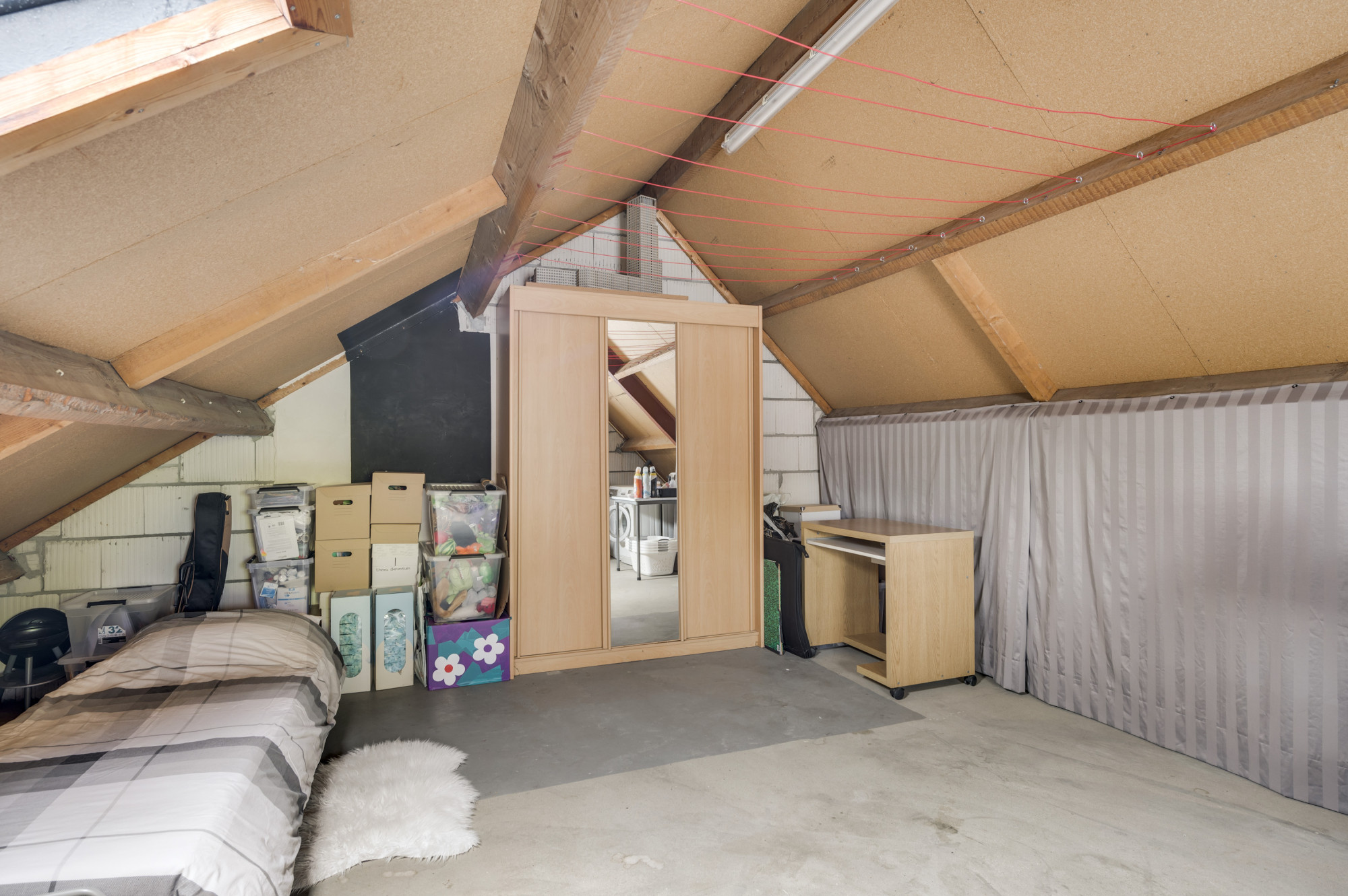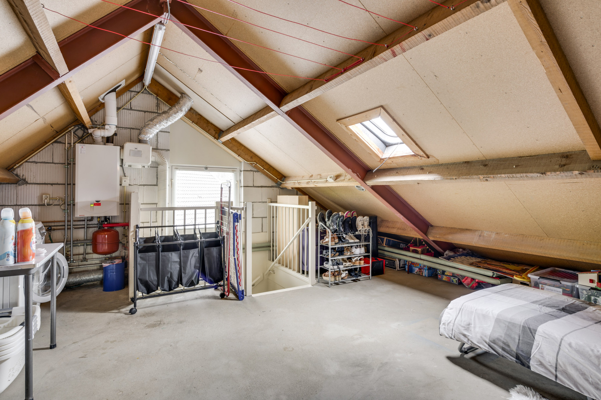 Een vaste trap leidt naar de ruime tweede verdieping met hoge nokhoogte. Deze open 4e zolderkamer is ook nog af te scheiden indien gewenst en is voorzien van een zijraam en dakraam en kan gebruikt worden als extra (slaap)kamer, werkruimte of hobbykamer. In het voorste gedeelte bevinden zich tevens de opstelling van de cv-combi ketel (Bosch HR, ca. 2005, eigendom), de unit voor de mechanische ventilatie en de aansluitingen voor de wasmachine en droger.