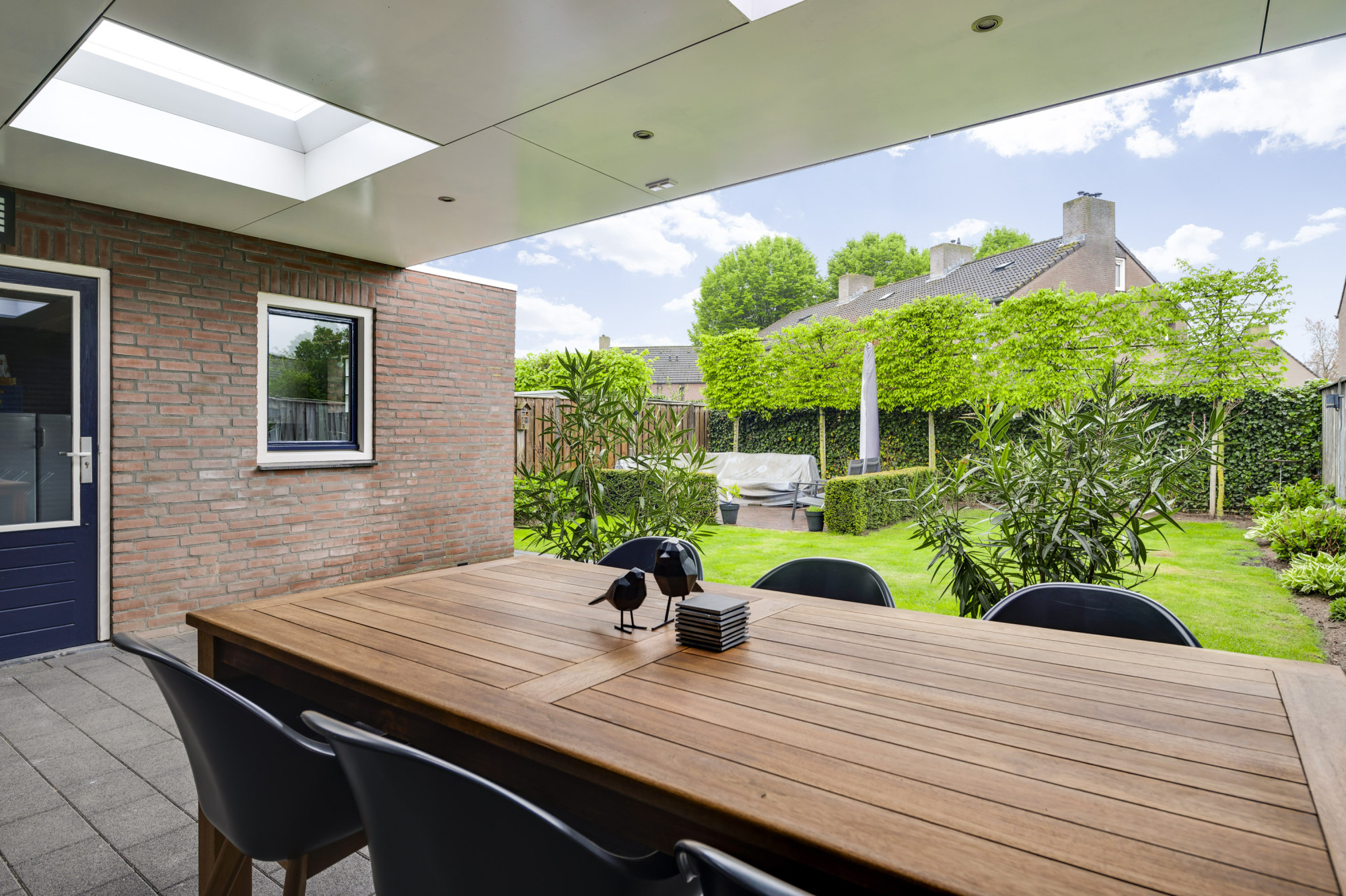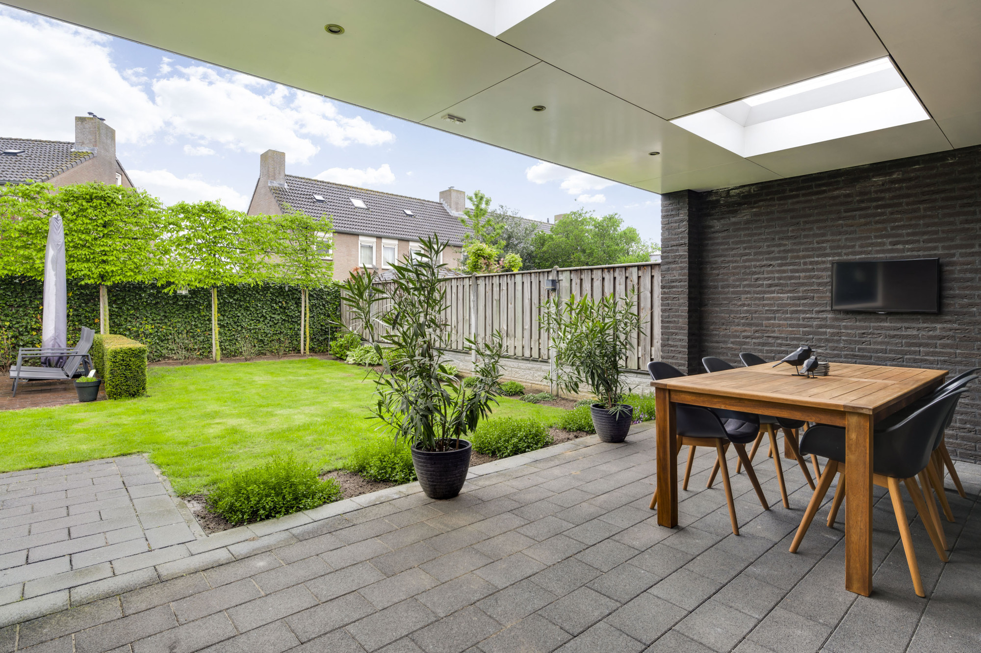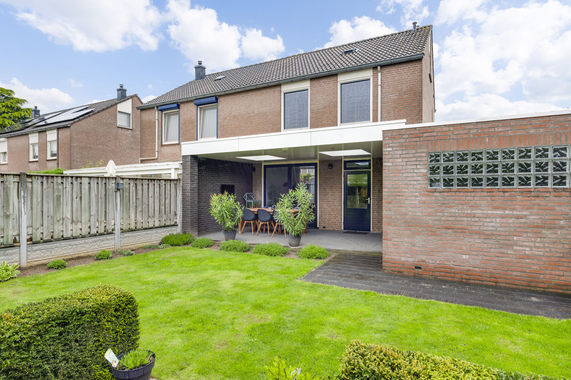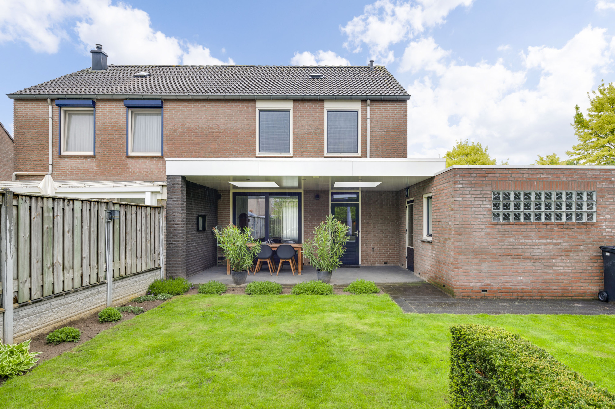 Aan de voorzijde beschikt de woning over een nette voortuin en een oprit die leidt naar de verlengde garage. Via een loopdeur is de achtertuin toegankelijk. De zonnige achtertuin is een heerlijke plek om de hele dag van de zon te genieten. Onder de riante overkapping zit u altijd beschut, ongeacht het weer en kunt u droog naar de garage/hobbyruimte. De tuin beschikt verder over een tweede terras, een gazon en gevarieerde aanplant. Een fijne plek om in alle rust en privacy te ontspannen!