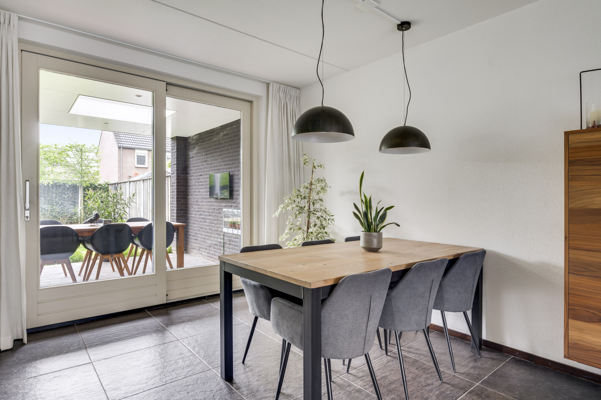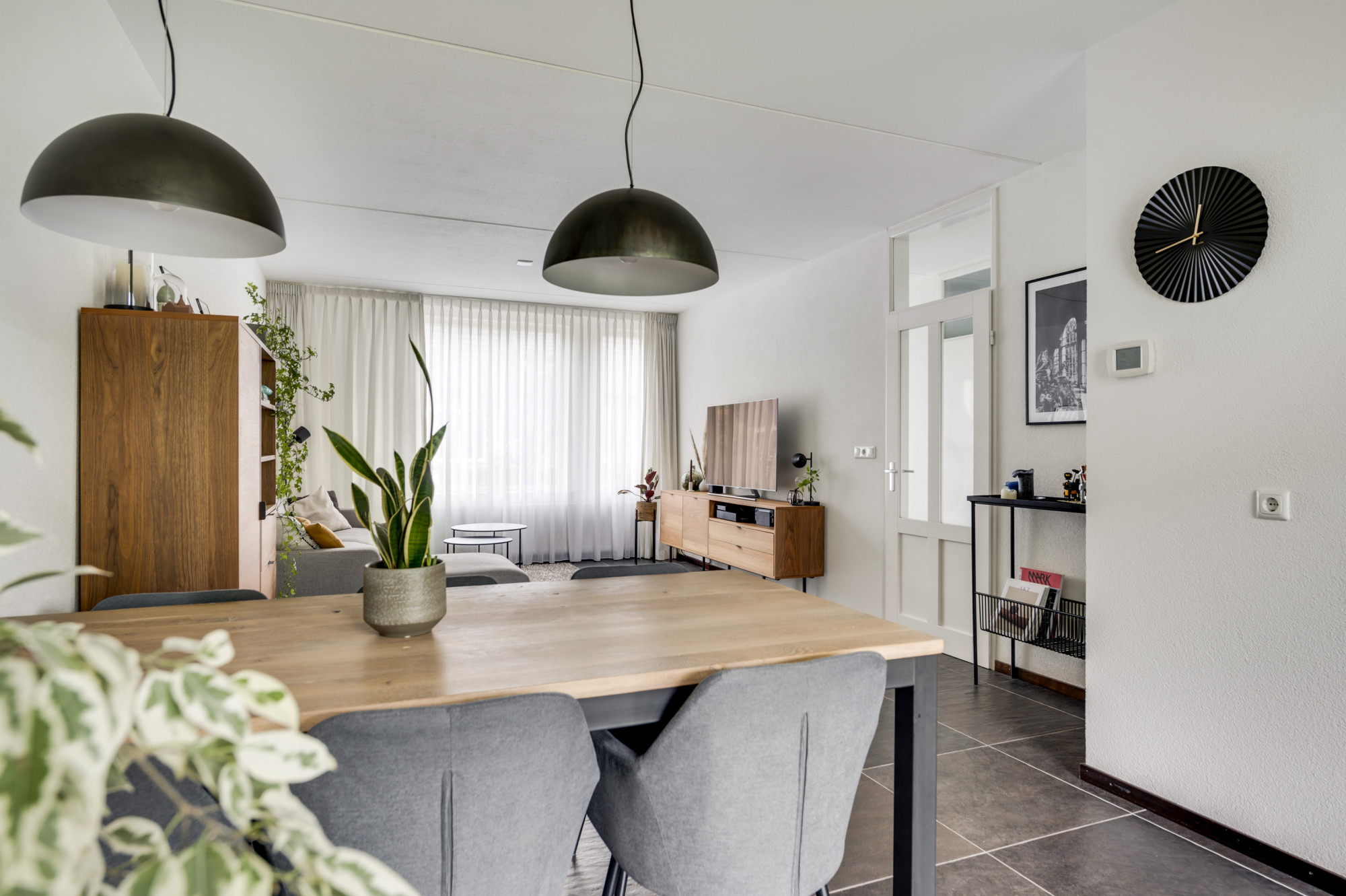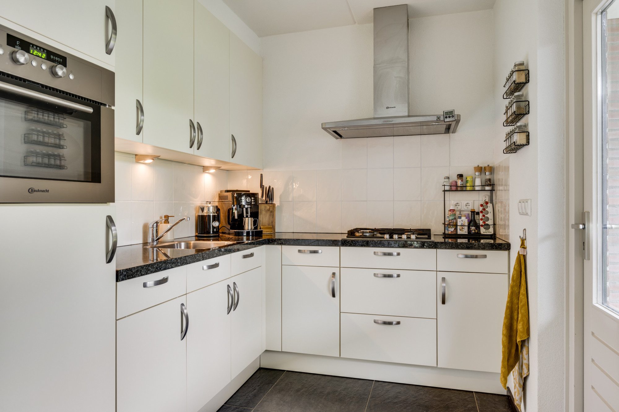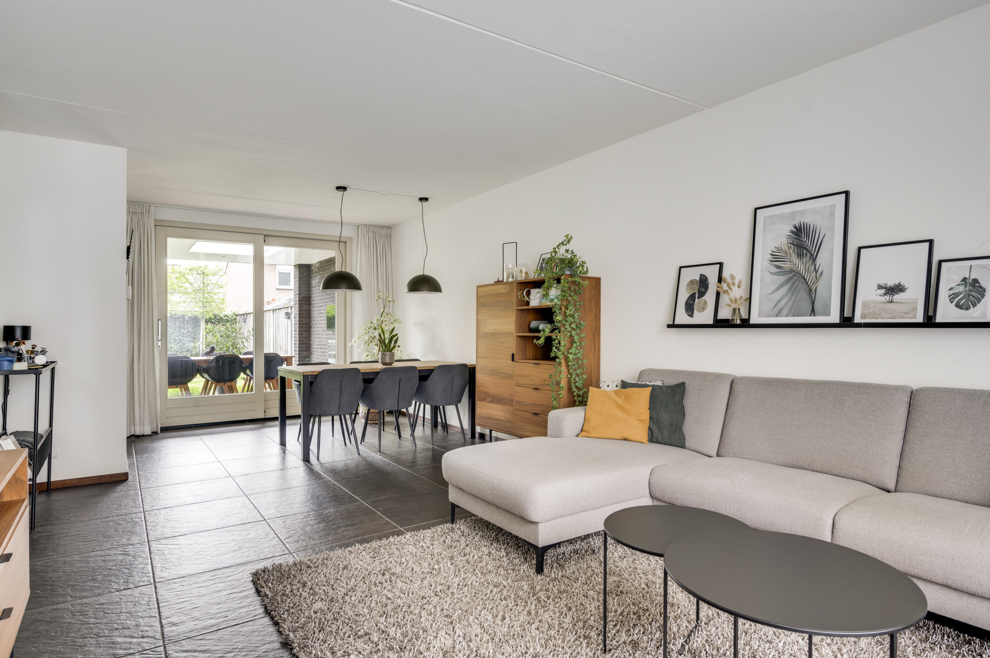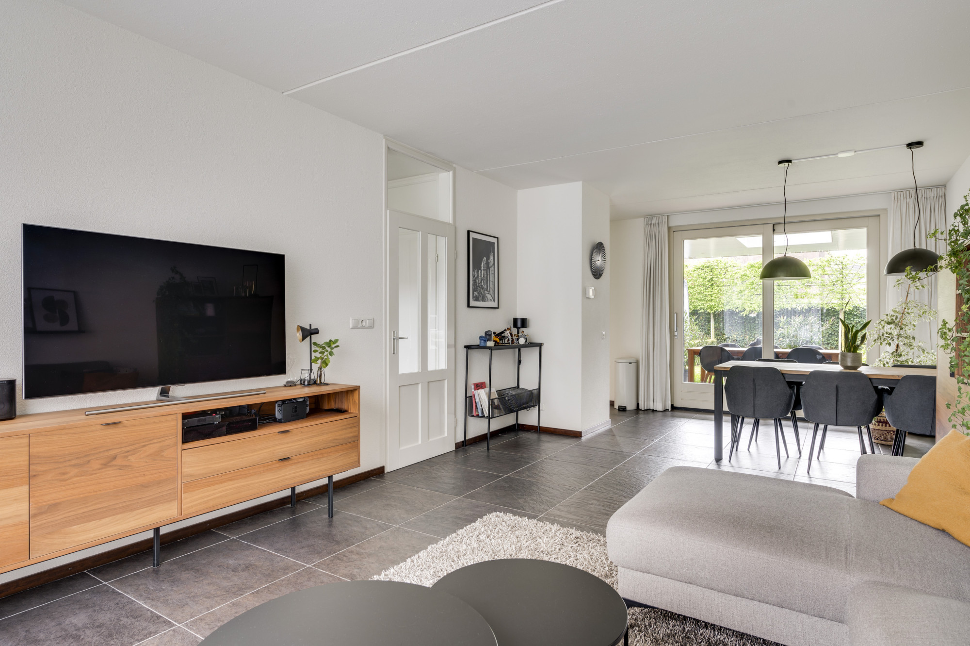 Binnenkomst in een verzorgde hal met de trapopgang, vernieuwde meterkast, trapkast en een moderne toiletruimte met zwevend toilet en fonteintje. De sfeervolle woonkamer is voorzien van een antracietkleurige tegelvloer mét vloerverwarming en biedt via de schuifpui direct toegang tot het overdekte terras en de tuin. Dankzij de grote raampartijen geniet u hier van veel daglicht en een prettig zicht op de tuin. Aangrenzend ligt de halfopen complete keuken, uitgevoerd in een hoekopstelling met een granieten werkblad en inbouwapparatuur, waaronder een gasfornuis, afzuigkap, koelkast, combi-oven en een vaatwasser. Ook vanuit de keuken is de overkapping en achtertuin via een loopdeur bereikbaar. Vanuit de overkapping is heel praktisch de diepe/dubbele garage te bereiken welke maar liefst 9 meter diep is en uitgerust met een automatische sectionaalpoort. Deze multifunctioneel te gebruiken ruimte is verder voorzien van elektra en water.
