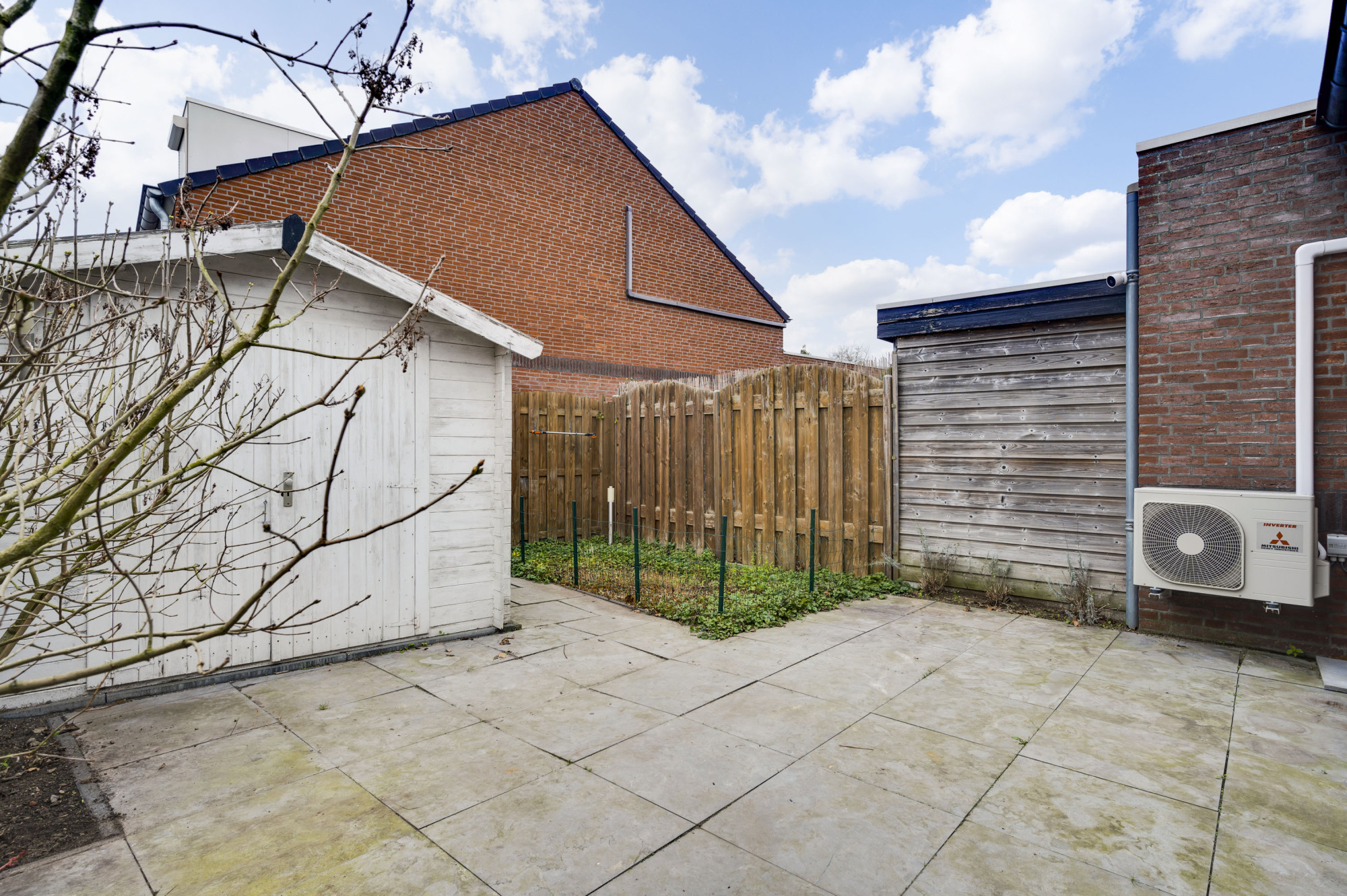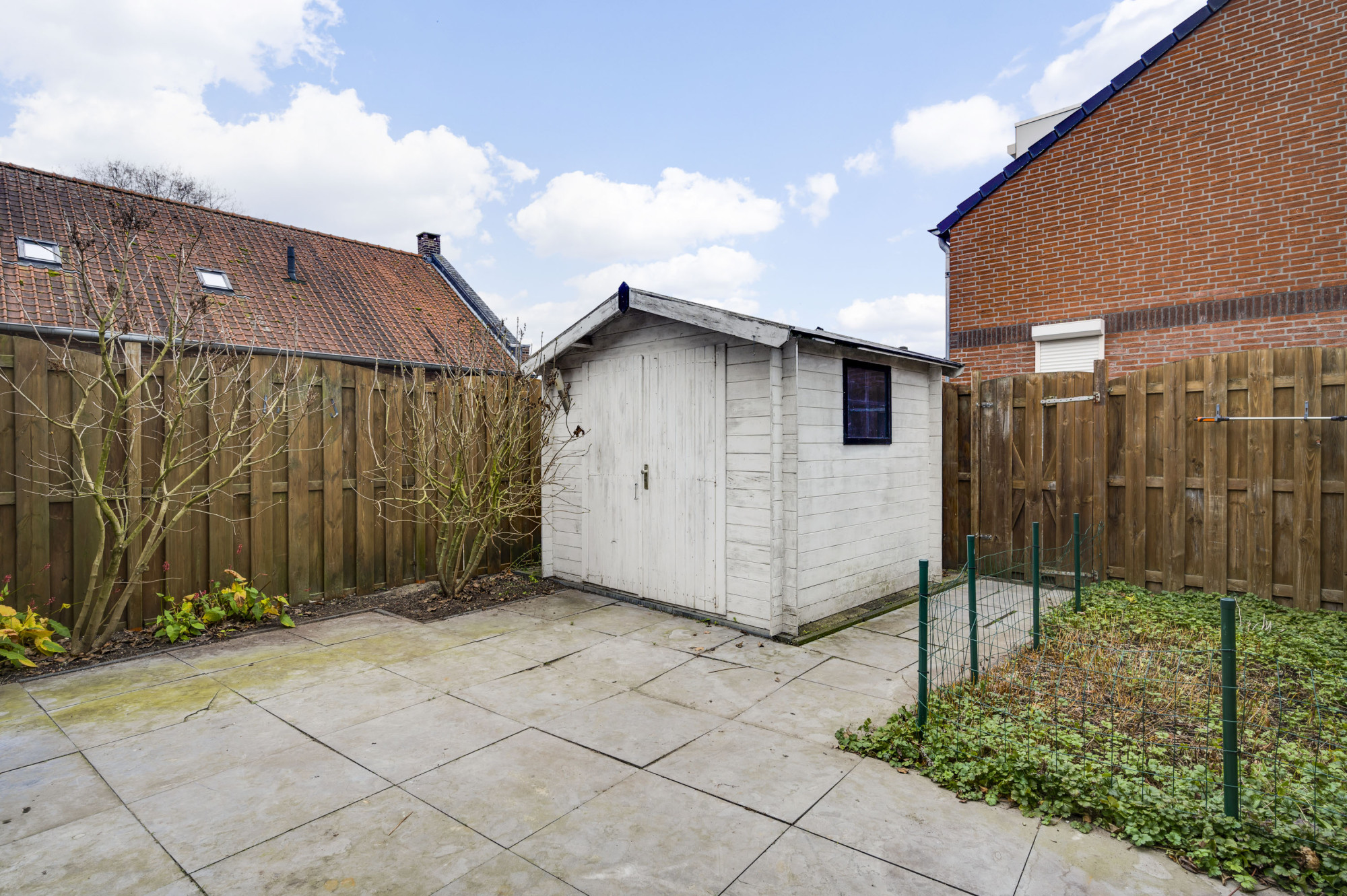 Geniet van de zonnige achtertuin met een fraai terras, borders, een vrijstaande houten tuinberging en een vrije achterom.