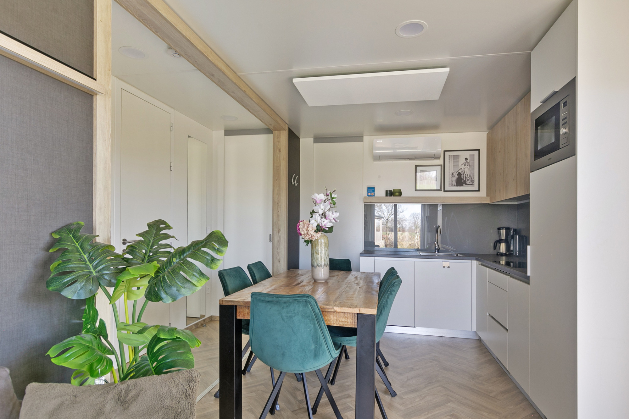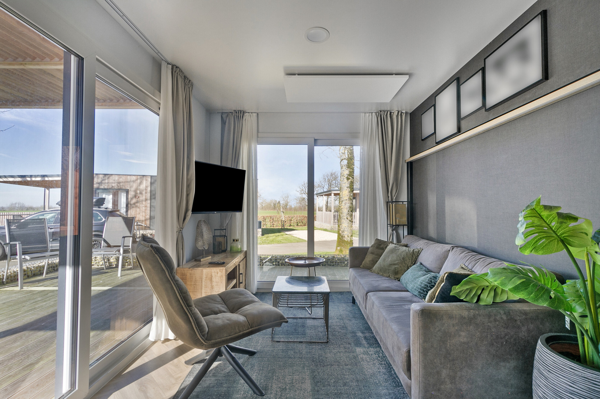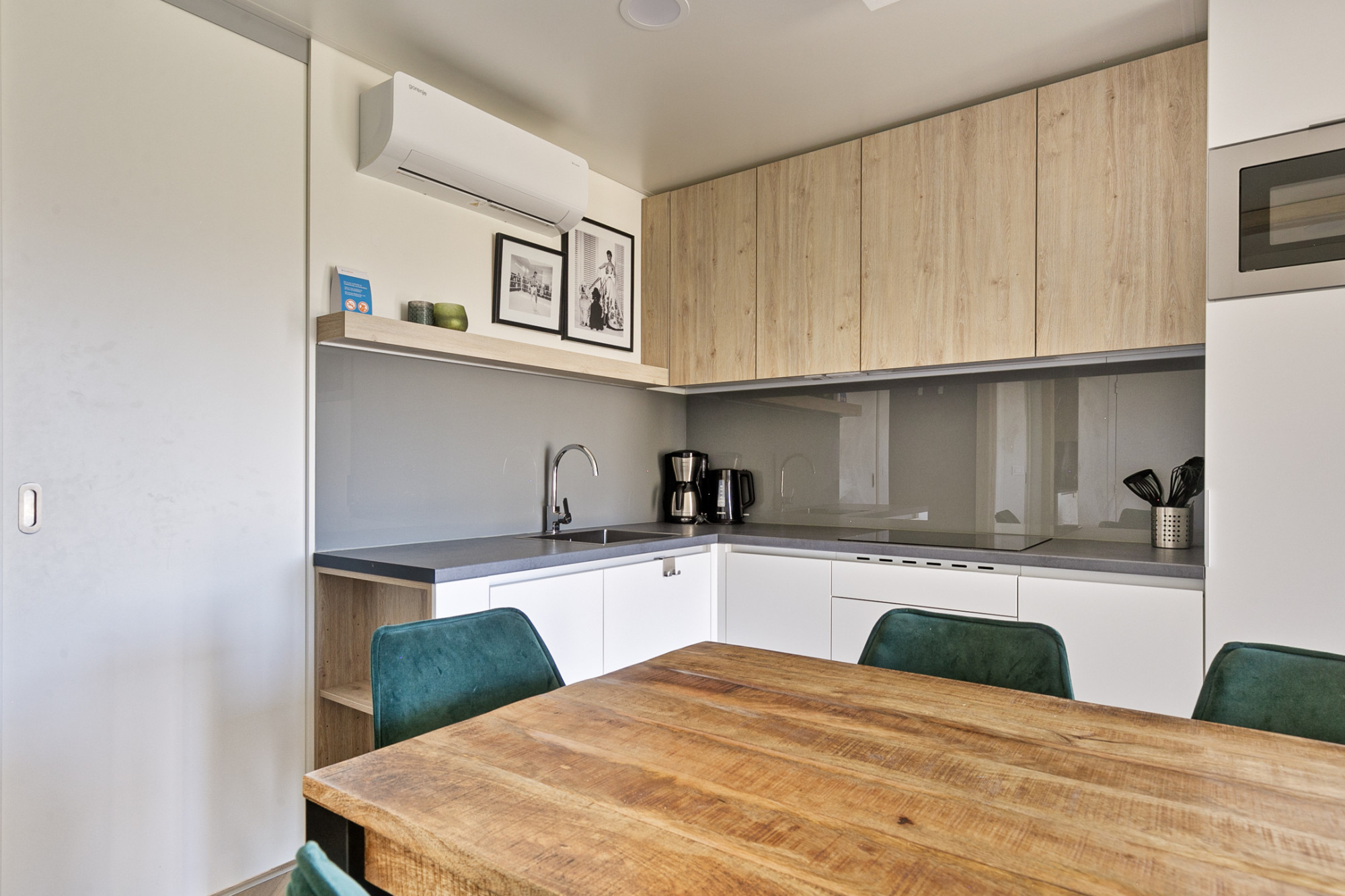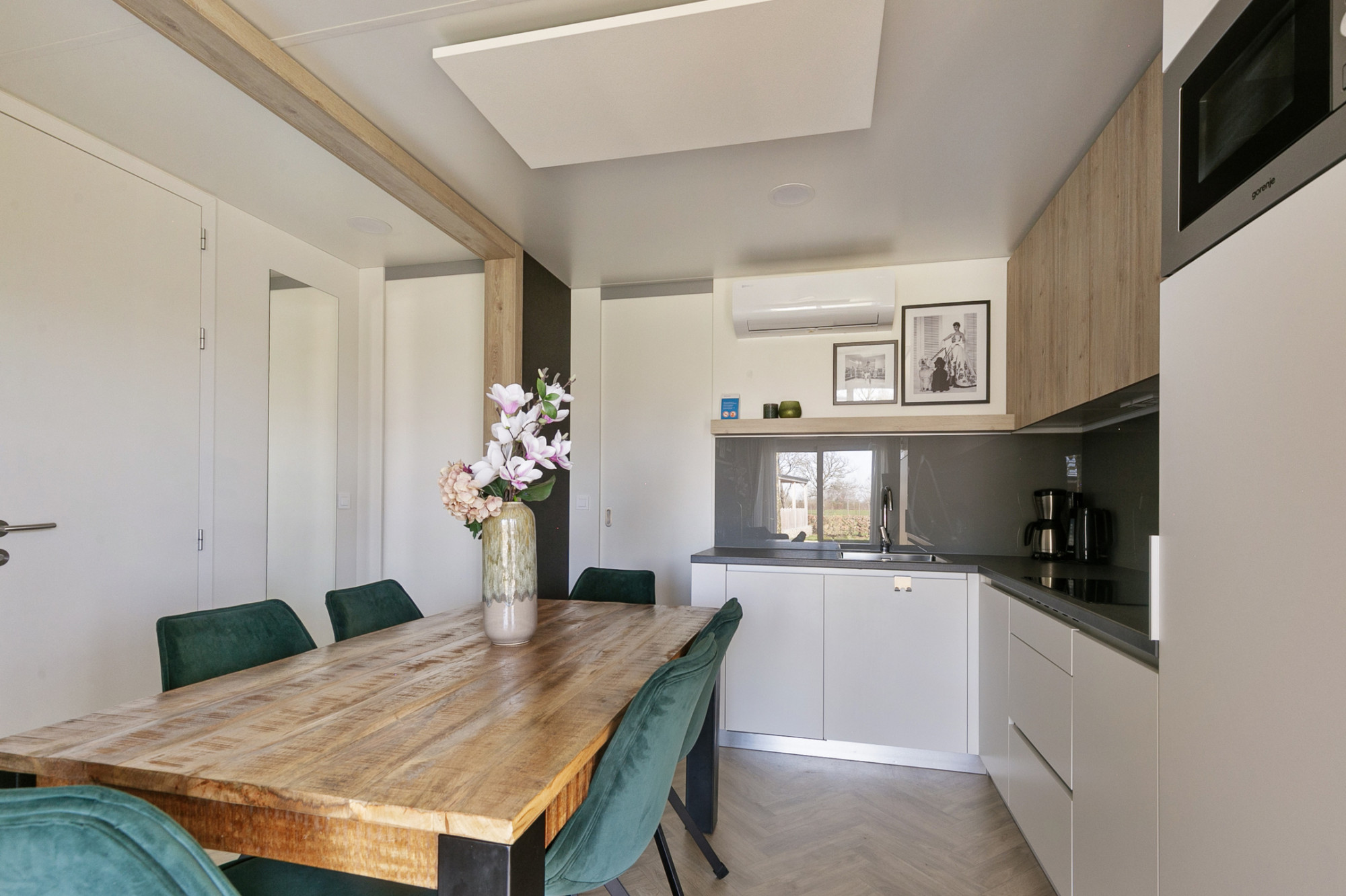 Via het half overdekte terras komt men via de schuifpui in de woonkamer met zithoek en open openkeuken die is voorzien van diverse inbouwapparatuur o.a. inductiekookplaat, afzuigkap, koelkast met vriesvak, vaatwasser en combimagnetron. De volledig geïsoleerde woning kan gekoeld worden via de airconditioning en verwarmd via de infraroodpanelen aan het plafond. Vlak bij de keuken ligt het gastentoilet met fonteintje en daarnaast ligt de mooie badkamer met inloopdouche, wastafel met meubel en zevend toilet. De woning heeft 3 slaapkamers: een tweepersoonsbed, 2 losse 1-perssonsbedden en een stapelbed. Op alle slaapkamers is voldoende kastruimte aanwezig.