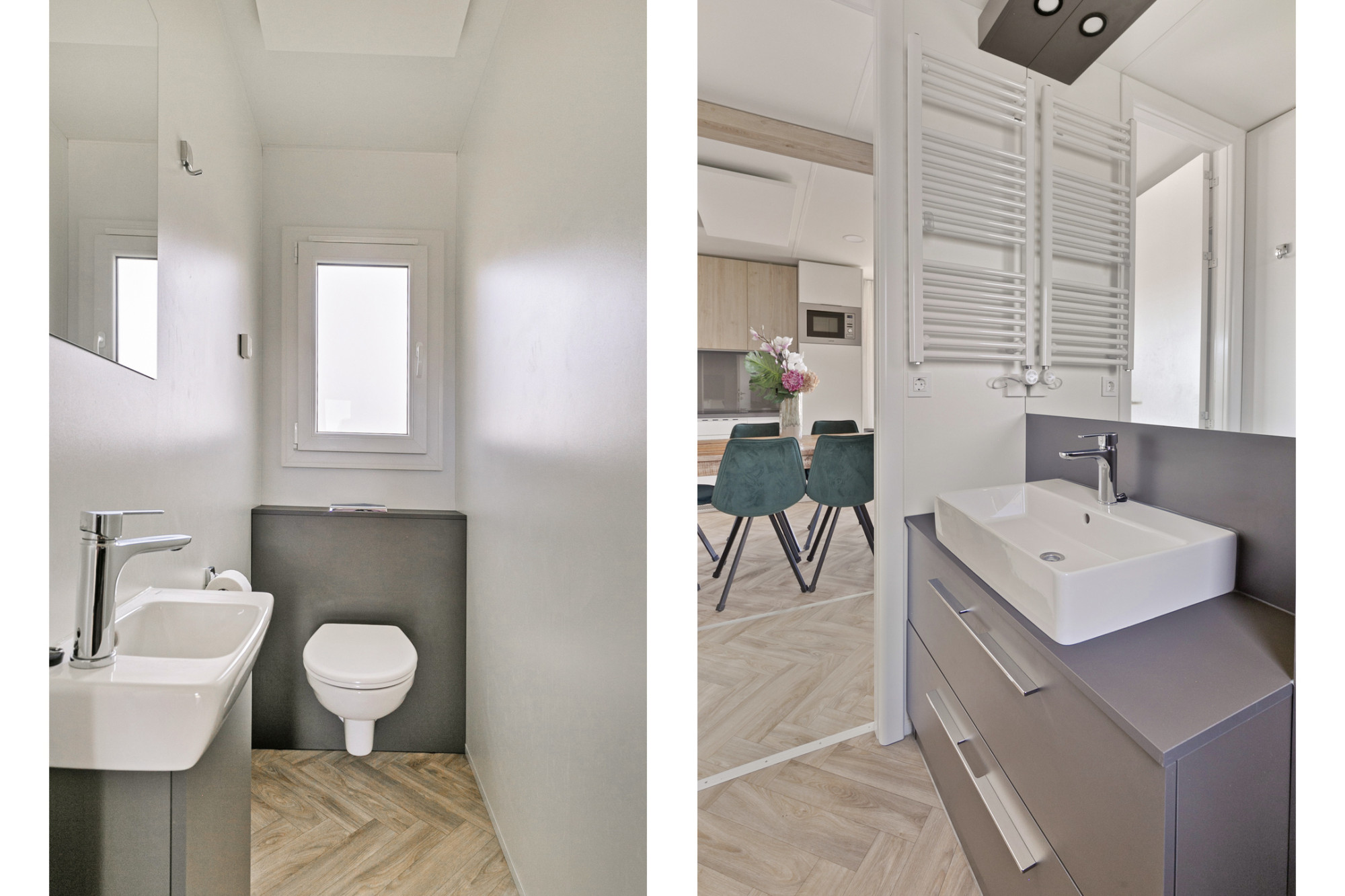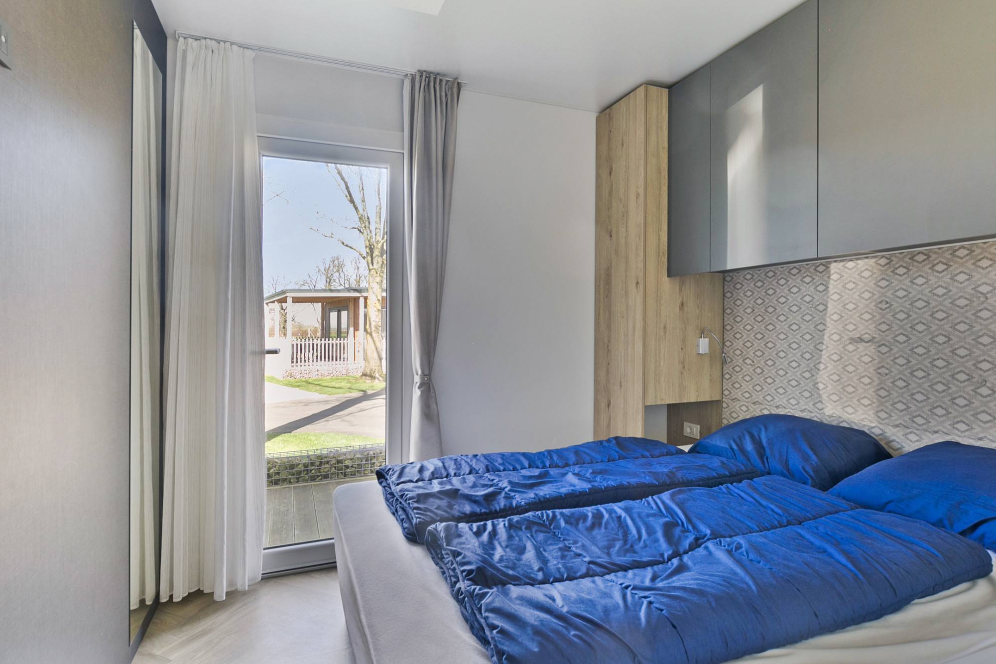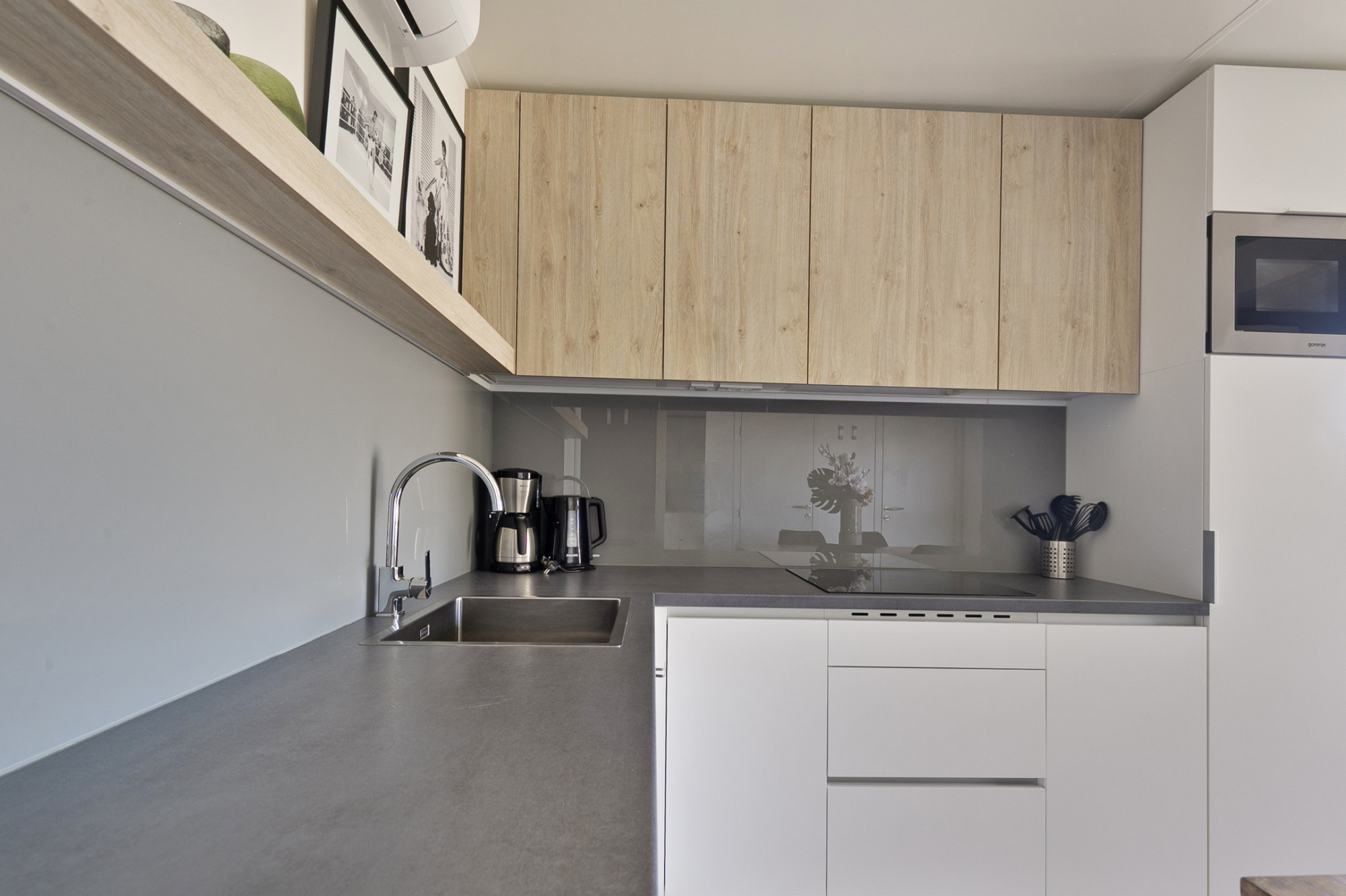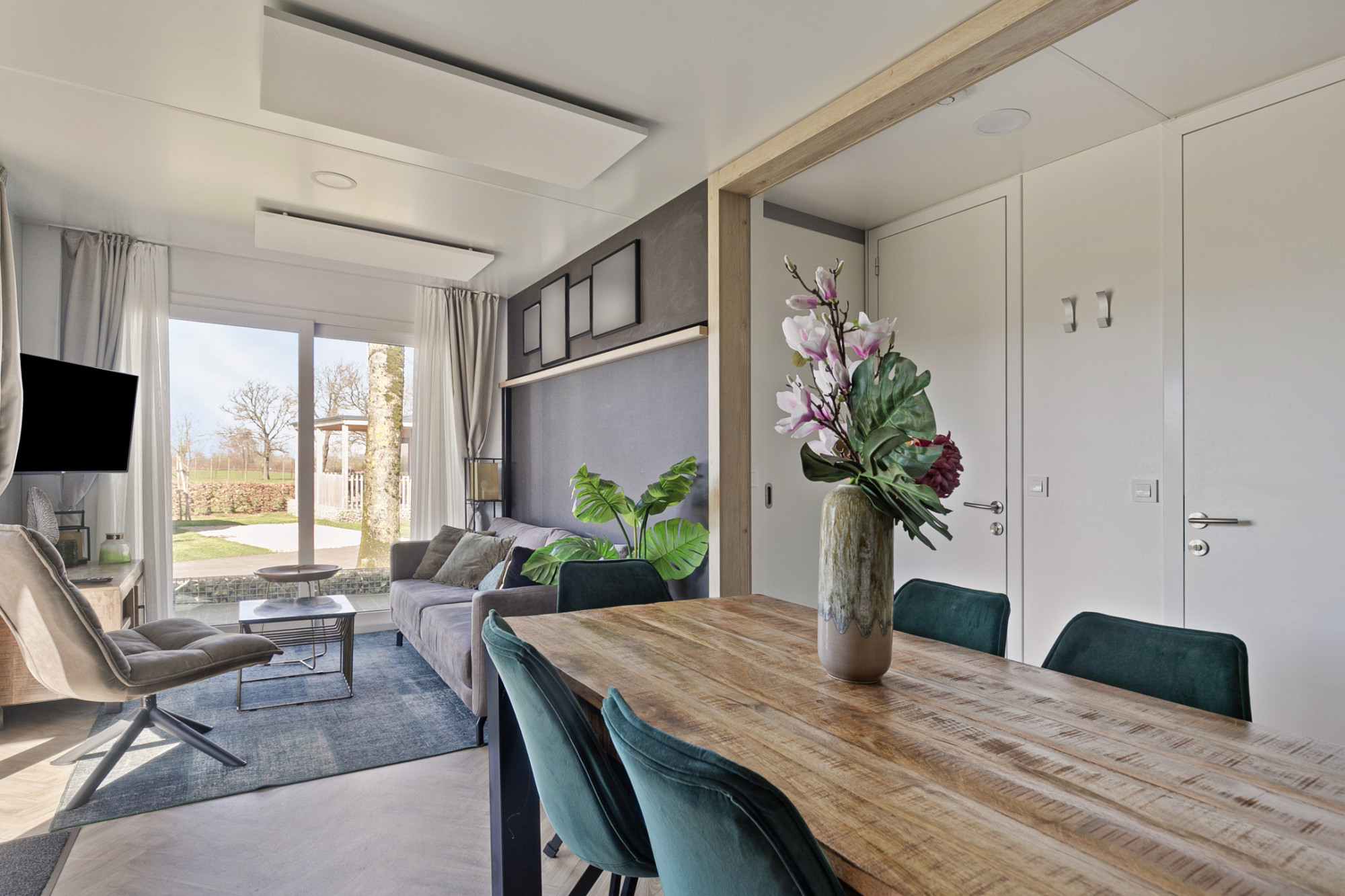 Via het half overdekte terras komt men via de schuifpui in de woonkamer met zithoek en open openkeuken die is voorzien van diverse inbouwapparatuur o.a. inductiekookplaat, afzuigkap, koelkast met vriesvak, vaatwasser en combimagnetron. De volledig geïsoleerde woning kan gekoeld worden via de airconditioning en verwarmd via de infraroodpanelen aan het plafond. Vlak bij de keuken ligt het gastentoilet met fonteintje en daarnaast ligt de mooie badkamer met inloopdouche, wastafel met meubel en zevend toilet. De woning heeft 3 slaapkamers: een tweepersoonsbed, 2 losse 1-perssonsbedden en een stapelbed. Op alle slaapkamers is voldoende kastruimte aanwezig.