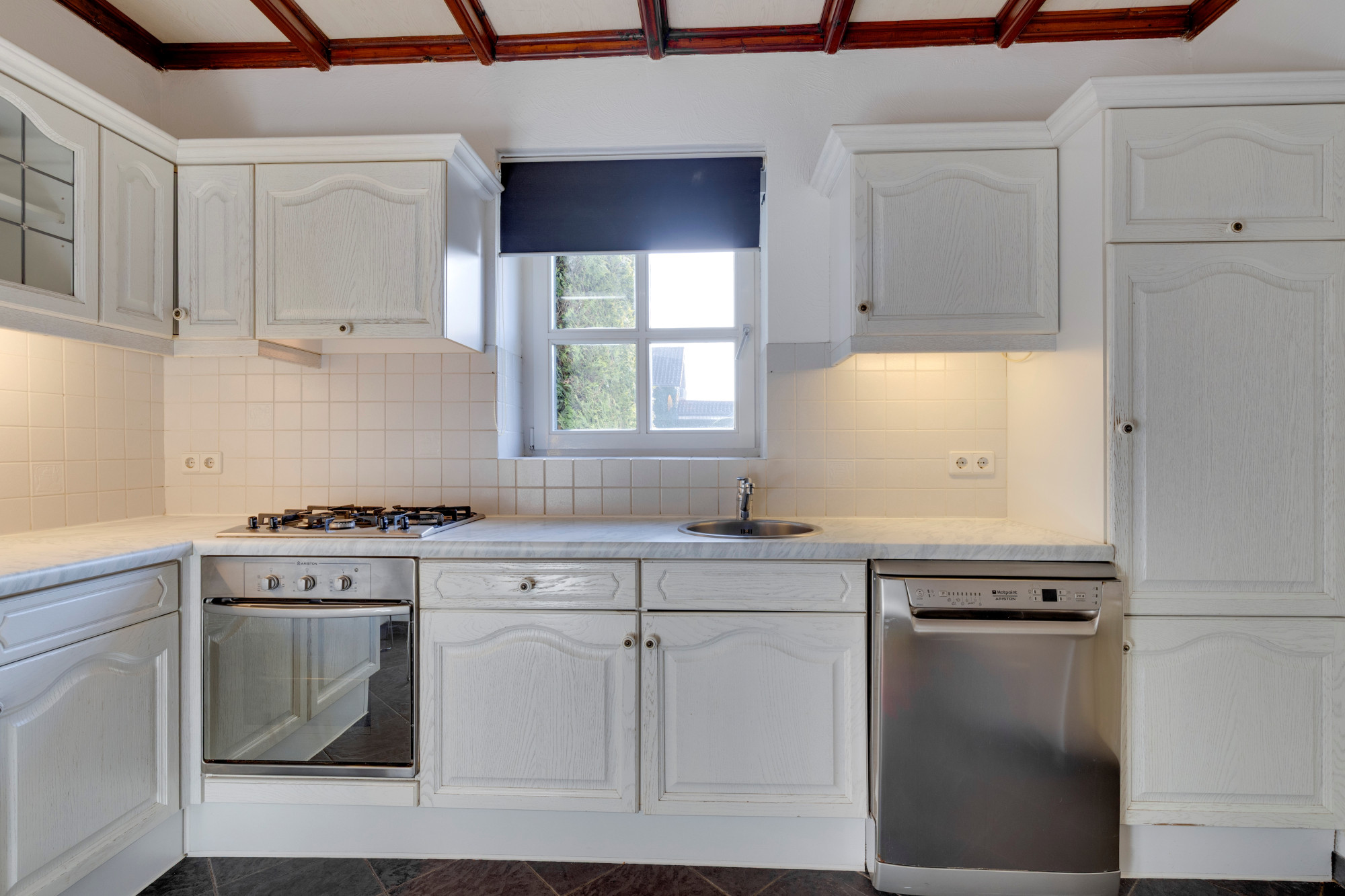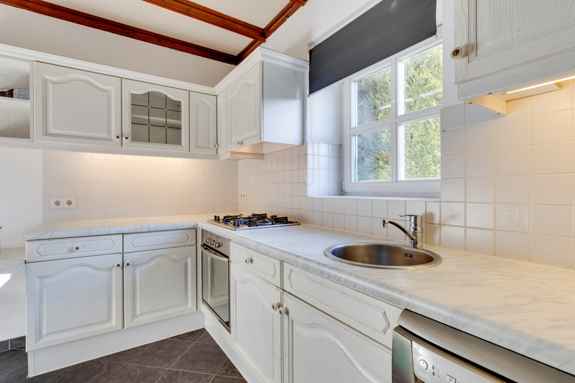 Dichte keuken v.v. tegelvloer en aanbouwinstallatie incl. koelkast, gaskookplaat, wasemkap, oven en vaatwasser.