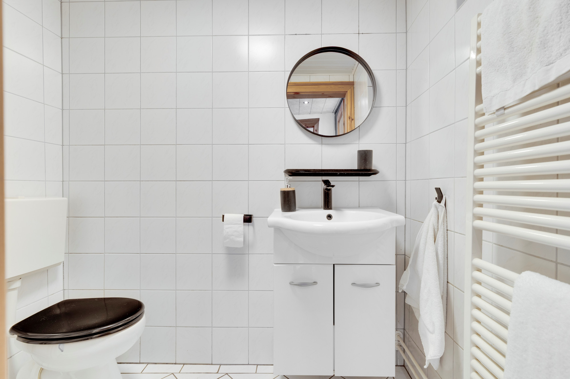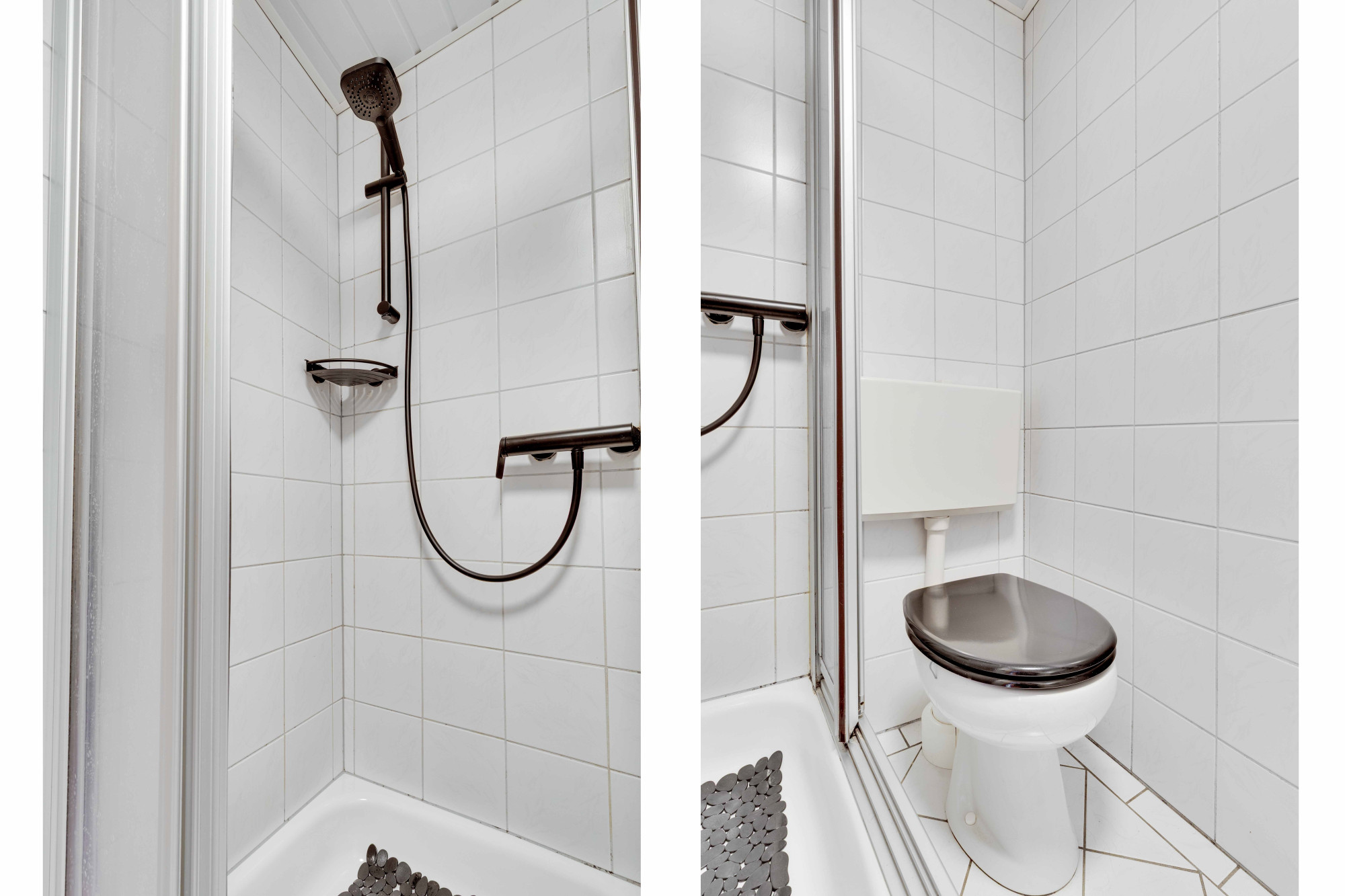Geheel betegelde badkamer v.v. douche, toilet en vaste wastafel met ombouw.