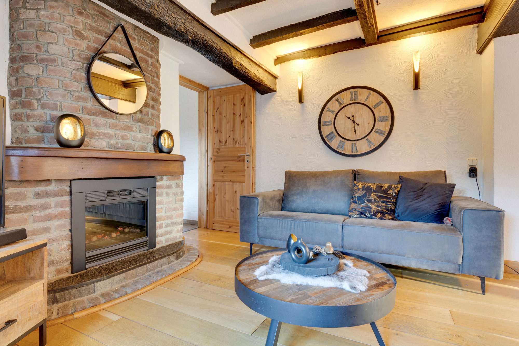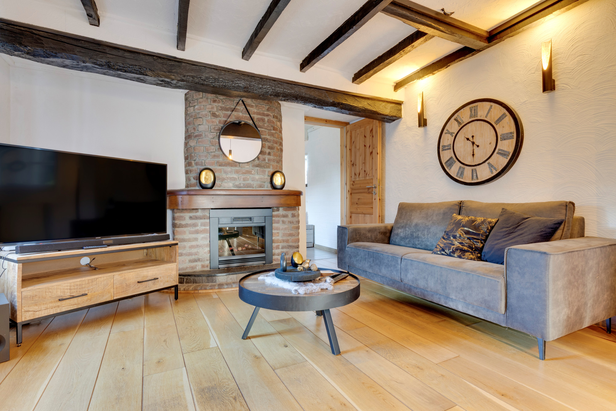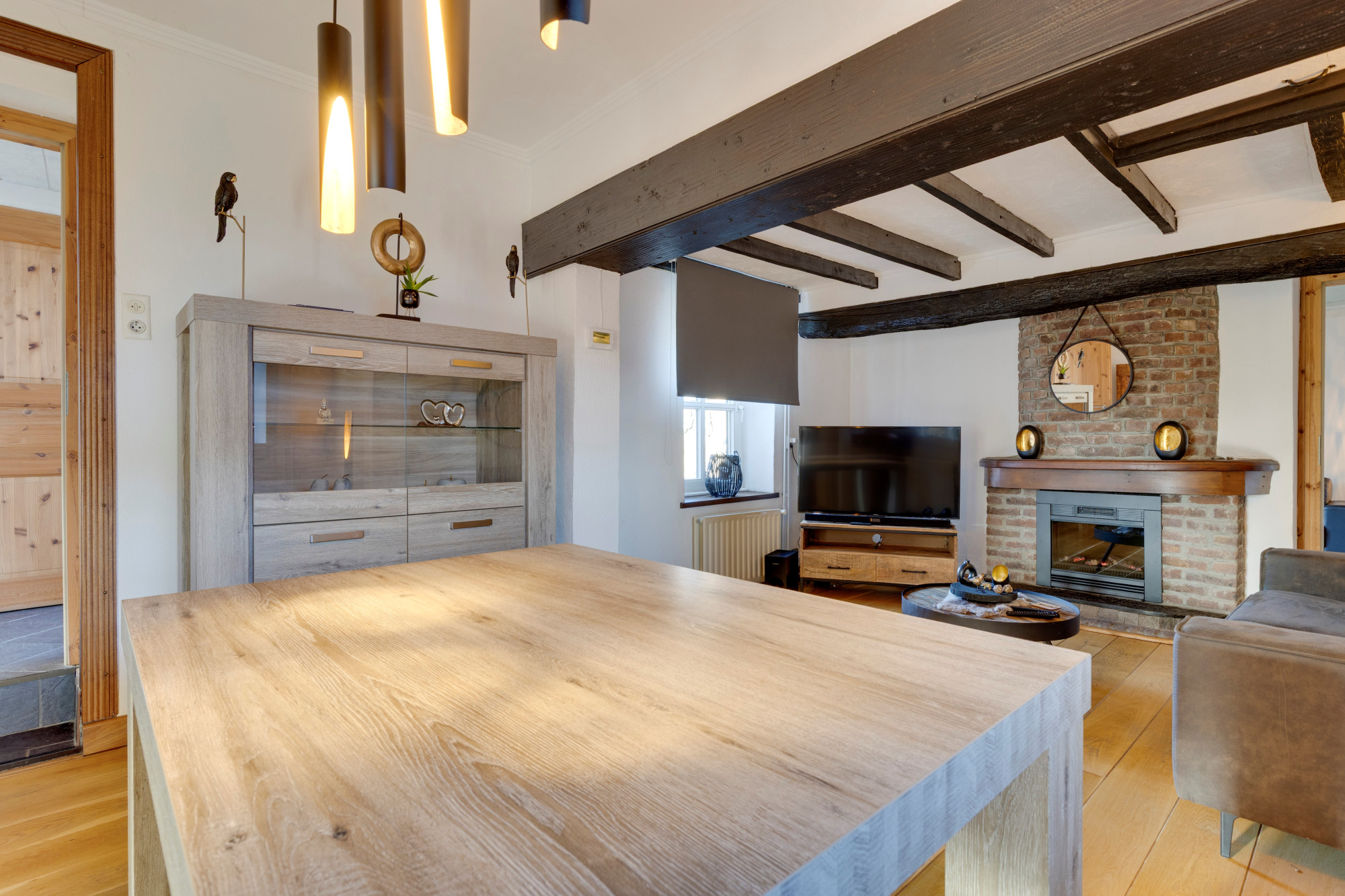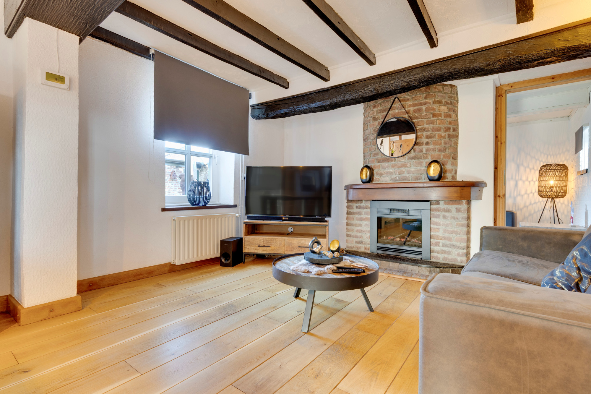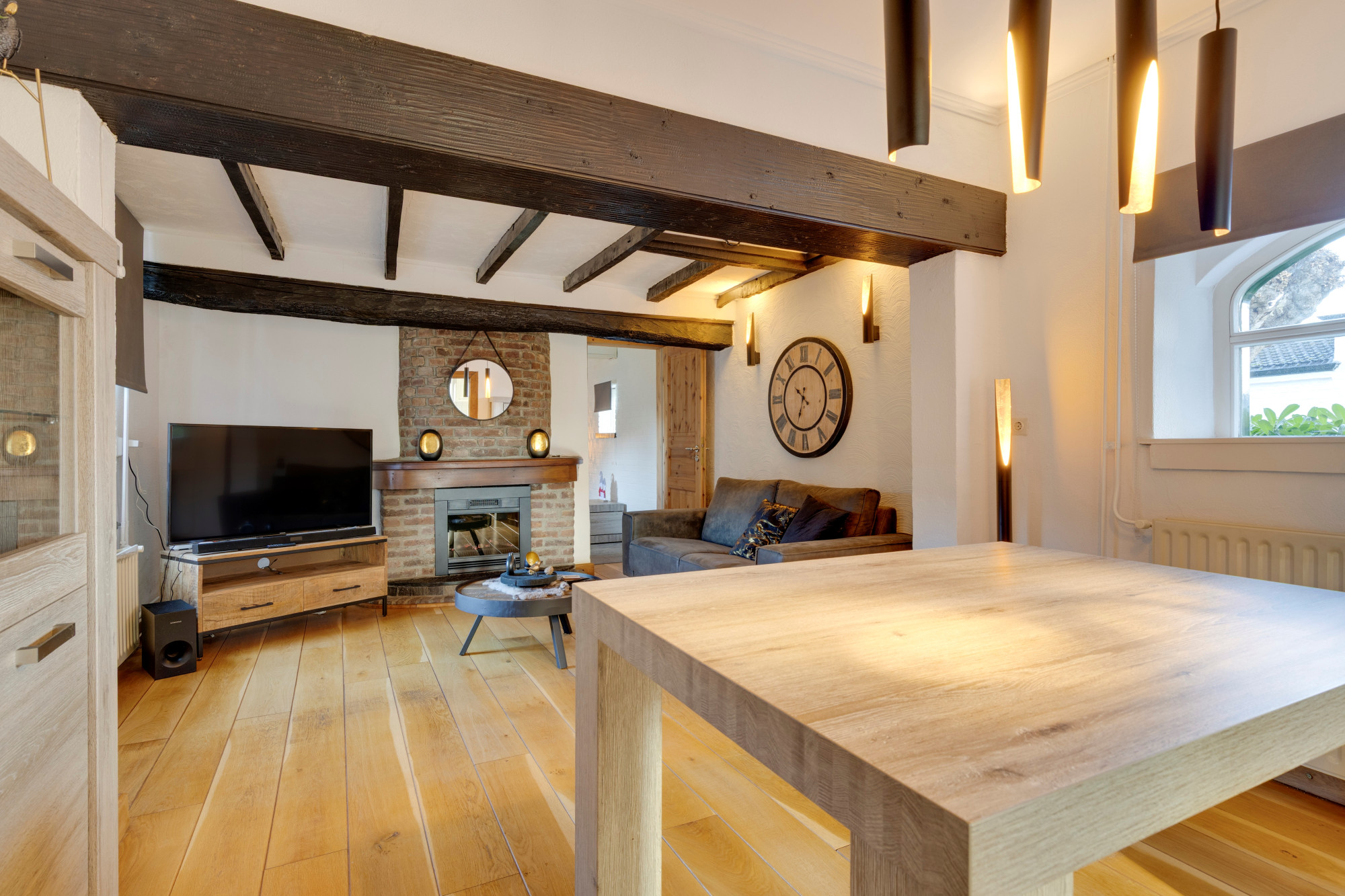 Woonkamer met fraaie eiken vloerdelen en haardpartij.