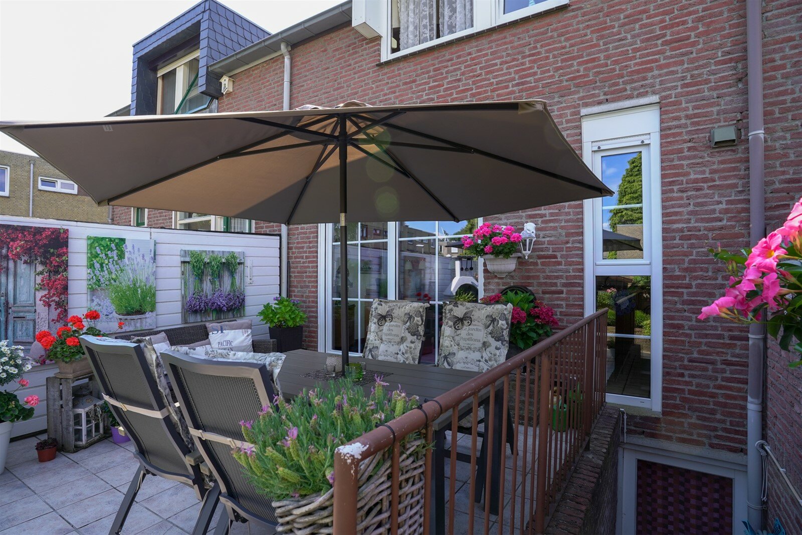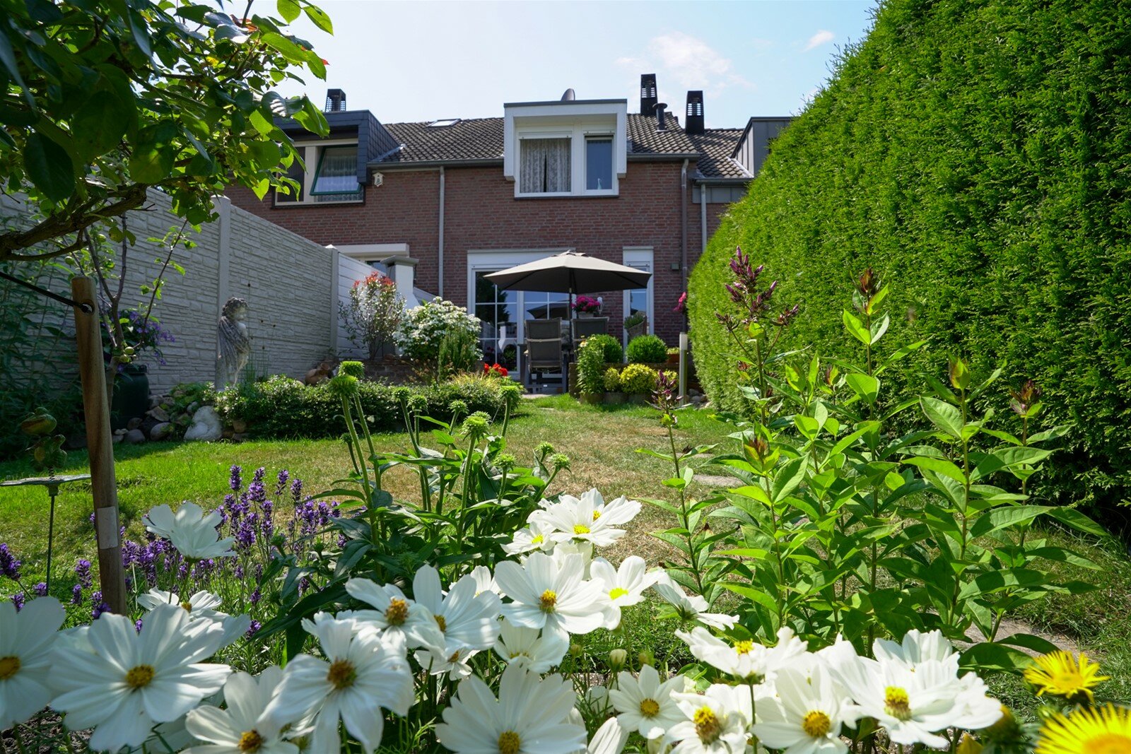 Fraaie achtertuin gelegen op het Oosten met terras en diverse beplanting. Achter in de tuin bevindt