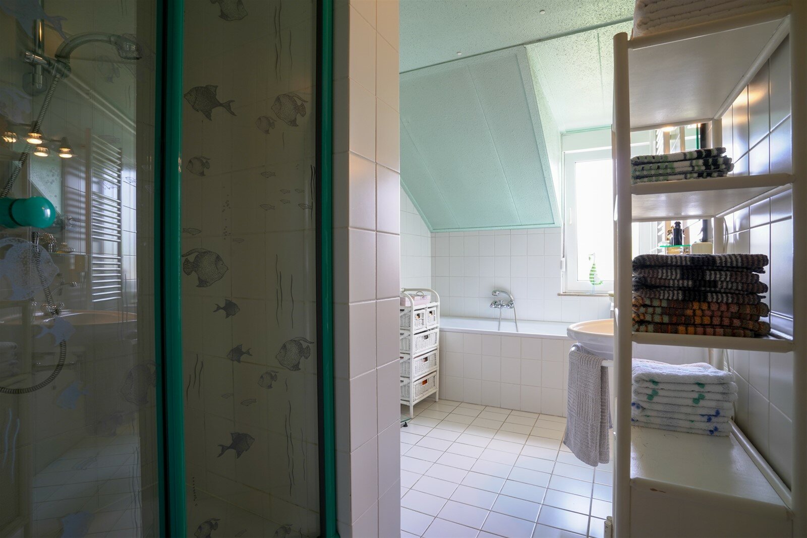 Nette neutrale badkamer(7,9m2)met douche, ligbad, wastafel en tweede toilet.