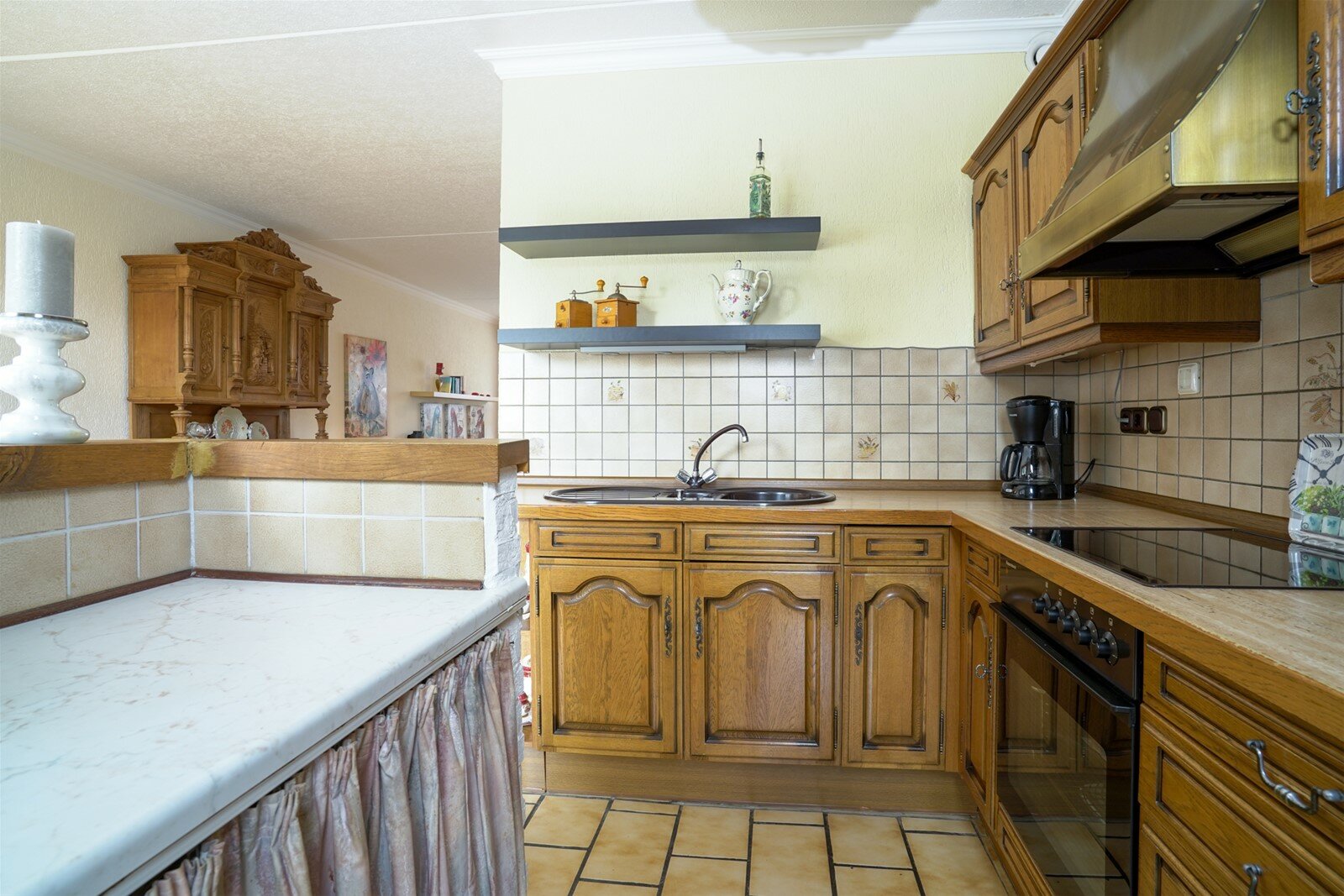 eikenhouten inbouwkeuken voorzien van keramische kookplaat, oven, koelkast en afzuigkap. De tuin