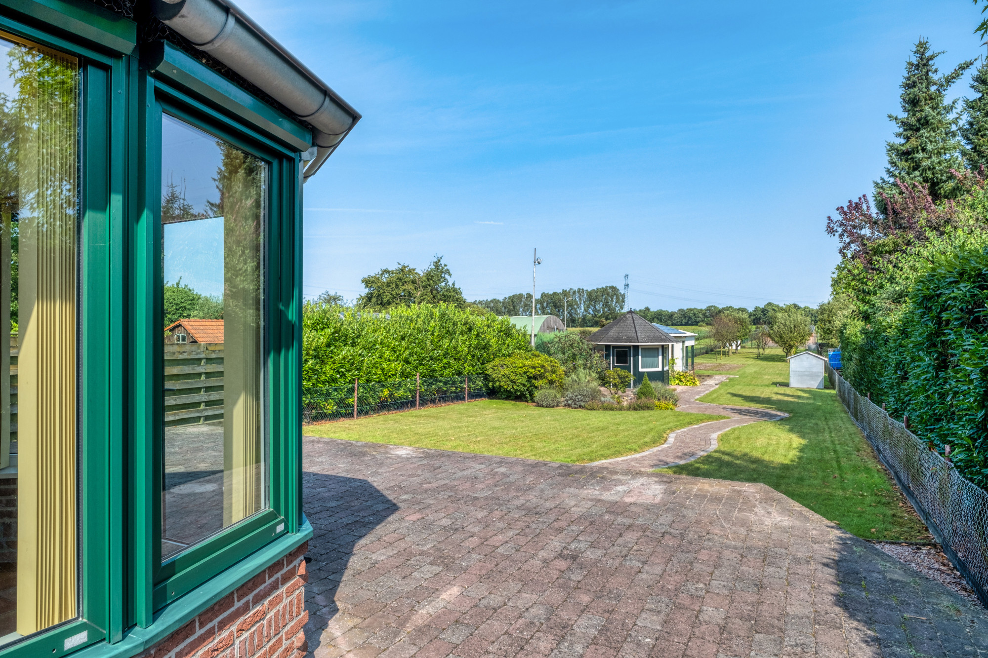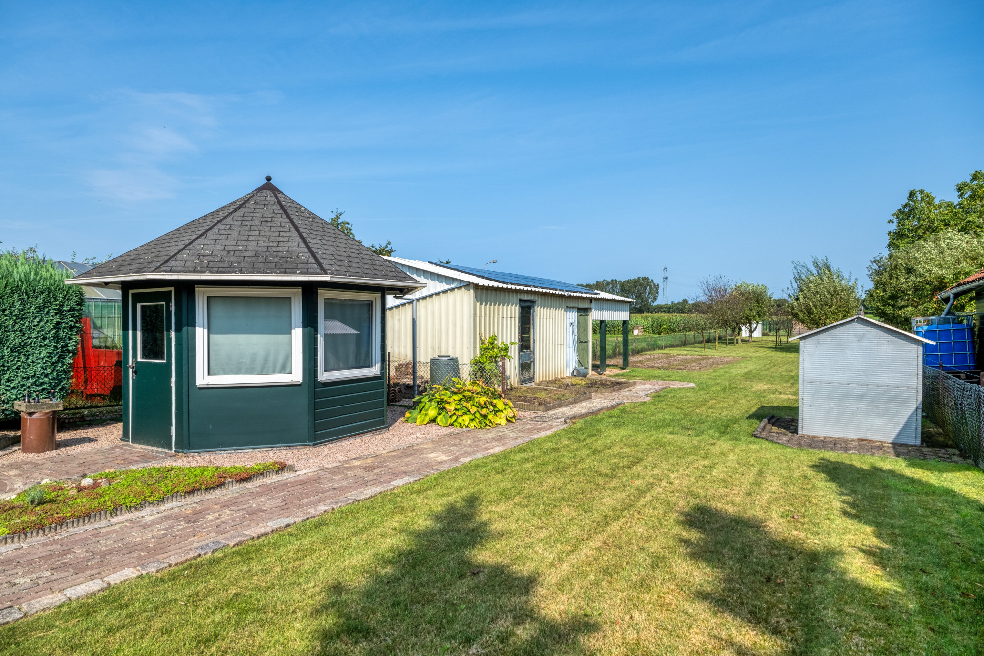 De woning beschikt over een diepe, op het oosten gelegen tuin die rust en privacy biedt. Het uitgestrekte gazon nodigt uit tot ontspanning en spel, terwijl de twee vrijstaande houten bergingen praktische opslagruimte bieden voor tuinbenodigdheden en meer. Met vrij uitzicht en veel privacy is deze tuin een ware oase waar u optimaal kunt genieten van uw buitenruimte.