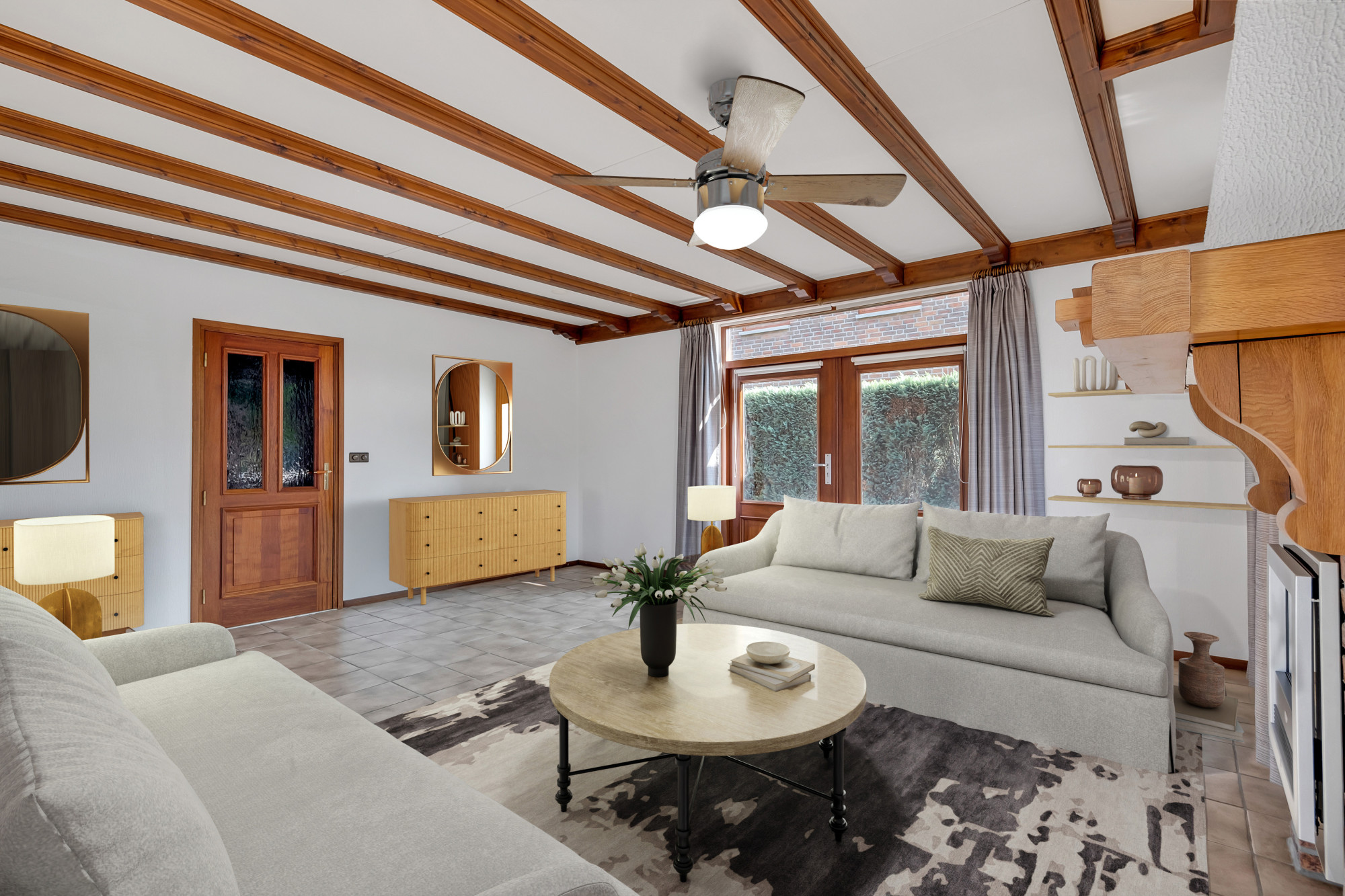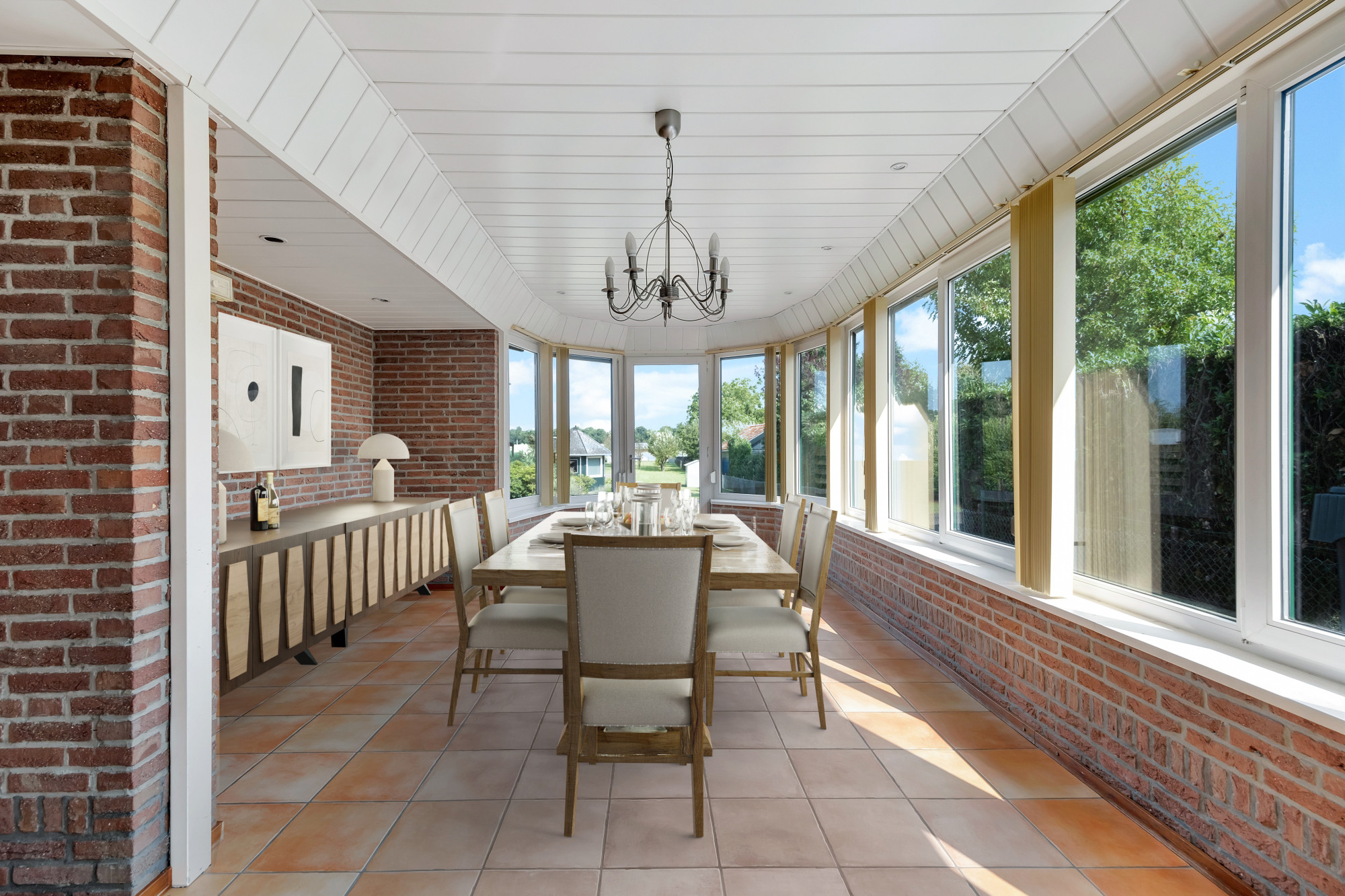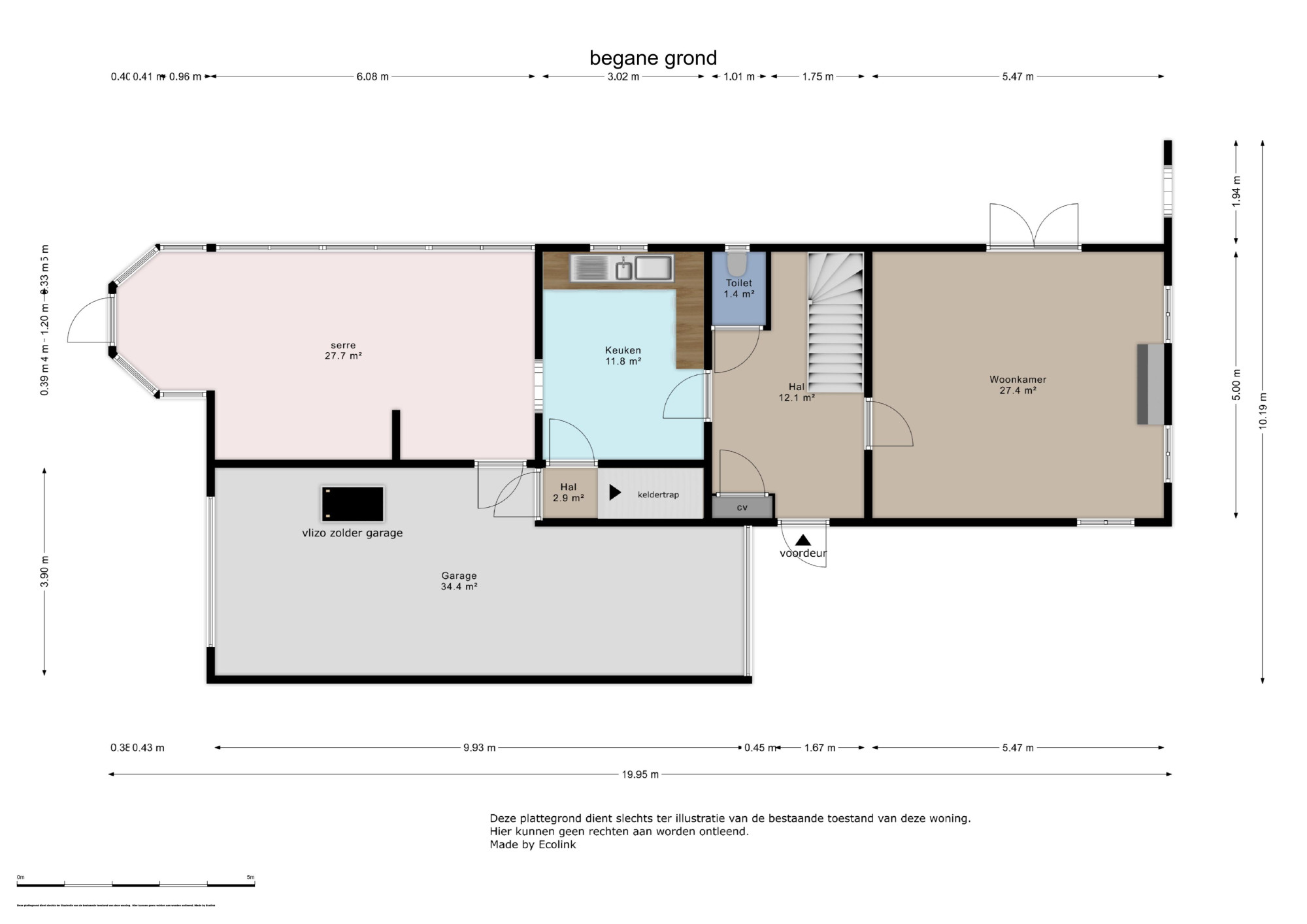 Bij binnenkomst op de begane grond wordt u verwelkomd in een ruime hal die toegang biedt tot de living, keuken, meterkast, opgang naar de verdieping en de separate toiletruimte. De woonkamer, met een royale oppervlakte van 27,4 m², is licht en ruim opgezet, met openslaande deuren naar een leuk terras met veel privacy. De keuken van 11,8 m² is praktisch ingericht en grenst direct aan de royale tuinkamer van 27,7 m², die een prachtige plek biedt om te ontspannen met uitzicht op de tuin. Verder vindt u op deze verdieping een handige garage (met verdieping) van 34,4 m².