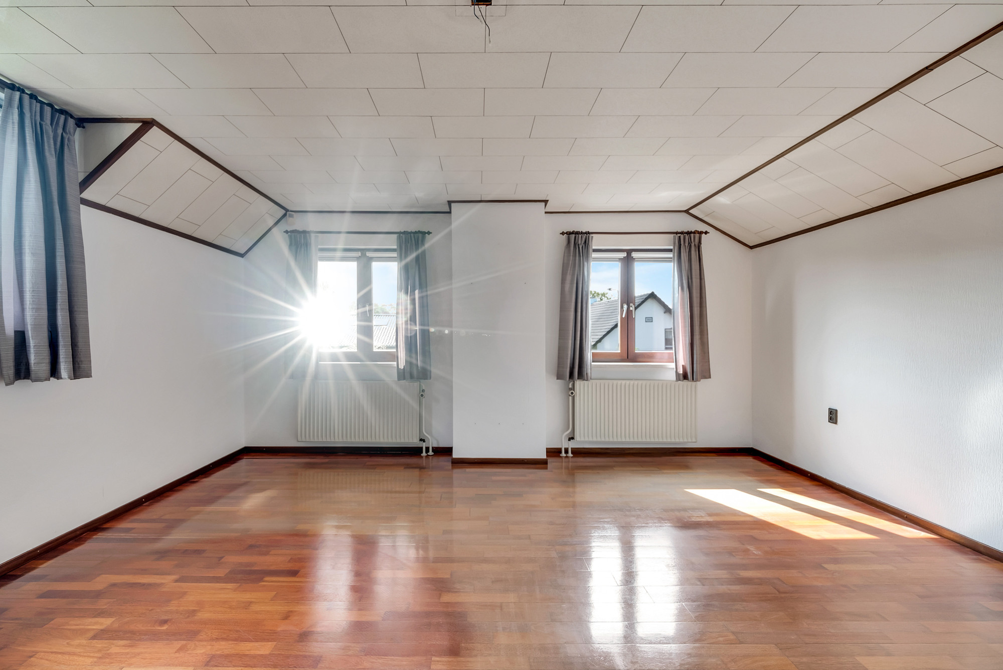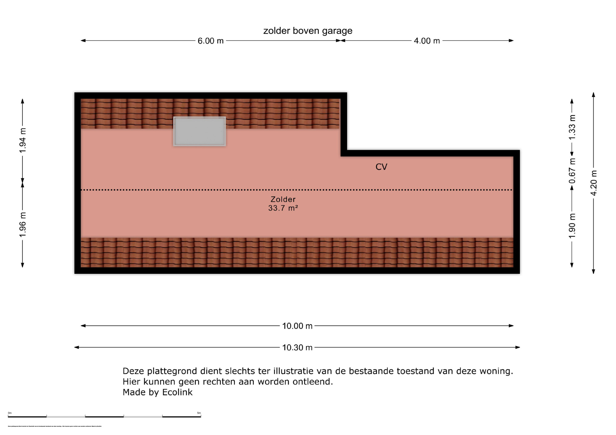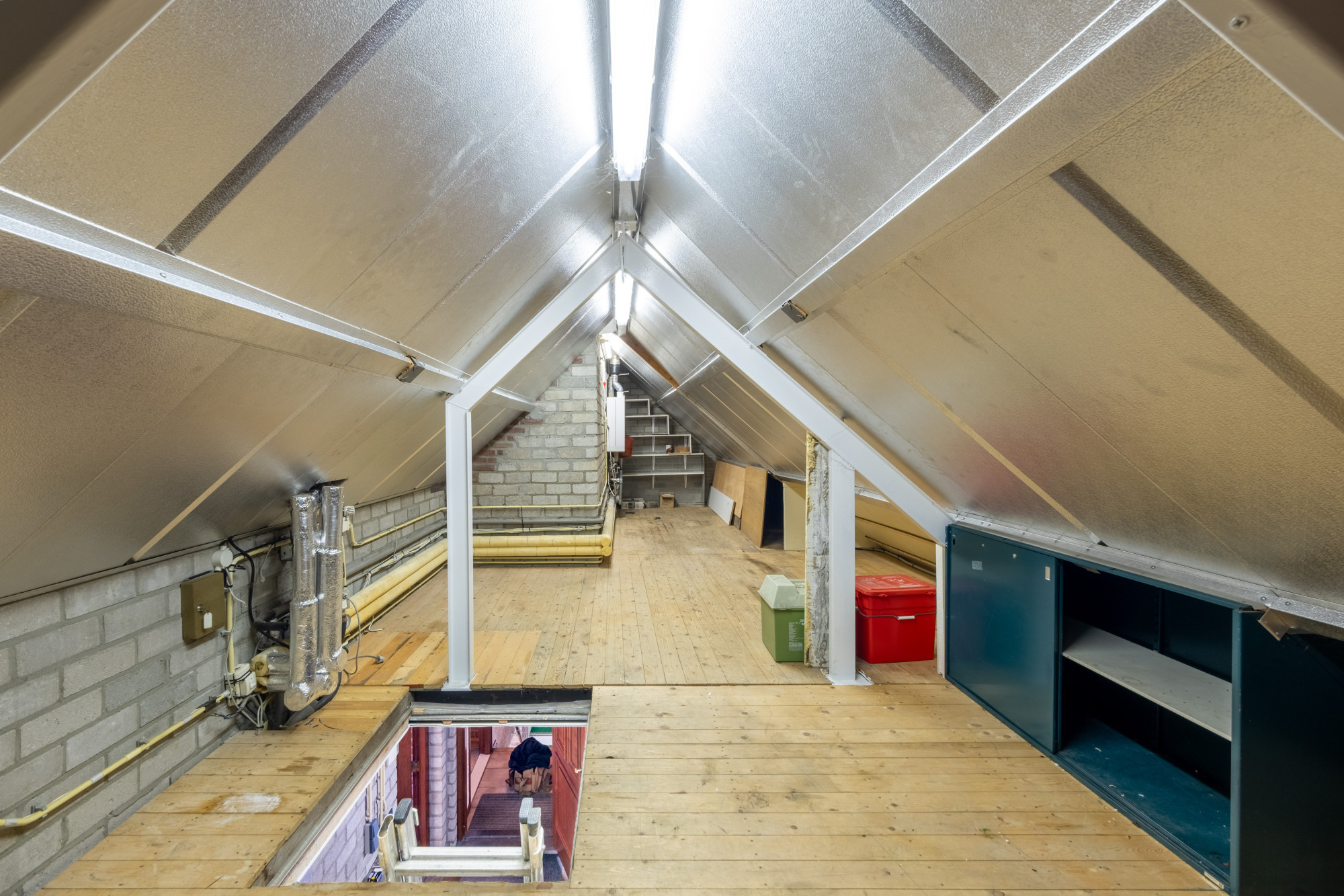 De zolder boven de garage biedt diverse mogelijkheden en heeft een oppervlakte van 33,7 m². Dit ruime vertrek kan eenvoudig worden omgetoverd tot een extra slaapkamer, kantoor of een speelkamer voor de kinderen. De zolder biedt tevens voldoende bergruimte en herbergt de cv-installatie (Intergas HRE, 2010, eigendom), die gemakkelijk toegankelijk is.