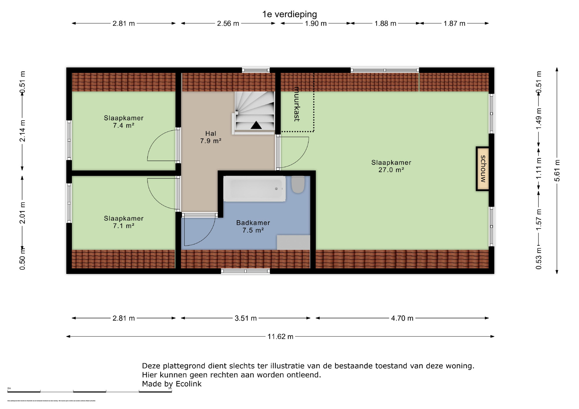 Op de eerste verdieping bevinden zich drie comfortabele slaapkamers. De grootste slaapkamer, met een oppervlakte van 27 m², biedt volop ruimte voor een kingsize bed en een zithoek. De twee andere slaapkamers, elk circa 7 m² groot, zijn perfect voor kinderen of als thuiswerkplek. De badkamer van 7,5 m² is uitgerust met een ligbad, douche en wastafel, en biedt alles wat u nodig heeft voor uw dagelijkse routine.