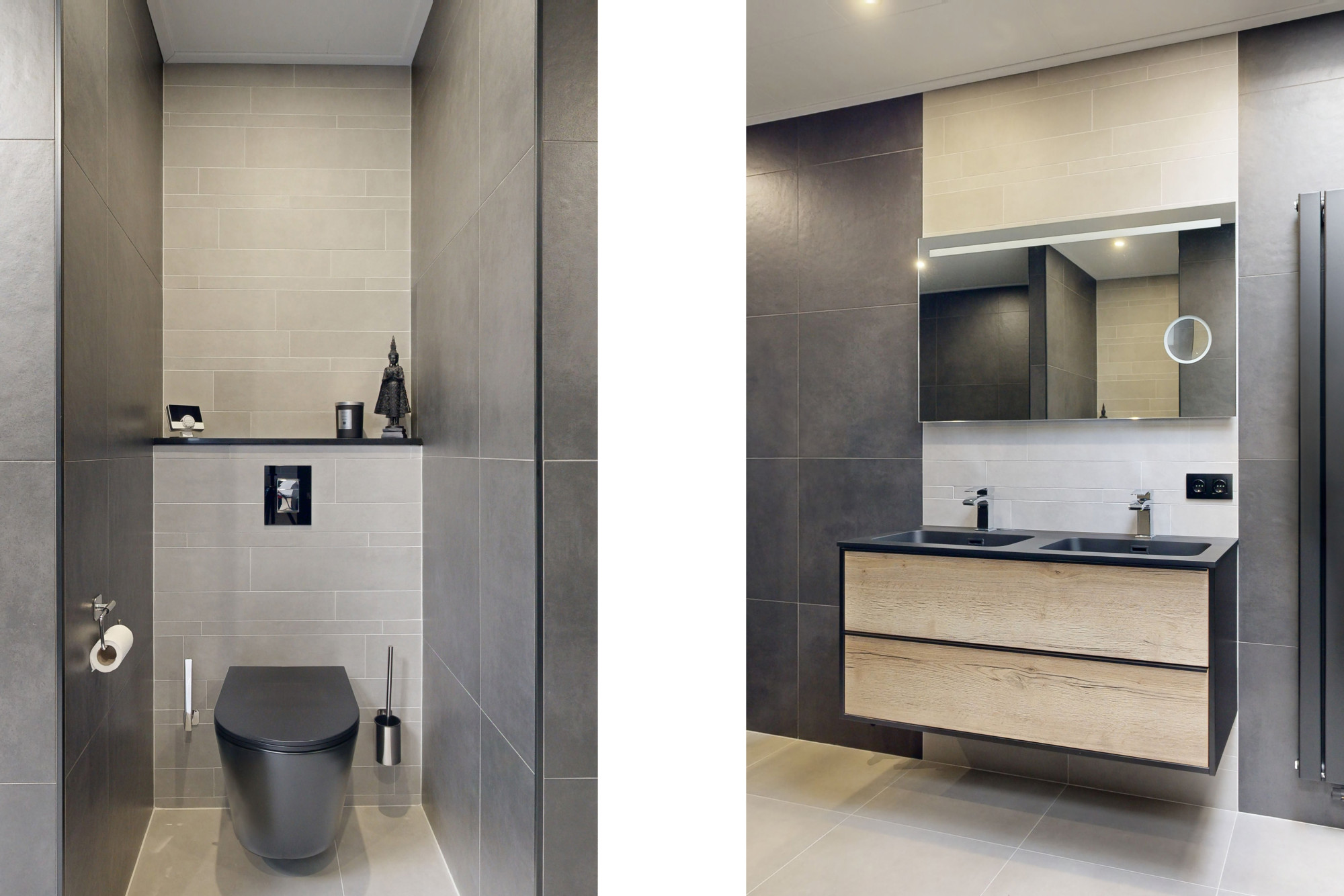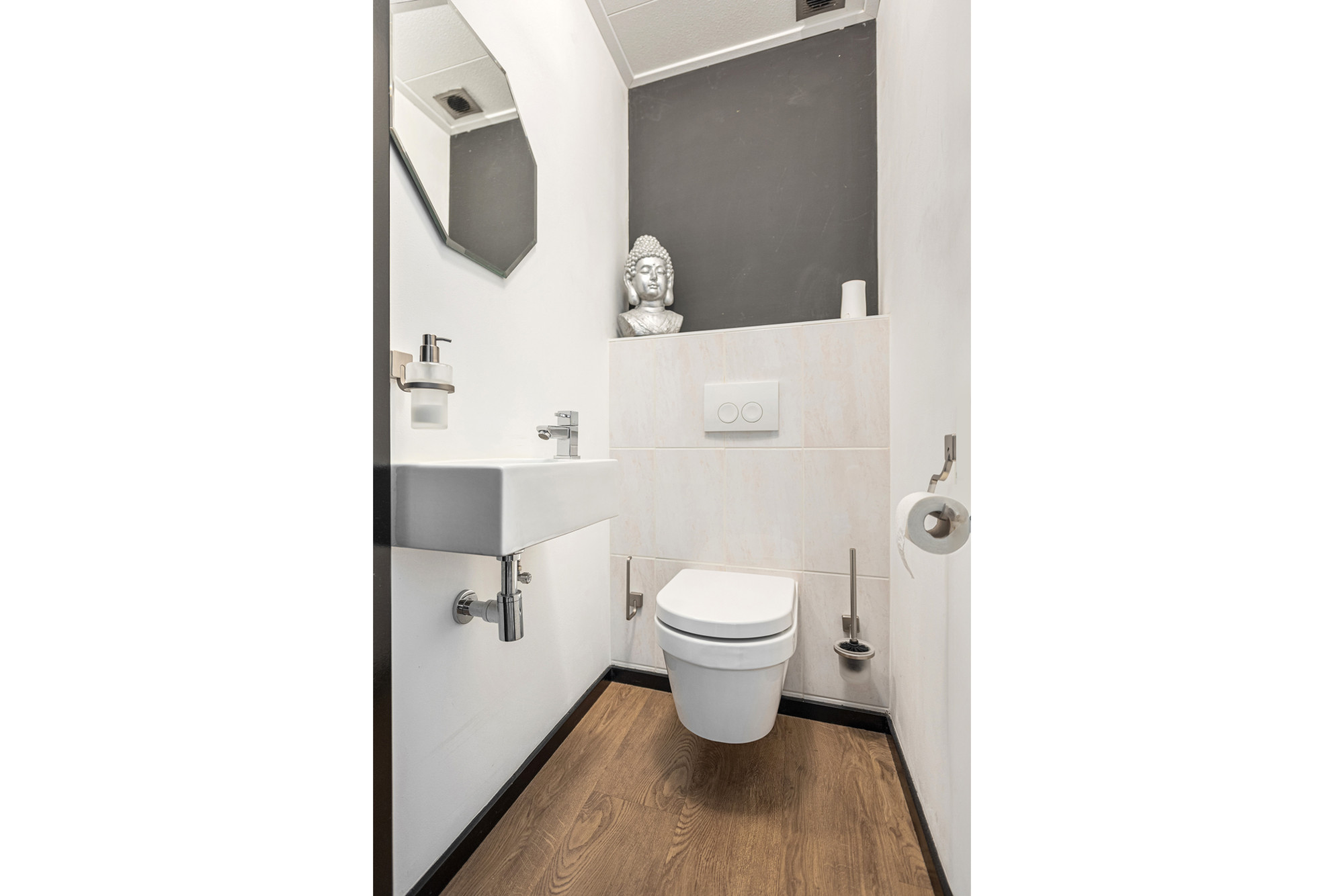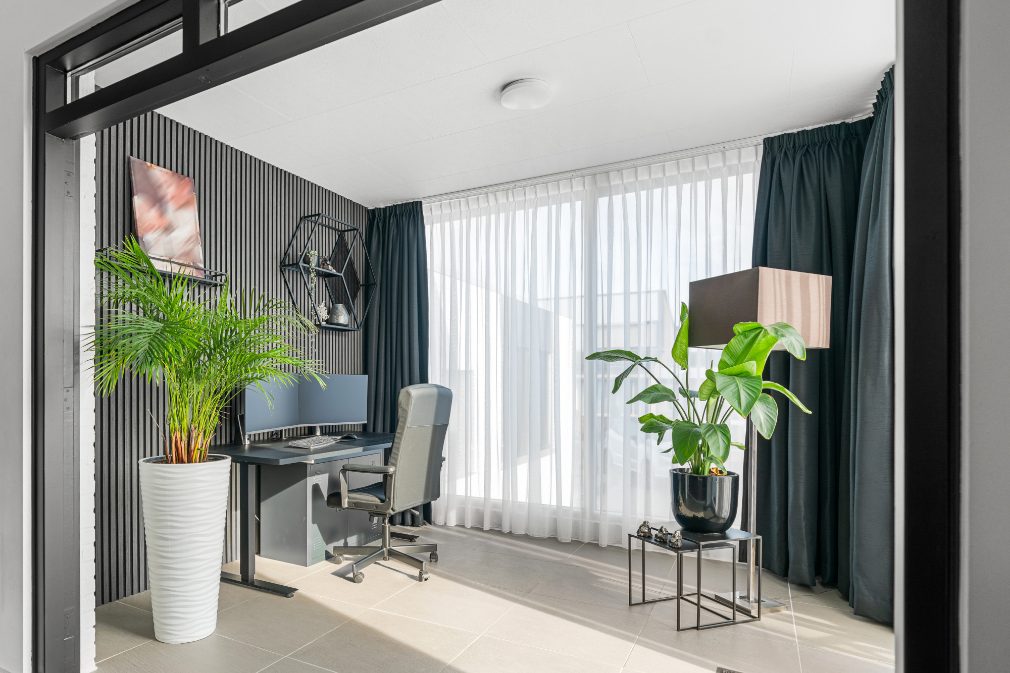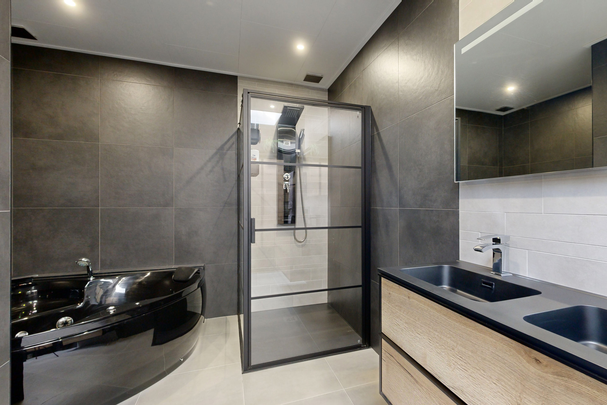 De badkamer op de begane grond is luxe uitgerust met een hoekligbad met jets, een zwevend closet, een douchecabine en een dubbel wastafelmeubel, wat zorgt voor comfort en ontspanning. Daarnaast is er een separate toiletruimte met een zwevend closet en fonteintje. De begane grond beschikt verder over twee riante slaapkamers, die naar wens in te richten zijn als master bedroom en extra slaapkamer. Aan de voorzijde van de woning bevindt zich een aparte kantoorruimte, ideaal voor thuiswerkers of als rustige studeerkamer.