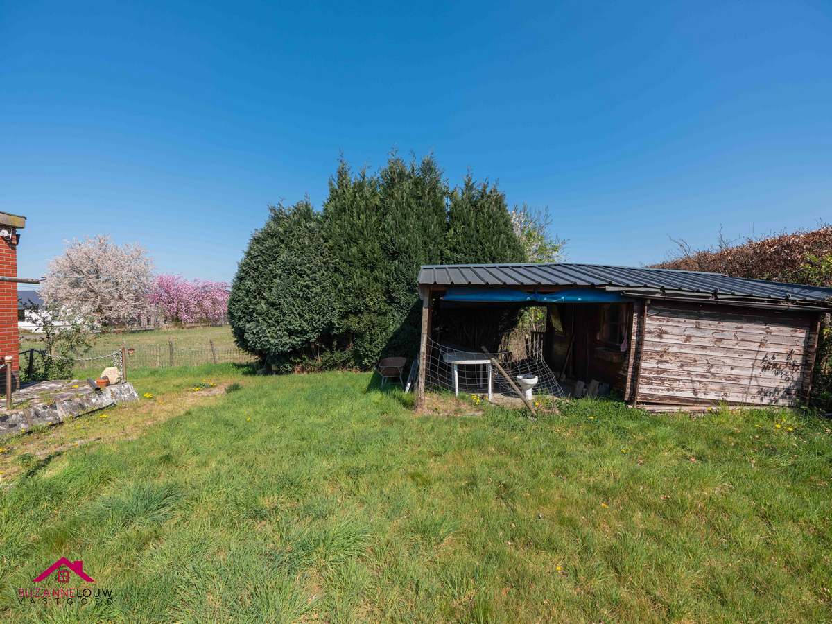 De tuin van de woning werd hoofdzakelijk aangelegd met gazon. Hier vinden we tevens nog een extra tuinberging terug.