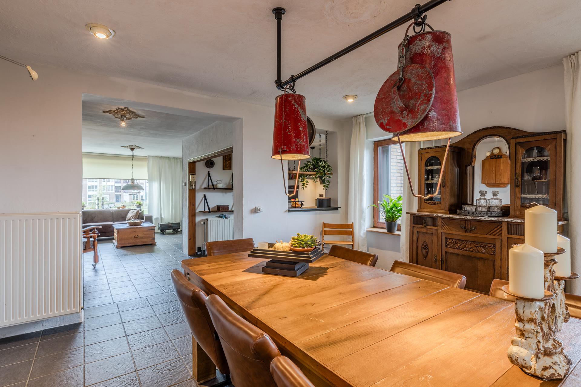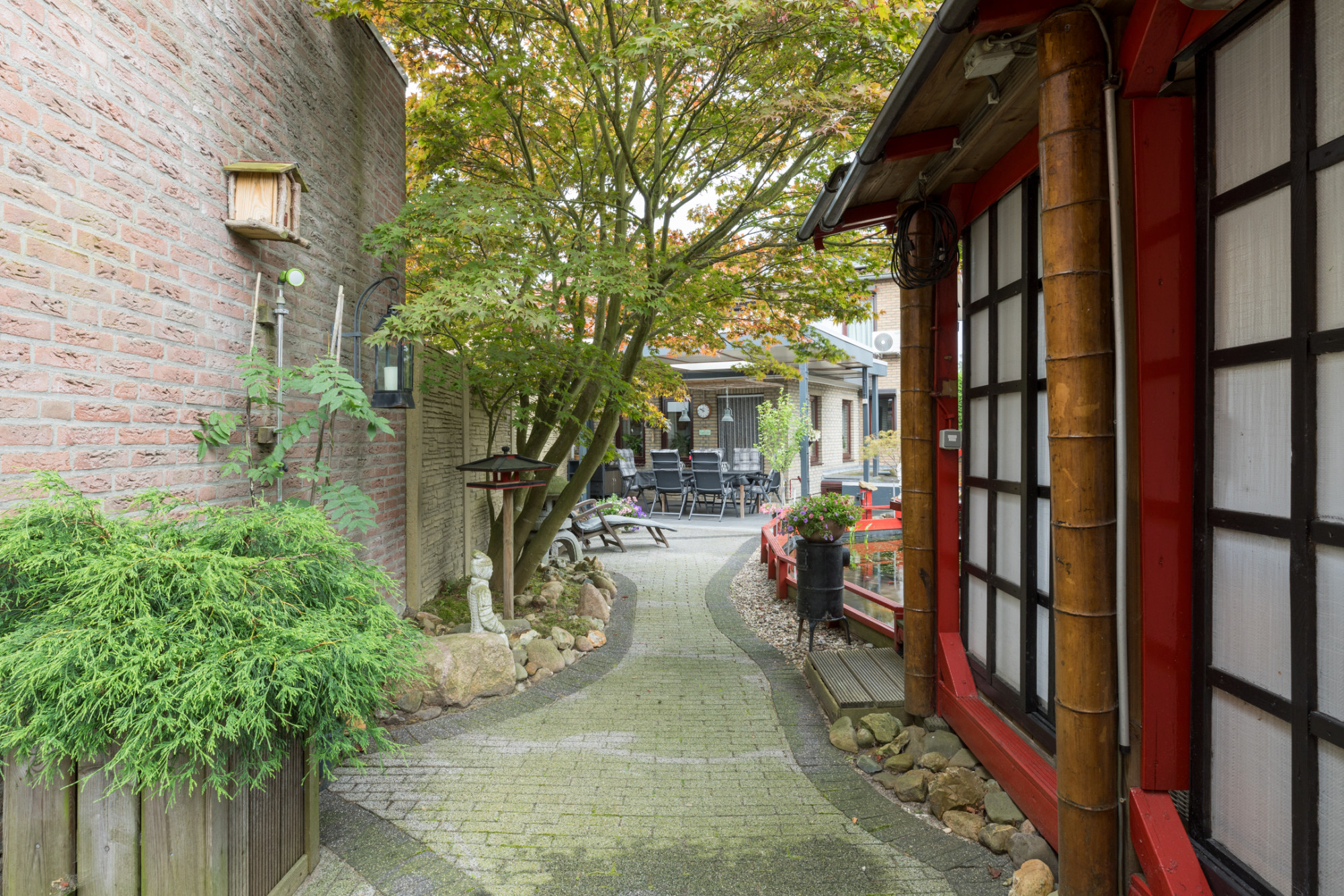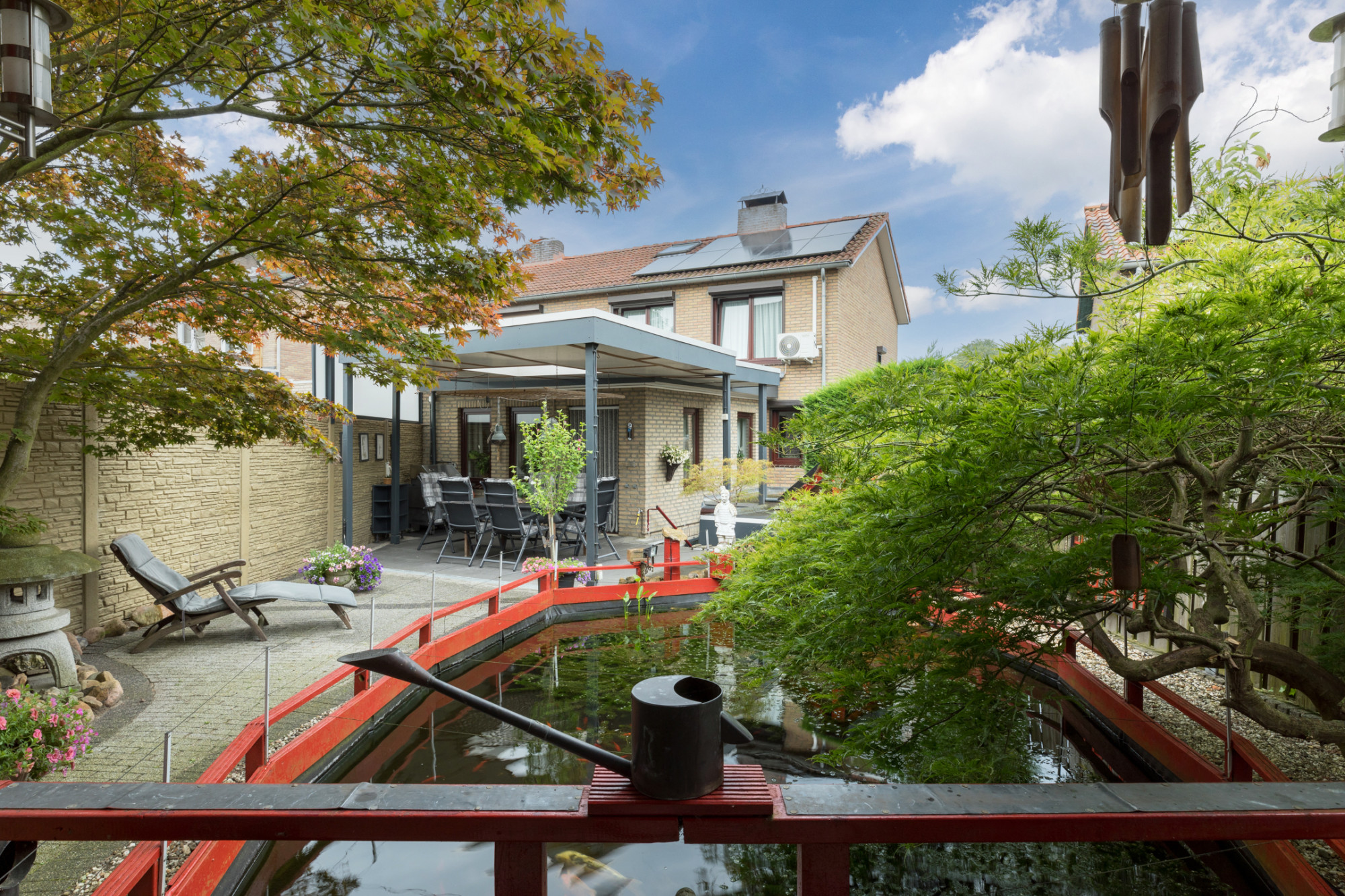 Goed onderhouden halfvrijstaande woning MET AANBOUW, terrasoverkapping, JAPANSE TUIN MET RELAXTERRAS AAN KOI-VIJVER GELEGEN, garage en volledige onderkeldering.