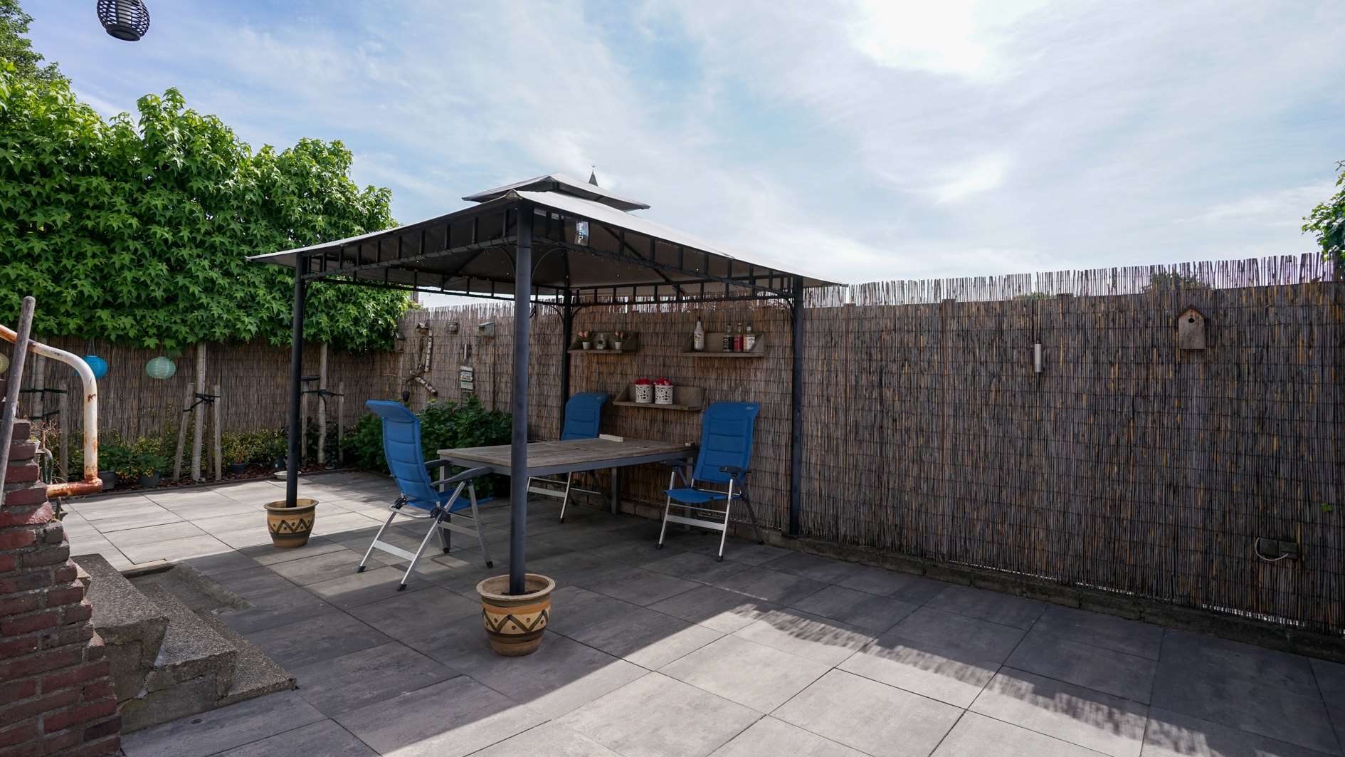 Geheel omheinde en bestrate achtertuin (13 x 4 m) met een achterom ingang.
