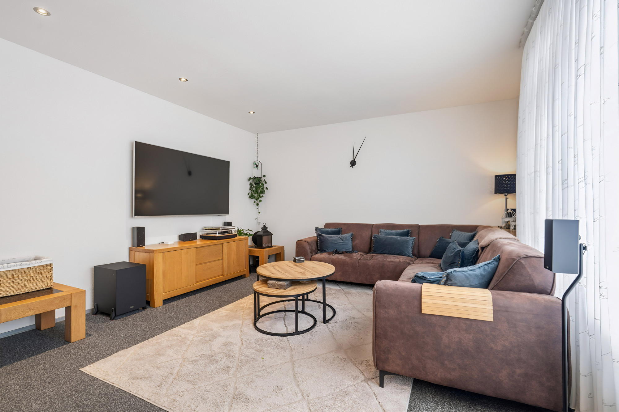 De woonkamer is een fijne open ruimte met zit- en eetgedeelte, veel lichtinval en toegang tot de tuin. De grindvloer met spotverlichting geeft de begane grond een moderne uitstraling.